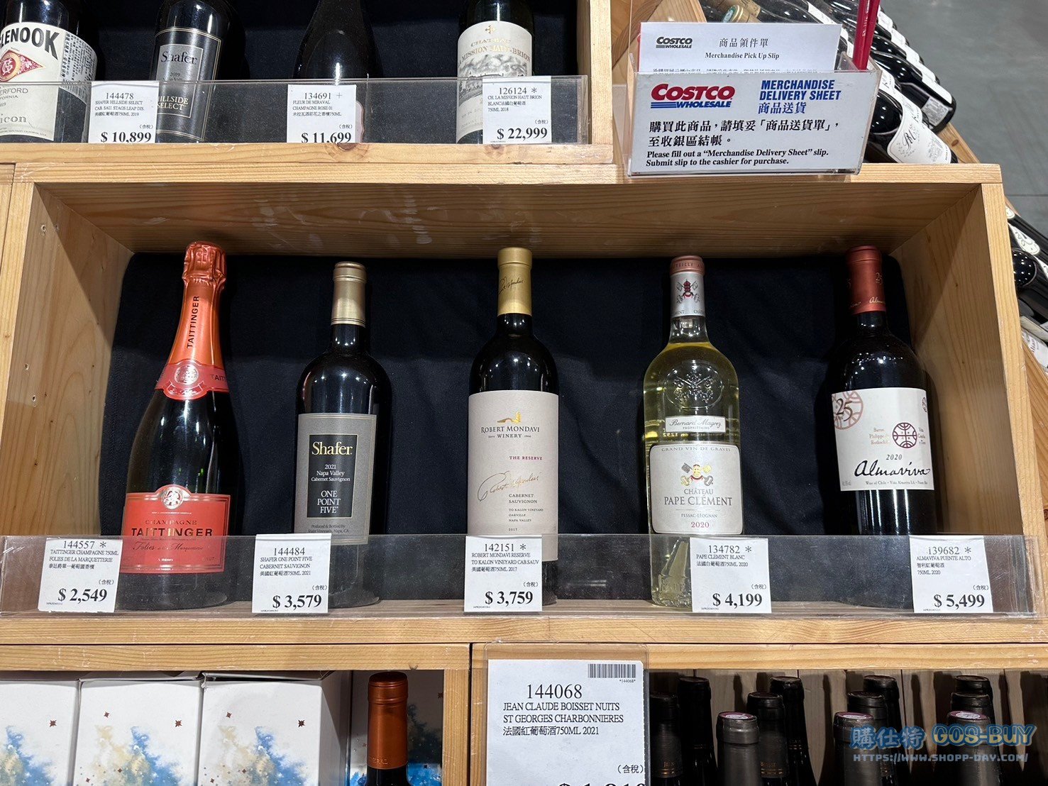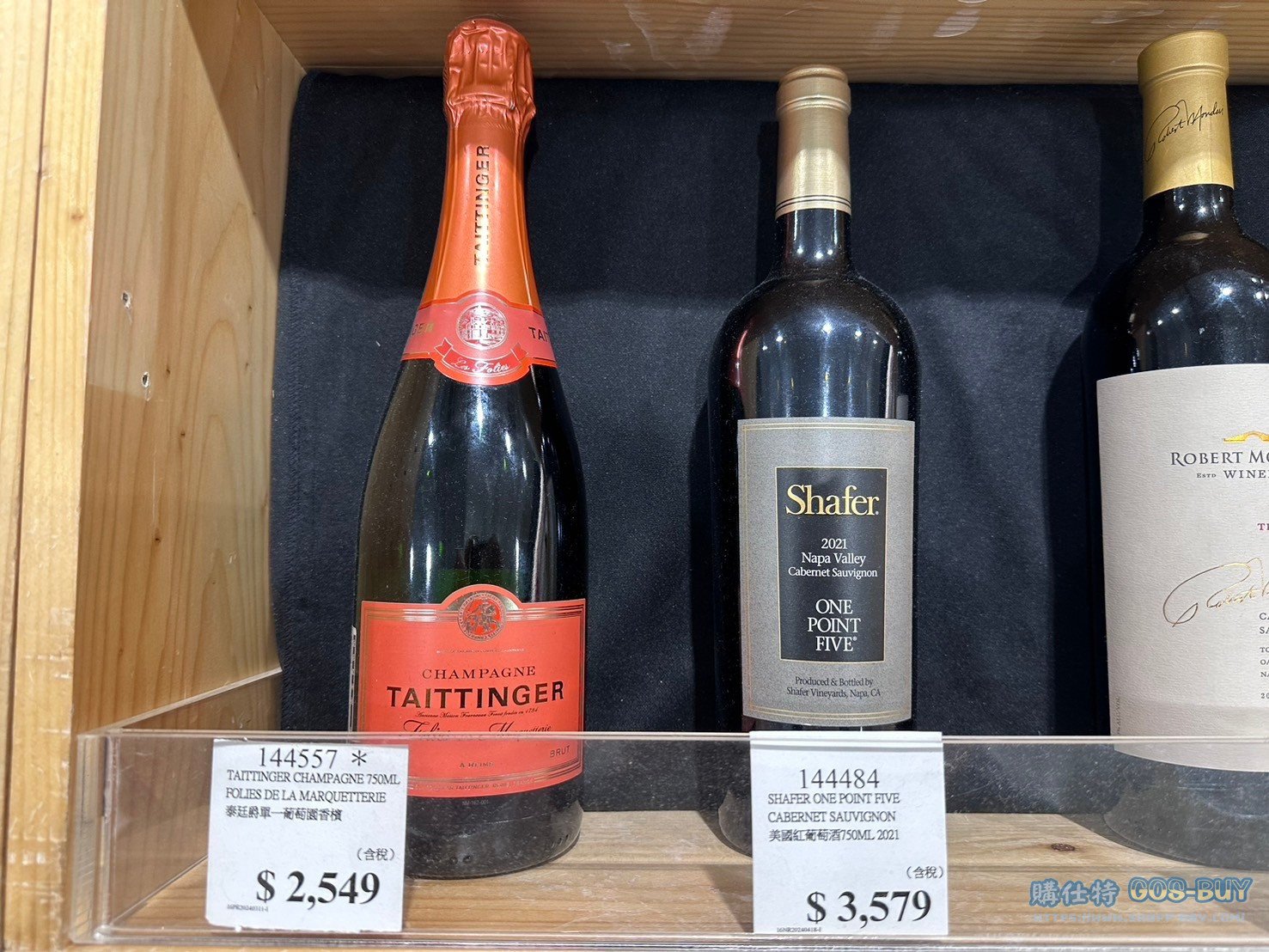 TAITTINGER CHAMPAGNE 750ML FOLIES DE LA MARQUETTERIE(左) 泰廷爵單一葡萄香檳#144557 售價:2549 SHAFER ONE POINT FIVE CABERNET SAUVIGNON(右) 雪佛酒廠美國紅葡萄酒750ML 2021#144484 售價:3579 |