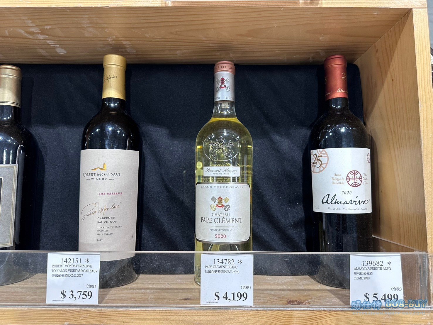 | 備註 | ROBERT MONDAVI RESERVE TO KALON VINEYARD CAB.SAUV(左) 羅伯蒙岱維酒莊美國葡萄酒750ML 2017#142151 售價:3759 PAPE CLEMENT BLANC(中) 黑教皇莊法國白葡萄酒750ML 2020(白酒皇者地位)#134782 售價:4199 ALMAVIVA PUENTE ALTO(右) 愛瑪維瑪智利王紅葡萄酒750ML 2020#139682 售價:5499 |