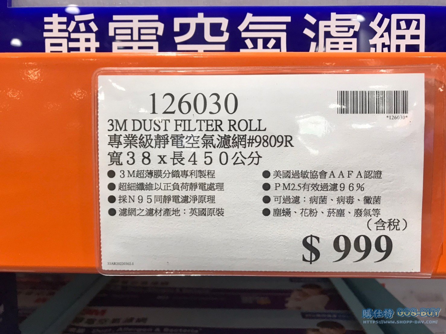 家家電產品其他家電用品 3M DUST FILTER ROLL 專業級靜電空氣濾網 #126030 By 網站小編 2022 年 4 月 24 日 248 產品資訊 產品資訊 產品名稱3M DUST FILTER ROLL 專業級靜電空氣濾網 #9809R 寬38 X 長450公分 #126030價格999產地台灣包裝規格一組(型號:9809R 尺寸:38 X 450公分)保存期限四年備註3M超薄膜分織專利製程超細纖維以正負荷靜電處理採N95同靜電濾淨原理濾網之濾材產地:英國原裝美國過敏協會AAFA認證PM2.5有效過濾96%可過濾:病菌、病毒、黴菌塵螨、花粉、煙塵、廢氣等→商品問題回報← 相關 標籤3M冷氣濾網 前一篇文章WHIRLPOOL DEHUMIDIFIER 惠而浦定頻除濕機23公升 能源一級 #121260下一篇文章PHILIPS WET&DRY EPILATOR 飛利浦乾濕兩用美體刀 #133735 網站小編https://shopp-day.com 或許你也感興趣 價格優惠資訊 2025好市多客製生日蛋糕價格表 價格優惠資訊 好市多Line社群加入方法 保健品&藥品 新甘木堅胃腸藥顆粒40包 #194496 購仕特-CosBuy 查詢排行 價格優惠資訊 2025好市多客製生日蛋糕價格表 價格優惠資訊 好市多Line社群加入方法 保健品&藥品 新甘木堅胃腸藥顆粒40包 #194496 價格優惠資訊 2025好市多會員護照-春季專案商品一覽表 價格優惠資訊 好市多美國牛肉整箱銷售價格表(2024/5/7) 裝載更多 熱門推薦 咖啡機 DOLCE GUSTO GENIO S+ COMBO 雀巢義式膠囊咖啡機 含128顆咖啡膠囊 #128877 冰箱 SHARP夏普變頻雙門冰箱253公升 SJ-H25Y-WH #137098 咖啡機 PHILIPS ESPRESSO MACHINE全自動義式咖啡機 #130890 其他家電用品 TRESANTI FIREPLACE 造型電暖爐 尺寸約193X50X70公分 #124273 家電產品 AIRMATE CERAMIC HEATER 艾美特陶瓷電暖器2入組 智能人體感知功能 HP12101M #116015 裝載更多