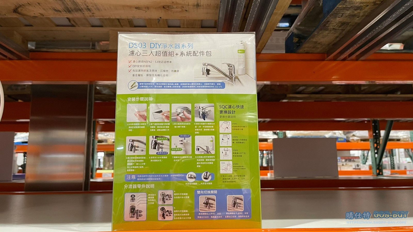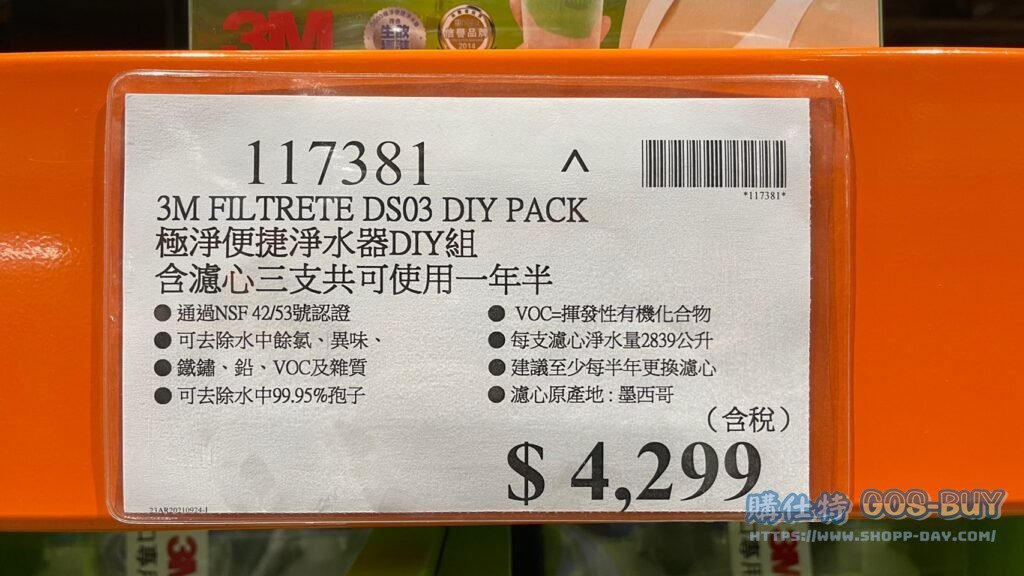 家廚房與居家生活相關 3M FIL TRETE DS03 DIY PACK 極淨便捷淨水器DIY組 含濾心三支共可使用一年半 #117381 By 網站小編 2022 年 2 月 20 日 306 產品資訊 產品資訊 產品名稱3M FIL TRETE DS03 DIY PACK 極淨便捷淨水器DIY組 含濾心三支共可使用一年半 #117381價格4299產地台灣 (濾心產地:墨西哥)包裝規格一組(含濾心三支)保存期限10年備註通過NSF 42/53號認證可去除水中餘氨 異味 鐵鏽鉛 VOC以及雜質可去除水中99.95%孢子VOC=揮發性有機化合物每支濾心淨水量2839公升建議至少每半年更換濾心 →商品問題回報← 相關 標籤3M淨水器 前一篇文章JVR不銹鋼保鮮盒 含蓋8件組 #131190下一篇文章3M極淨便捷替換濾心雙入組 濾心編號DS03 #96381 網站小編https://shopp-day.com 或許你也感興趣 價格優惠資訊 2025好市多客製生日蛋糕價格表 價格優惠資訊 好市多Line社群加入方法 保健品&藥品 新甘木堅胃腸藥顆粒40包 #194496 購仕特-CosBuy 查詢排行 價格優惠資訊 2025好市多客製生日蛋糕價格表 價格優惠資訊 好市多Line社群加入方法 保健品&藥品 新甘木堅胃腸藥顆粒40包 #194496 價格優惠資訊 2025好市多會員護照-春季專案商品一覽表 價格優惠資訊 好市多美國牛肉整箱銷售價格表(2024/5/7) 裝載更多 熱門推薦 廚房與居家生活相關 普拿疼伏冒熱飲20包 #84499 廚房與居家生活相關 DOMAINE DE LA BAUME 波姆酒莊金牌FITOU紅酒 #121971 廚房與居家生活相關 SIMON LI三人座牛皮沙發#1695608 廚房與居家生活相關 TAISHO大正胃腸藥顆粒52包 #126969 廚房與居家生活相關 IDEA NUOVA 摺疊椅 #1393843 裝載更多