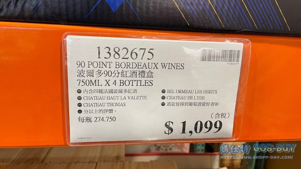 家酒品類葡萄酒 波爾多90分紅酒禮盒#1382675 By 網站小編 2022 年 2 月 2 日 1268 產品資訊 產品資訊 產品名稱90 POINT BORDEAUX WINES 波爾多90分紅酒禮盒 750ML X4 BOTTLES #1382675價格1099產地法國包裝規格750ML X4 BOTTLES保存期限依包裝所示備註內含四種法國波爾多紅酒CHATEAU HAUT LA VALETTECHATEAU THOMASBEL ORMEAU LES HERITSCHATEAU DELYDE酒款皆得到葡萄酒愛好者90分以上的評價 →商品問題回報← 相關 標籤禮盒紅酒葡萄酒 前一篇文章布納哈本12年威士忌禮盒#124736下一篇文章科克蘭美國夏多內白葡萄酒 #514007 網站小編https://shopp-day.com 或許你也感興趣 價格優惠資訊 2025好市多客製生日蛋糕價格表 價格優惠資訊 好市多Line社群加入方法 保健品&藥品 新甘木堅胃腸藥顆粒40包 #194496 購仕特-CosBuy 查詢排行 價格優惠資訊 2025好市多客製生日蛋糕價格表 價格優惠資訊 好市多Line社群加入方法 保健品&藥品 新甘木堅胃腸藥顆粒40包 #194496 價格優惠資訊 2025好市多會員護照-春季專案商品一覽表 價格優惠資訊 好市多美國牛肉整箱銷售價格表(2024/5/7) 裝載更多 熱門推薦 其他酒類 日本芒果梅酒#143982 威士忌 KAVALAN噶瑪蘭調酒師精選威士忌#129555 葡萄酒 波姆酒莊琥珀金牌紅酒#125623 葡萄酒 1865 卡貝納蘇維翁紅酒750ML 2019/2020 #113198 威士忌 蘇格登12年蘇格蘭威士忌1L #37688 裝載更多