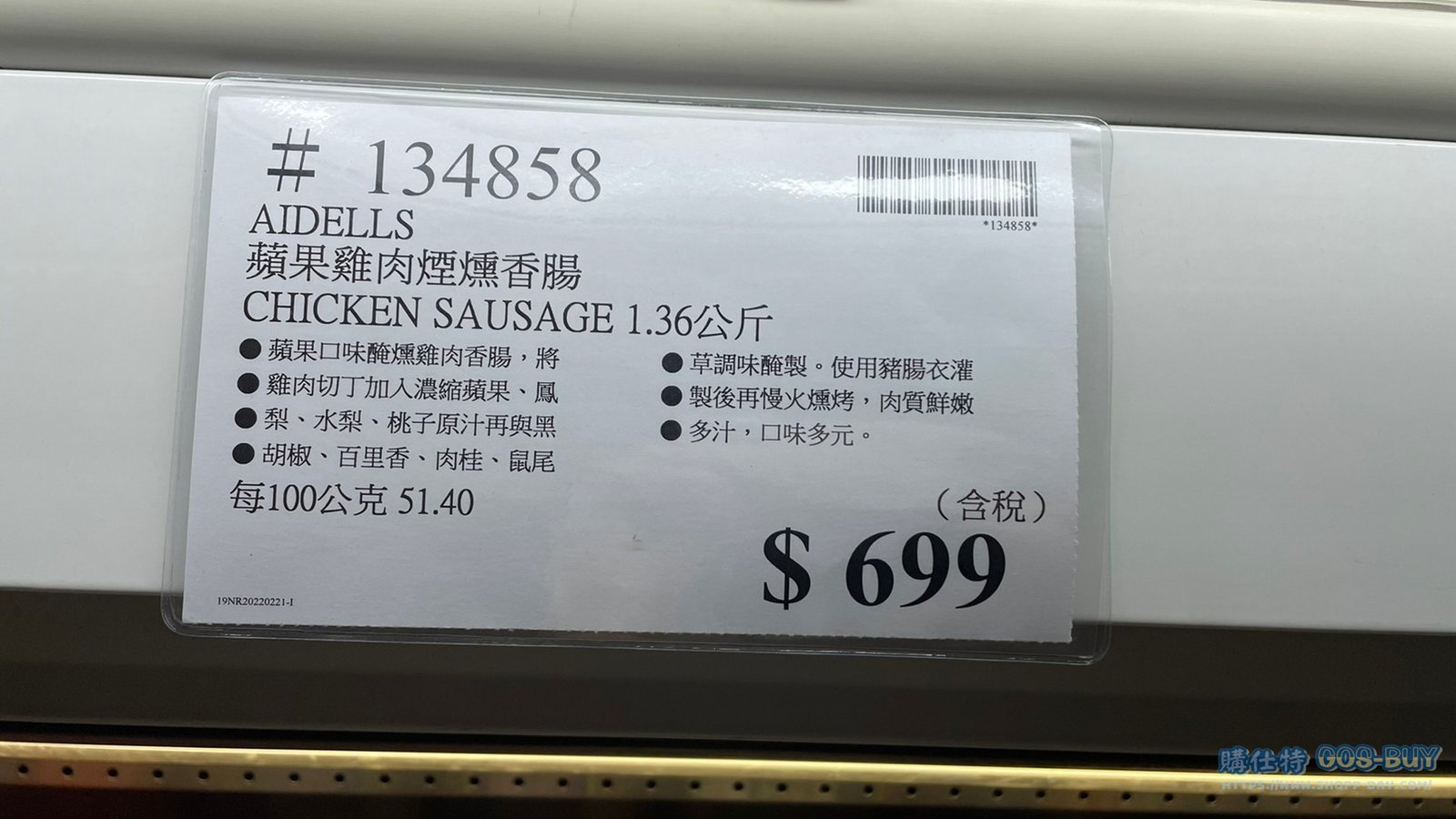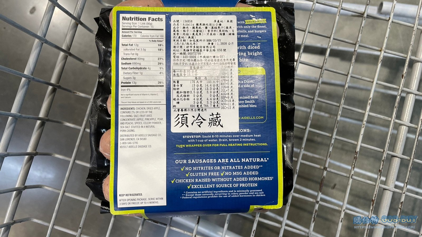 家食品麵包類冷藏食品 AIDELLS 蘋果雞肉煙燻香腸 CHICKEN SAUSAGE 1.36公斤 #134858 By 網站小編 2022 年 3 月 28 日 448 產品資訊 產品資訊 產品名稱AIDELLS 蘋果雞肉煙燻香腸 CHICKEN SAUSAGE 1.36公斤 #134858價格699產地美國包裝規格1.36公斤保存期限依包裝所示備註蘋果口味煙燻雞肉香腸將雞肉切丁加入濃縮蘋果鳳梨、水梨、桃子原汁在與黑胡椒、百里香、肉桂、鼠尾草調製醃製。使用豬腸衣灌製後再慢火燻烤,肉質鮮嫩多汁口味多元。→商品問題回報← 相關 標籤煙燻蘋果香腸 前一篇文章MEIJI明治杏仁巧克力袋裝1000公克 #124372下一篇文章JONGGA 宗家府泡菜 80公克6入 #133594 網站小編https://shopp-day.com 或許你也感興趣 價格優惠資訊 2025好市多客製生日蛋糕價格表 價格優惠資訊 好市多Line社群加入方法 保健品&藥品 新甘木堅胃腸藥顆粒40包 #194496 購仕特-CosBuy 查詢排行 價格優惠資訊 2025好市多客製生日蛋糕價格表 價格優惠資訊 好市多Line社群加入方法 保健品&藥品 新甘木堅胃腸藥顆粒40包 #194496 價格優惠資訊 2025好市多會員護照-春季專案商品一覽表 價格優惠資訊 好市多美國牛肉整箱銷售價格表(2024/5/7) 裝載更多 熱門推薦 價格優惠資訊 2025好市多客製生日蛋糕價格表 價格優惠資訊 好市多美國牛肉整箱銷售價格表(2024/5/7) 價格優惠資訊 好市多日本和牛價格表 2024.4.29更新 冷藏食品 美國特選無骨牛小排火鍋片#25737 冷藏食品 舊振南英式馬芬米福堡#143387 裝載更多