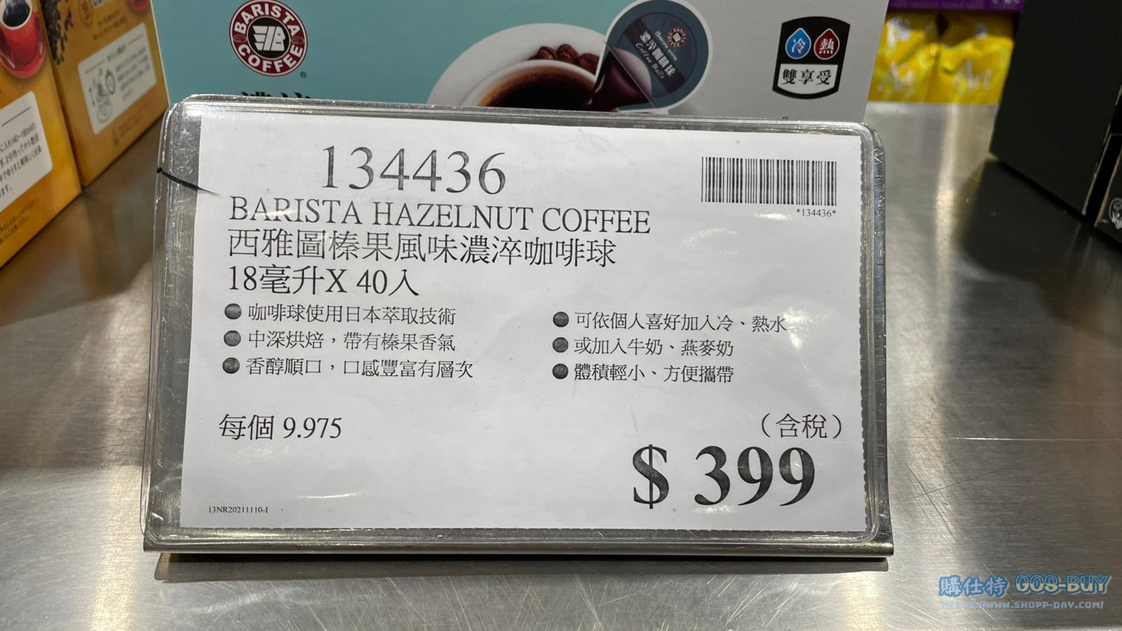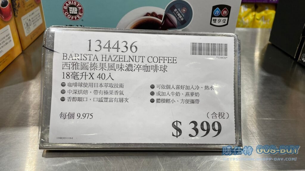 家食品麵包類咖啡製品類 BARISTA HAZELNUT COFFEE 西雅圖榛果風味濃淬咖啡球 18毫升X40入 #134436 By 網站小編 2022 年 1 月 11 日 701 產品資訊 產品資訊 產品名稱BARISTA HAZELNUT COFFEE 西雅圖榛果風味濃淬咖啡球 18毫升X40入 #134436價格399產地日本包裝規格18毫升X40入保存期限依包裝所示備註 →商品問題回報← 相關 標籤咖啡咖啡球榛果西雅圖 前一篇文章NESCAFE GOLD OAT LATTE 雀巢金牌燕麥奶拿鐵咖啡 16公克X36包 #133596下一篇文章MJB HOT BREW COFFEE 熱泡咖啡濾泡包 每包8公斤X50包 #133788 網站小編https://shopp-day.com[td_block_7 block_template_id="td_block_template_8" custom_title="大家也在找" border_color="#81d742" category_id="_current_tag"] 或許你也感興趣 價格優惠資訊 2025好市多客製生日蛋糕價格表 價格優惠資訊 好市多Line社群加入方法 保健品&藥品 新甘木堅胃腸藥顆粒40包 #194496 購仕特-CosBuy 查詢排行 價格優惠資訊 2025好市多客製生日蛋糕價格表 價格優惠資訊 好市多Line社群加入方法 保健品&藥品 新甘木堅胃腸藥顆粒40包 #194496 價格優惠資訊 2025好市多會員護照-春季專案商品一覽表 價格優惠資訊 好市多美國牛肉整箱銷售價格表(2024/5/7) 裝載更多 熱門推薦 價格優惠資訊 2025好市多客製生日蛋糕價格表 價格優惠資訊 好市多美國牛肉整箱銷售價格表(2024/5/7) 價格優惠資訊 好市多日本和牛價格表 2024.4.29更新 冷藏食品 美國特選無骨牛小排火鍋片#25737 冷藏食品 舊振南英式馬芬米福堡#143387 裝載更多