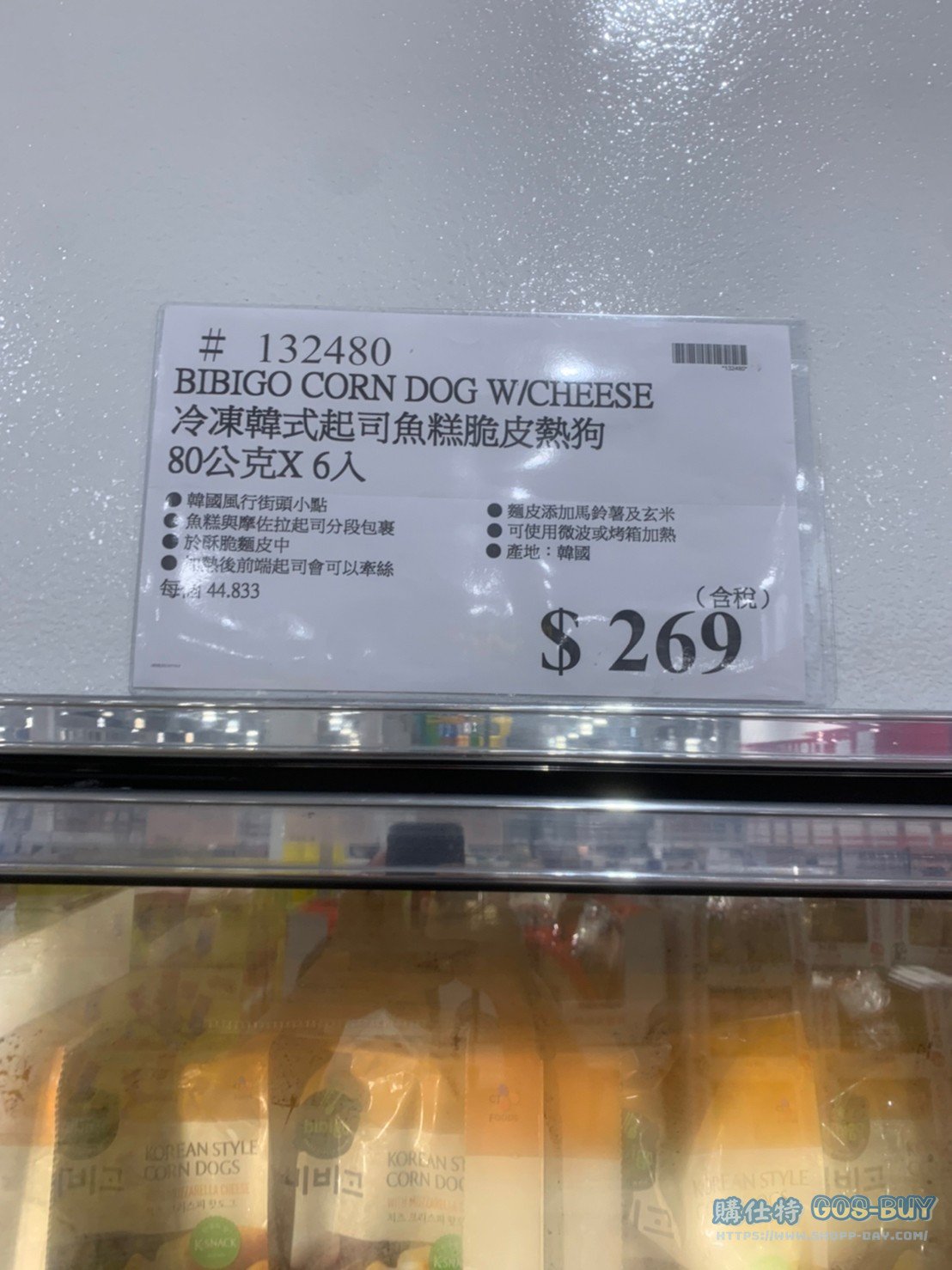 家食品麵包類冷凍食品 BIBIGO CORN DOG W/CHEESE 冷凍韓式起司魚糕脆皮熱狗 80公克X6入 #132480 By 網站小編 2022 年 2 月 28 日 440 產品資訊 產品資訊 產品名稱BIBIGO CORN DOG W/CHEESE 冷凍韓式起司魚糕脆皮熱狗 80公克X6入 #132480價格269產地韓國包裝規格80公克X6入保存期限依包裝所示備註韓國風行街頭小點將魚糕與摩佐拉起司分段包裹於酥脆麵皮中加熱後前端起司會可以牽絲麵皮添加馬鈴薯及玄米可使用微波爐或烤箱加熱→商品問題回報← 相關 標籤BIBIGO熱狗起司韓式 前一篇文章PUNCH BOWL W/SPOON 雞尾酒盆含湯匙 盆約9.5公升 #128676下一篇文章科克蘭無鹽奶油(乳脂含量80%)#744110 網站小編https://shopp-day.com 或許你也感興趣 價格優惠資訊 2025好市多客製生日蛋糕價格表 價格優惠資訊 好市多Line社群加入方法 保健品&藥品 新甘木堅胃腸藥顆粒40包 #194496 購仕特-CosBuy 查詢排行 價格優惠資訊 2025好市多客製生日蛋糕價格表 價格優惠資訊 好市多Line社群加入方法 保健品&藥品 新甘木堅胃腸藥顆粒40包 #194496 價格優惠資訊 2025好市多會員護照-春季專案商品一覽表 價格優惠資訊 好市多美國牛肉整箱銷售價格表(2024/5/7) 裝載更多 熱門推薦 價格優惠資訊 2025好市多客製生日蛋糕價格表 價格優惠資訊 好市多美國牛肉整箱銷售價格表(2024/5/7) 價格優惠資訊 好市多日本和牛價格表 2024.4.29更新 冷藏食品 美國特選無骨牛小排火鍋片#25737 冷藏食品 舊振南英式馬芬米福堡#143387 裝載更多