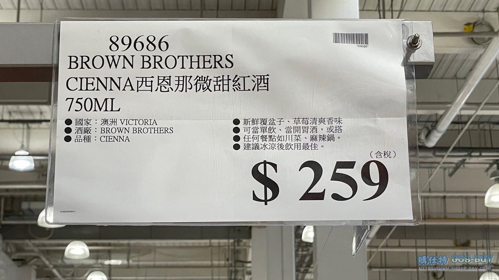 | 備註 | 新鮮覆盆子、草莓清爽香味 可當單飲,當開胃酒或搭配 任何餐點如川菜、麻辣鍋等 建議冰涼後飲用更佳 (好市多會員俗稱229紅酒) 2023/2/13查價價格由299降價為259降價40元 |