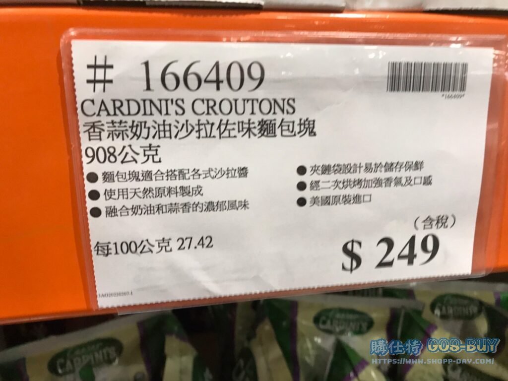 家食品麵包類常溫食品 CARDINI’S CROUTONS 香蒜奶油沙拉佐味麵包塊 #166409 By 網站小編 2022 年 3 月 16 日 376 產品資訊 產品資訊 產品名稱 CARDINI’S CROUTONS 香蒜奶油沙拉佐味麵包塊 #166409 價格 249 產地 美國 包裝規格 908公克 保存期限 依包裝所示 備註 麵包塊適合搭配各式沙拉醬使用天然原料製成融合奶油和蒜香的濃郁風味夾鍊設計易於儲存保鮮經二次烘烤加強香氣及口感美國原裝進口 →商品問題回報← 相關 標籤麵包 前一篇文章YIXIANG BABY SCALLOP 怡祥辣味干貝味燒120公克X3罐 #84655下一篇文章PANTENE CONDITIONER 潤髮乳迷迭香檸檬1130毫升 #1559164 網站小編https://shopp-day.com 或許你也感興趣 價格優惠資訊 2025好市多客製生日蛋糕價格表 價格優惠資訊 好市多Line社群加入方法 保健品&藥品 新甘木堅胃腸藥顆粒40包 #194496 購仕特-CosBuy 查詢排行 價格優惠資訊 2025好市多客製生日蛋糕價格表 價格優惠資訊 好市多Line社群加入方法 保健品&藥品 新甘木堅胃腸藥顆粒40包 #194496 價格優惠資訊 2025好市多會員護照-春季專案商品一覽表 價格優惠資訊 好市多美國牛肉整箱銷售價格表(2024/5/7) 裝載更多 熱門推薦 價格優惠資訊 2025好市多客製生日蛋糕價格表 價格優惠資訊 好市多美國牛肉整箱銷售價格表(2024/5/7) 價格優惠資訊 好市多日本和牛價格表 2024.4.29更新 冷藏食品 美國特選無骨牛小排火鍋片#25737 冷藏食品 舊振南英式馬芬米福堡#143387 裝載更多