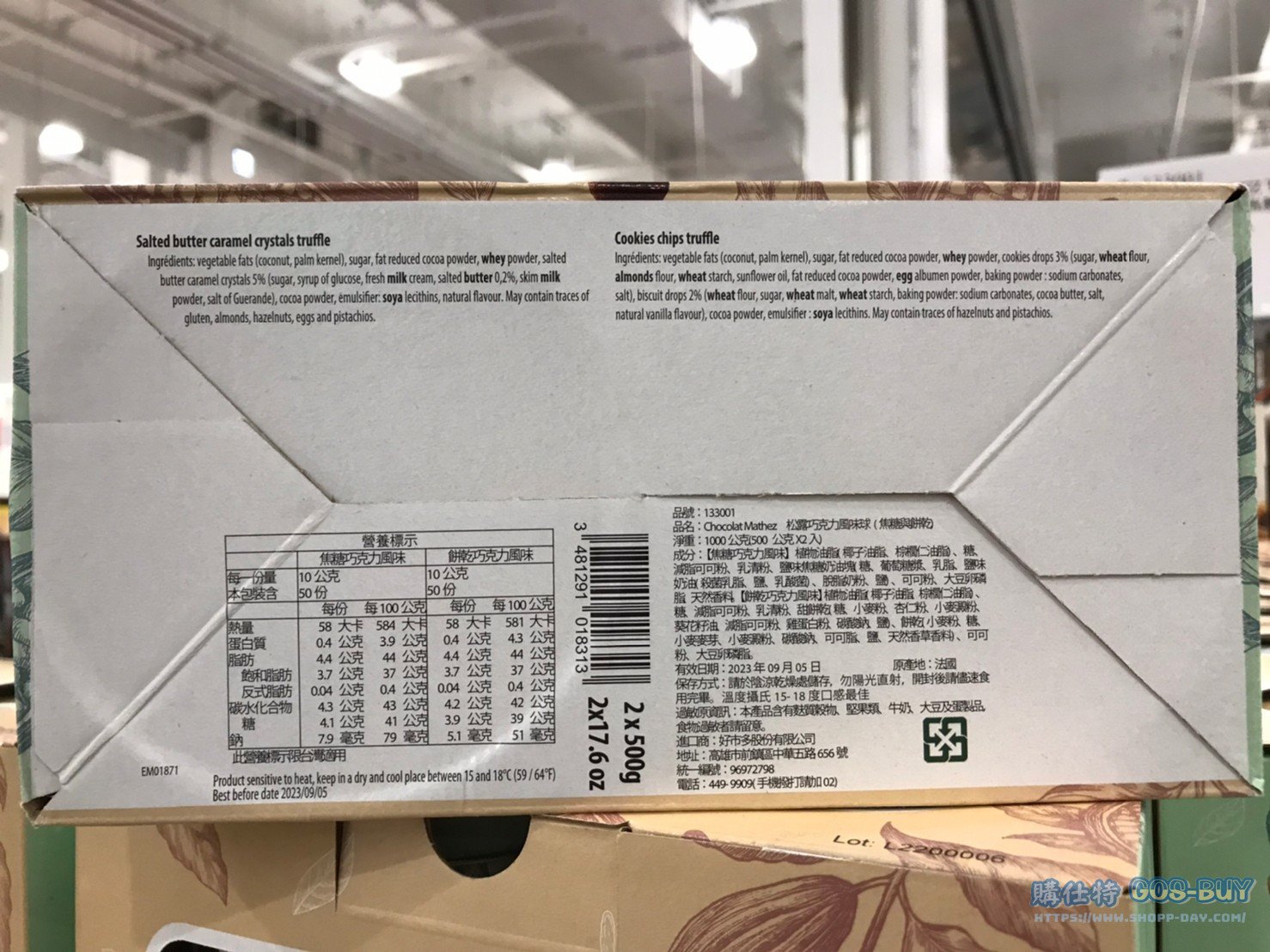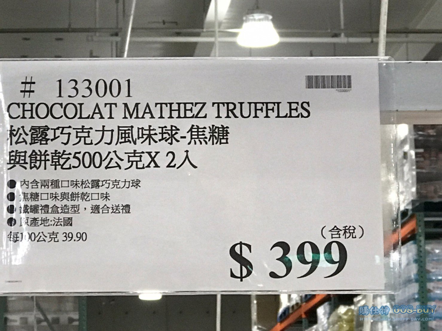 家零食&飲料法國零食 CHOCOLAT MATHEZ松露巧克力風味球-焦糖與餅乾 #133001 By 網站小編 2022 年 2 月 7 日 363 產品資訊 產品資訊 產品名稱CHOCOLAT MATHEZ TRUFFLES 松露巧克力風味球-焦糖與餅乾500公克X2入 #133001價格399產地法國包裝規格一組保存期限依包裝所示備註內含兩種口味松露巧克力球焦糖口味與餅乾口味鐵罐禮盒造型 適合送禮產地:法國2022/9/17查價價格由369漲價為399漲價30元 →商品問題回報← 相關 標籤CHOCOLAT MATHEZ巧克力松露焦糖餅乾 前一篇文章LED X’MAS DIAMOND LIGHT LED鑽石彩光聖誕樹燈 #125111下一篇文章KELLOGG’S 家樂氏無添加糖水果圈 每盒300公克X2盒 #131325 網站小編https://shopp-day.com 或許你也感興趣 價格優惠資訊 2025好市多客製生日蛋糕價格表 價格優惠資訊 好市多Line社群加入方法 保健品&藥品 新甘木堅胃腸藥顆粒40包 #194496 購仕特-CosBuy 查詢排行 價格優惠資訊 2025好市多客製生日蛋糕價格表 價格優惠資訊 好市多Line社群加入方法 保健品&藥品 新甘木堅胃腸藥顆粒40包 #194496 價格優惠資訊 2025好市多會員護照-春季專案商品一覽表 價格優惠資訊 好市多美國牛肉整箱銷售價格表(2024/5/7) 裝載更多 熱門推薦 美國零食 科克蘭葡萄乾巧克力#959987 冷藏飲品 BLUE DIAMOND 無糖原味杏仁飲1.89L #129794 西班牙零食 MR.BROWNIE 巧克力布郎尼#153753 泰國零食 A&R牛奶巧克力迷你甜筒餅乾#1744884 比利時零食 科克蘭烈酒與波特酒巧克力 #1351451 裝載更多