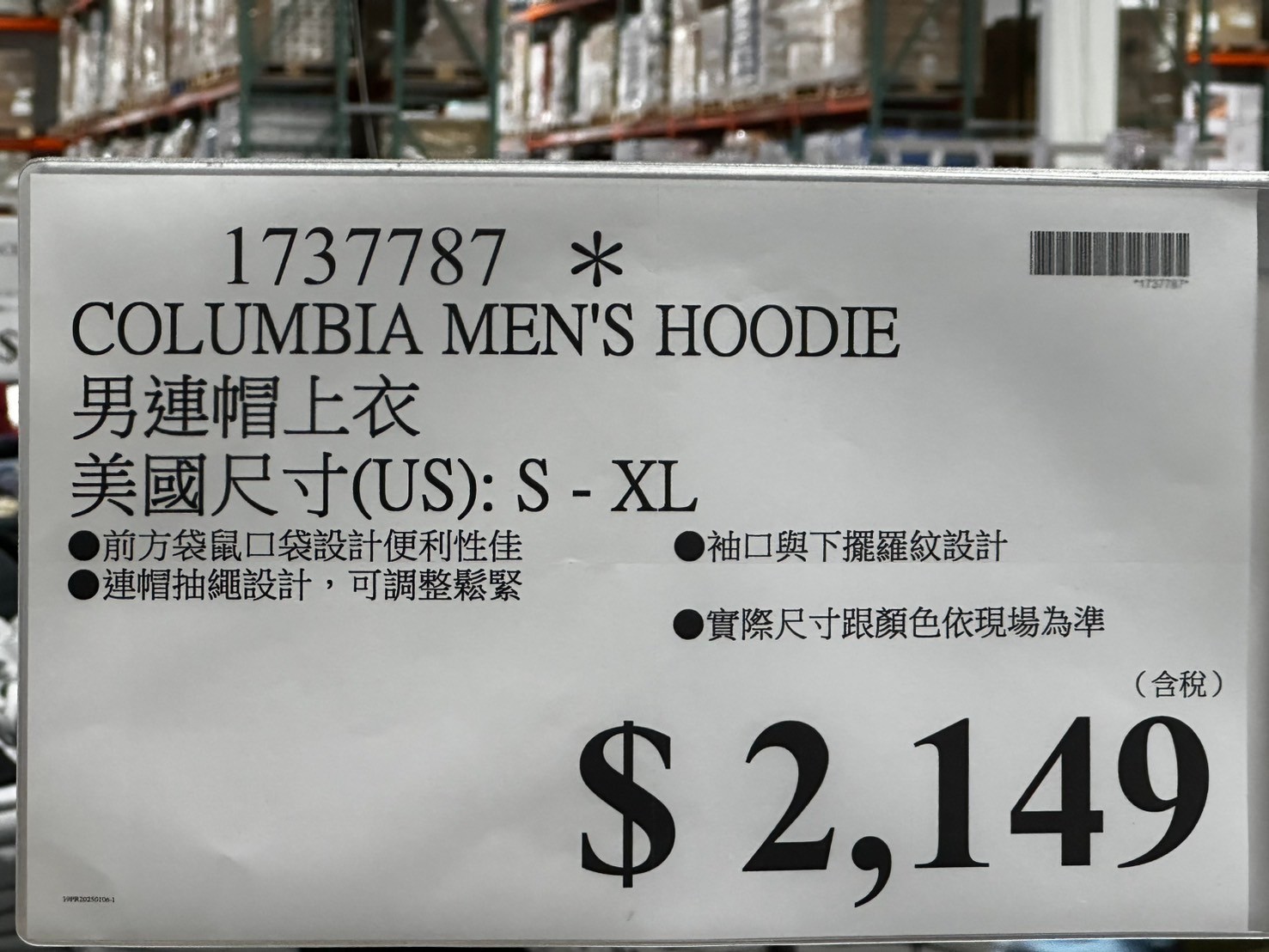 家廚房與居家生活相關 COLUMBIA男連帽上衣#1737787 By 網站小編 2025 年 2 月 2 日 226 產品資訊 產品資訊 產品名稱 COLUMBIA MEN’S HOODIE 男連帽上衣 美國尺寸(US):S-XL#1737787 價格 2149 產地 中國 包裝規格 一件 美國尺寸(US):S-XL 保存期限 N/A 備註 前方袋鼠口袋設計便利性佳,連帽抽繩設計,可調整鬆緊。袖口與下擺羅紋設計,實際尺寸跟顏色依現場為準。 →商品問題回報← 相關 標籤COLUMBIA上衣男生男生衣服連帽T 前一篇文章TOMMY男防風外套(隱藏式連帽)#145453下一篇文章CK男刷毛束口長褲#140747 網站小編https://shopp-day.com 或許你也感興趣 價格優惠資訊 2025好市多客製生日蛋糕價格表 價格優惠資訊 好市多Line社群加入方法 保健品&藥品 新甘木堅胃腸藥顆粒40包 #194496 購仕特-CosBuy 查詢排行 價格優惠資訊 2025好市多客製生日蛋糕價格表 價格優惠資訊 好市多Line社群加入方法 保健品&藥品 新甘木堅胃腸藥顆粒40包 #194496 價格優惠資訊 2025好市多會員護照-春季專案商品一覽表 價格優惠資訊 好市多美國牛肉整箱銷售價格表(2024/5/7) 裝載更多 熱門推薦 廚房與居家生活相關 普拿疼伏冒熱飲20包 #84499 廚房與居家生活相關 DOMAINE DE LA BAUME 波姆酒莊金牌FITOU紅酒 #121971 廚房與居家生活相關 SIMON LI三人座牛皮沙發#1695608 廚房與居家生活相關 TAISHO大正胃腸藥顆粒52包 #126969 廚房與居家生活相關 IDEA NUOVA 摺疊椅 #1393843 裝載更多