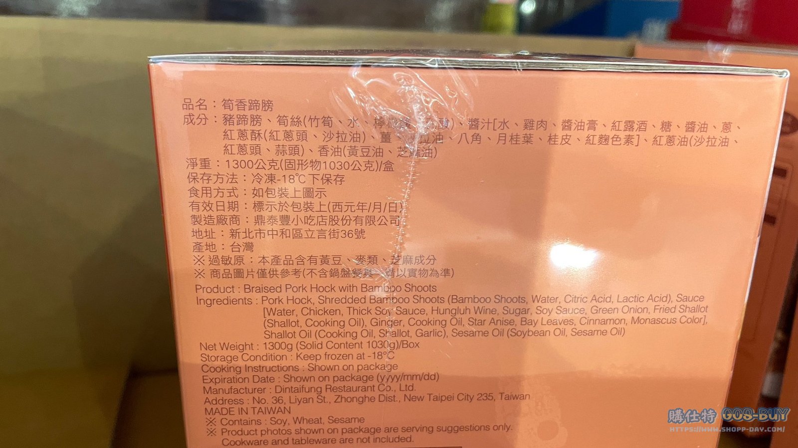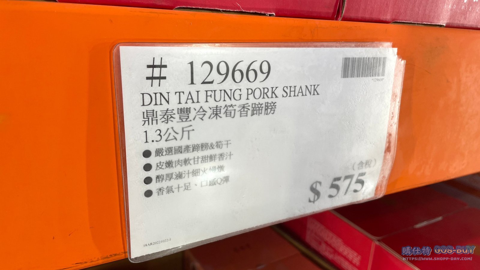 家食品麵包類冷凍食品 鼎泰豐冷凍筍香蹄膀 #129669 By 網站小編 2021 年 12 月 28 日 277 產品資訊 產品資訊 產品名稱DIN TAI FUNG PORK SHANK 鼎泰豐冷凍筍香蹄膀 1.3公斤 #129669價格575產地台灣包裝規格1.3公斤保存期限依包裝所示備註嚴選國產蹄膀&筍干皮嫩肉軟甘甜鮮香汁醇厚滷汁細火慢燉香氣十足、口感Q彈2022/10/26查價價格由549漲價為575漲價26元→商品問題回報← 相關 標籤豬腳蹄膀鼎泰豐 前一篇文章PGI BEEF NOODLE W/SPICY SAUCE 410G X 4PK 名廚美饌香滷牛肉乾拌麵 #132072下一篇文章LXZ PORK KNUCKLE 老協珍烏參元蹄 1.3公斤 #101782 網站小編https://shopp-day.com[td_block_7 block_template_id="td_block_template_8" custom_title="大家也在找" border_color="#81d742" category_id="_current_tag"] 或許你也感興趣 價格優惠資訊 2025好市多客製生日蛋糕價格表 價格優惠資訊 好市多Line社群加入方法 保健品&藥品 新甘木堅胃腸藥顆粒40包 #194496 購仕特-CosBuy 查詢排行 價格優惠資訊 2025好市多客製生日蛋糕價格表 價格優惠資訊 好市多Line社群加入方法 保健品&藥品 新甘木堅胃腸藥顆粒40包 #194496 價格優惠資訊 2025好市多會員護照-春季專案商品一覽表 價格優惠資訊 好市多美國牛肉整箱銷售價格表(2024/5/7) 裝載更多 熱門推薦 價格優惠資訊 2025好市多客製生日蛋糕價格表 價格優惠資訊 好市多美國牛肉整箱銷售價格表(2024/5/7) 價格優惠資訊 好市多日本和牛價格表 2024.4.29更新 冷藏食品 美國特選無骨牛小排火鍋片#25737 冷藏食品 舊振南英式馬芬米福堡#143387 裝載更多