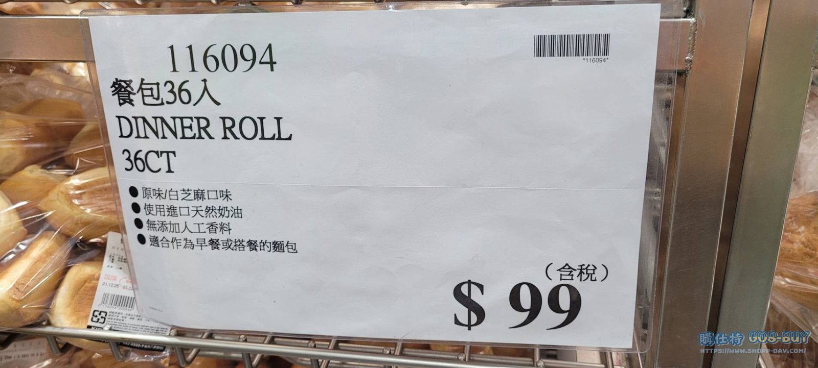家食品麵包類 DINNER ROLL 36CT 餐包36入 #116094 By 網站小編 2022 年 2 月 28 日 206 產品資訊 產品資訊 產品名稱DINNER ROLL 36CT 餐包36入 #116094價格99產地台灣包裝規格36入保存期限依包裝所示備註原味/白芝麻口味使用進口天然奶油無添加人工香料適合作為早餐或搭餐的麵包→商品問題回報← 相關 標籤餐包 前一篇文章BAILEY’S 貝禮詩香甜酒巧克力風味 #133234下一篇文章ORANGE CHEESE BREAD 2CT 蜜橘乳酪核桃麵包2入 #133893 網站小編https://shopp-day.com 或許你也感興趣 價格優惠資訊 2025好市多客製生日蛋糕價格表 價格優惠資訊 好市多Line社群加入方法 保健品&藥品 新甘木堅胃腸藥顆粒40包 #194496 購仕特-CosBuy 查詢排行 價格優惠資訊 2025好市多客製生日蛋糕價格表 價格優惠資訊 好市多Line社群加入方法 保健品&藥品 新甘木堅胃腸藥顆粒40包 #194496 價格優惠資訊 2025好市多會員護照-春季專案商品一覽表 價格優惠資訊 好市多美國牛肉整箱銷售價格表(2024/5/7) 裝載更多 熱門推薦 價格優惠資訊 2025好市多客製生日蛋糕價格表 價格優惠資訊 好市多美國牛肉整箱銷售價格表(2024/5/7) 價格優惠資訊 好市多日本和牛價格表 2024.4.29更新 冷藏食品 美國特選無骨牛小排火鍋片#25737 冷藏食品 舊振南英式馬芬米福堡#143387 裝載更多