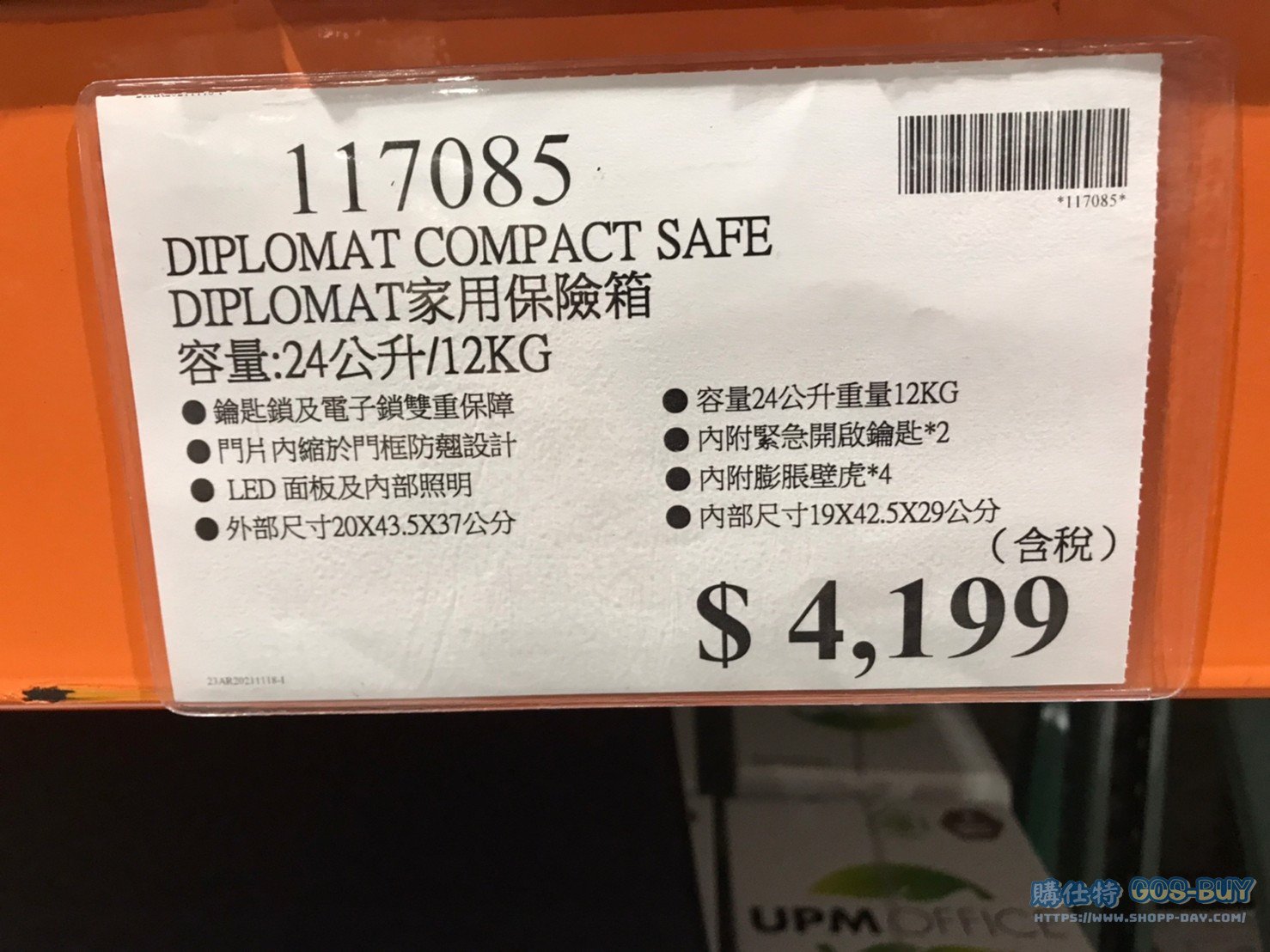 家廚房與居家生活相關 DIPLOMAT COMPACT SAFE 家用保險箱 容量:24公升/12KG #117085 By 網站小編 2022 年 5 月 3 日 902 產品資訊 產品資訊 產品名稱DIPLOMAT COMPACT SAFE 家用保險箱 容量:24公升/12KG #117085價格4199產地台灣包裝規格一組(容量:24公升/12KG)保存期限N/A備註鑰匙鎖及電子鎖雙重保障門片內縮於門框防翹設計LED面板及內部照明外部尺寸20 X 43.5 X 37公分容量24公升重量12KG內附緊急開啟鎖匙*2內附膨脹壁虎*4內部尺寸 19 X 42.5 X 29公分→商品問題回報← 相關 標籤保險箱金庫 前一篇文章EAGLE 家用防火保險箱031D 容量:40公升/60KG #116455下一篇文章SIGG TRITAN WATER BOTTLE 兒童隨身水瓶兩件組 #130638 網站小編https://shopp-day.com 或許你也感興趣 價格優惠資訊 2025好市多客製生日蛋糕價格表 價格優惠資訊 好市多Line社群加入方法 保健品&藥品 新甘木堅胃腸藥顆粒40包 #194496 購仕特-CosBuy 查詢排行 價格優惠資訊 2025好市多客製生日蛋糕價格表 價格優惠資訊 好市多Line社群加入方法 保健品&藥品 新甘木堅胃腸藥顆粒40包 #194496 價格優惠資訊 2025好市多會員護照-春季專案商品一覽表 價格優惠資訊 好市多美國牛肉整箱銷售價格表(2024/5/7) 裝載更多 熱門推薦 廚房與居家生活相關 普拿疼伏冒熱飲20包 #84499 廚房與居家生活相關 DOMAINE DE LA BAUME 波姆酒莊金牌FITOU紅酒 #121971 廚房與居家生活相關 SIMON LI三人座牛皮沙發#1695608 廚房與居家生活相關 TAISHO大正胃腸藥顆粒52包 #126969 廚房與居家生活相關 IDEA NUOVA 摺疊椅 #1393843 裝載更多