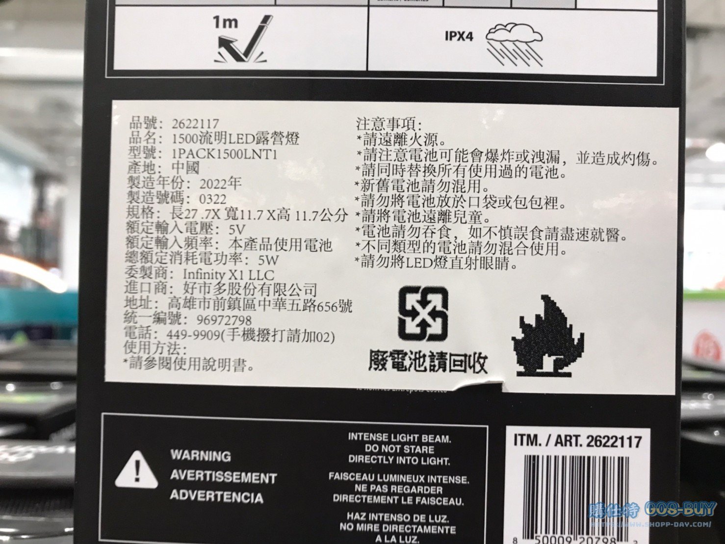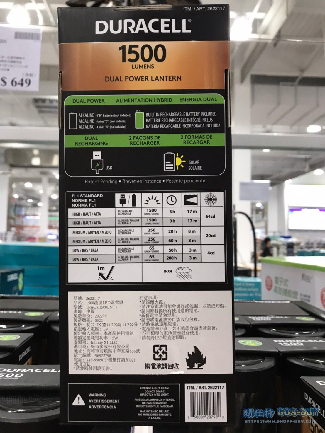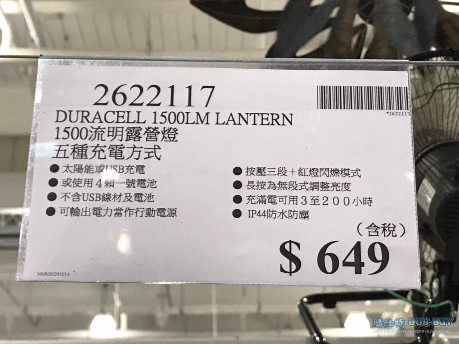 家家電產品燈光照明類 DURACELL1500流明露營燈 五種充電方式 #2622117 By 網站小編 2022 年 6 月 14 日 692 產品資訊 產品資訊 產品名稱DURACELL 1500LM LANTERN 1500流明露營燈 五種充電方式 #2622117價格649產地中國包裝規格一入保存期限 N/A備註太陽能或USB充電或使用4顆一號電池不含USB線材及電池可輸出電力當作行動電源按壓三段+紅燈閃爍模式長按為無段式調整亮度充滿電可用3至200小時IP44防水防塵→商品問題回報← 相關 標籤太陽能金頂防水露營燈 前一篇文章GLASSLOCK無邊框系列玻璃保鮮盒組 #125365下一篇文章仿葡萄酒桶造型花盆 #2127034 網站小編https://shopp-day.com 或許你也感興趣 價格優惠資訊 2025好市多客製生日蛋糕價格表 價格優惠資訊 好市多Line社群加入方法 保健品&藥品 新甘木堅胃腸藥顆粒40包 #194496 購仕特-CosBuy 查詢排行 價格優惠資訊 2025好市多客製生日蛋糕價格表 價格優惠資訊 好市多Line社群加入方法 保健品&藥品 新甘木堅胃腸藥顆粒40包 #194496 價格優惠資訊 2025好市多會員護照-春季專案商品一覽表 價格優惠資訊 好市多美國牛肉整箱銷售價格表(2024/5/7) 裝載更多 熱門推薦 戶外用品 12*16′ TARPS 2 PACK 多功能雙色帆布2入#1600091 園藝相關 好市多花束價格 #111590 #136064 #117849 #28013 旅行用品類 SAMSONITE 22+29吋行李箱二入組#140918 戶外用品 COHO 156公升冰桶 適合露營、釣魚 #1382241 汽機車用品 MICHELIN 米其林18吋輪胎PRIMACY SUV+輪胎 235/60 R18 103V #136585 裝載更多