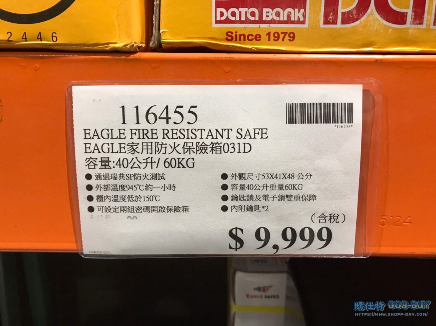 家廚房與居家生活相關 EAGLE 家用防火保險箱031D 容量:40公升/60KG #116455 By 網站小編 2022 年 5 月 3 日 506 產品資訊 產品資訊 產品名稱 EAGLE FIRE RESISTANT SAFE 家用防火保險箱031D 容量:40公升/60KG #116455 價格 9999 產地 韓國 包裝規格 一入(型號:031D) 保存期限 保固一年 備註 通過瑞典SP防火測試外部溫度945°C約一小時櫃內溫度低於150°C可設定兩組密碼開啟保險箱外觀尺寸:53 X 41 X 48 公分容量40公升重量60KG鑰匙鎖及電子鎖雙重保障內附鑰匙*2 →商品問題回報← 相關 標籤保險箱金庫防火 前一篇文章SPRINGDALE DOOR MIRROR 門鏡/穿衣鏡 尺寸:132 X 40公分 #129602下一篇文章DIPLOMAT COMPACT SAFE 家用保險箱 容量:24公升/12KG #117085 網站小編https://shopp-day.com 或許你也感興趣 價格優惠資訊 2025好市多客製生日蛋糕價格表 價格優惠資訊 好市多Line社群加入方法 保健品&藥品 新甘木堅胃腸藥顆粒40包 #194496 購仕特-CosBuy 查詢排行 價格優惠資訊 2025好市多客製生日蛋糕價格表 價格優惠資訊 好市多Line社群加入方法 保健品&藥品 新甘木堅胃腸藥顆粒40包 #194496 價格優惠資訊 2025好市多會員護照-春季專案商品一覽表 價格優惠資訊 好市多美國牛肉整箱銷售價格表(2024/5/7) 裝載更多 熱門推薦 廚房與居家生活相關 普拿疼伏冒熱飲20包 #84499 廚房與居家生活相關 DOMAINE DE LA BAUME 波姆酒莊金牌FITOU紅酒 #121971 廚房與居家生活相關 SIMON LI三人座牛皮沙發#1695608 廚房與居家生活相關 TAISHO大正胃腸藥顆粒52包 #126969 廚房與居家生活相關 IDEA NUOVA 摺疊椅 #1393843 裝載更多