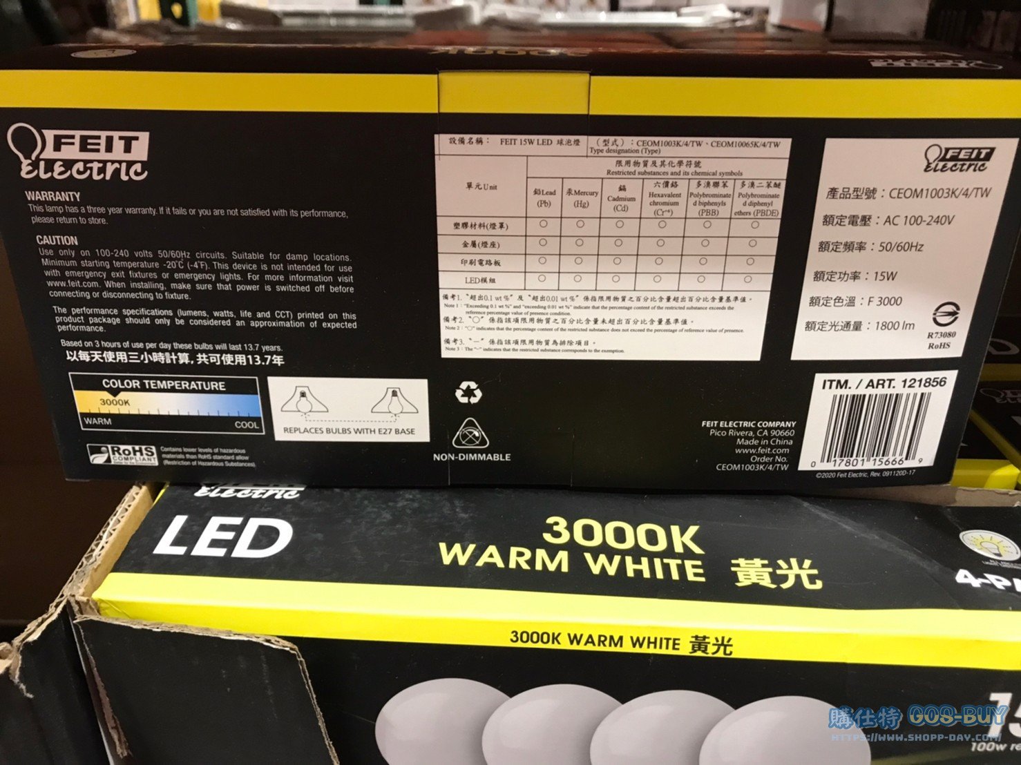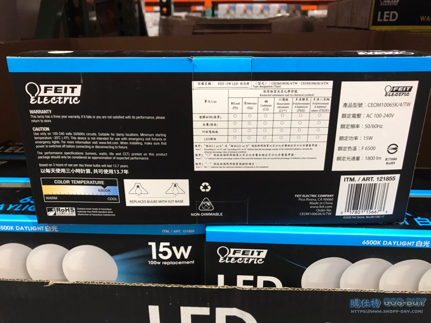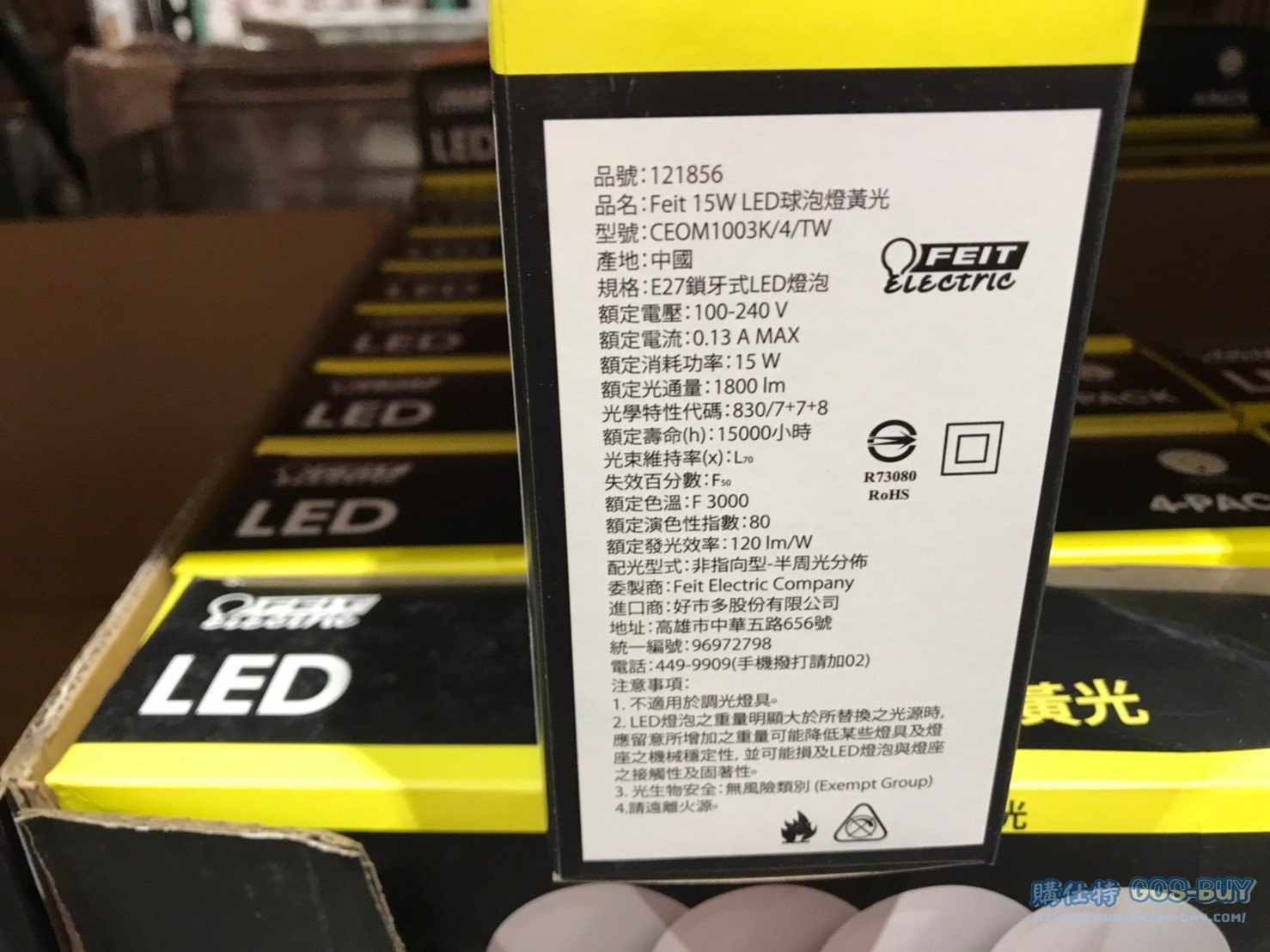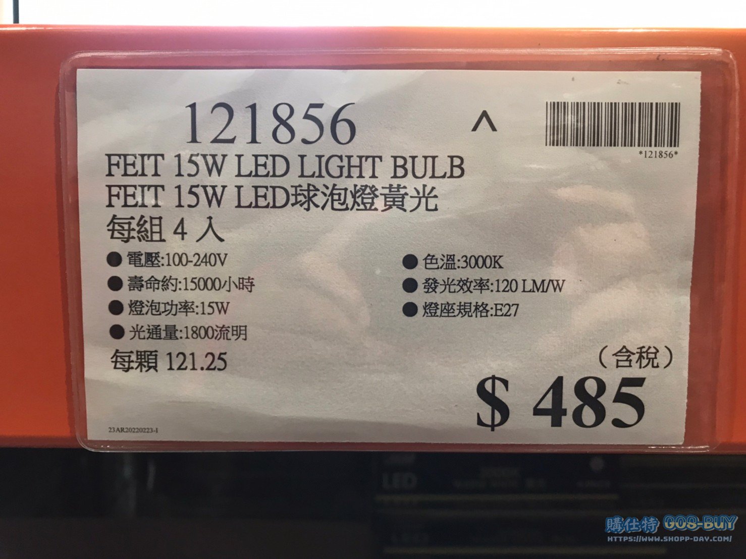 家家電產品 FEIT 15W LED球泡燈黃光/白光 #121856 #121855 By 網站小編 2022 年 6 月 14 日 333 產品資訊 產品資訊 產品名稱FEIT 15W LED LIGHT BULB LED球泡燈黃光/白光 #121856 #121855價格485產地中國包裝規格一組四入保存期限 N/A備註電壓:100-240V壽命約:15000小時燈泡功率:15W光通量:1800流明色溫:3000K發光效率:120LM/W燈座規格:E27→商品問題回報← 相關 標籤FEITLED燈泡 前一篇文章PHILIPS飛利浦11W LED雪糕燈泡 #125919 #125921下一篇文章FEIT 23瓦螺旋省電燈泡T3管徑白光/黃光 #120988 #120989 網站小編https://shopp-day.com 或許你也感興趣 價格優惠資訊 2025好市多客製生日蛋糕價格表 價格優惠資訊 好市多Line社群加入方法 保健品&藥品 新甘木堅胃腸藥顆粒40包 #194496 購仕特-CosBuy 查詢排行 價格優惠資訊 2025好市多客製生日蛋糕價格表 價格優惠資訊 好市多Line社群加入方法 保健品&藥品 新甘木堅胃腸藥顆粒40包 #194496 價格優惠資訊 2025好市多會員護照-春季專案商品一覽表 價格優惠資訊 好市多美國牛肉整箱銷售價格表(2024/5/7) 裝載更多 熱門推薦 咖啡機 DOLCE GUSTO GENIO S+ COMBO 雀巢義式膠囊咖啡機 含128顆咖啡膠囊 #128877 冰箱 SHARP夏普變頻雙門冰箱253公升 SJ-H25Y-WH #137098 咖啡機 PHILIPS ESPRESSO MACHINE全自動義式咖啡機 #130890 戶外用品 11呎懸臂式LED遮陽傘含底座 #2127229 其他家電用品 TRESANTI FIREPLACE 造型電暖爐 尺寸約193X50X70公分 #124273 裝載更多