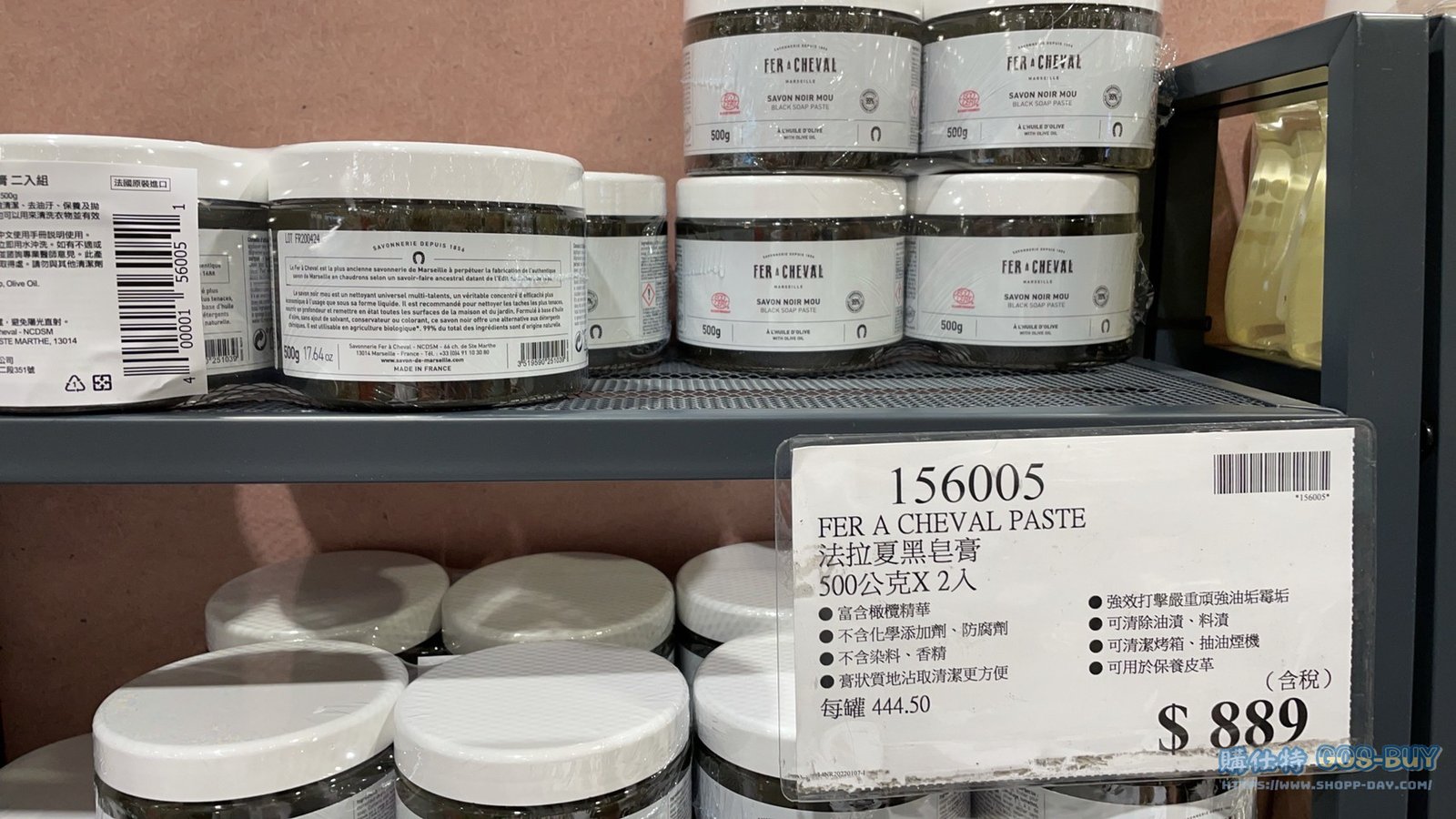 家廚房與居家生活相關居家清潔用品類 FER à CHEVAL PASTE 法拉夏黑皂膏 500公克X2入 #156005 By 網站小編 2022 年 2 月 20 日 271 產品資訊 產品資訊 產品名稱FER à CHEVAL PASTE 法拉夏黑皂膏 500公克X2入 #156005價格889產地法國包裝規格500公克X2入保存期限依包裝所示備註富含橄欖精華不含化學添加劑 防腐劑不含染料 香精膏狀質地沾取清潔更方便強效打擊嚴重頑強油垢霉垢可清除油漬 料漬可清潔烤箱 抽油煙機可用於保養皮革 →商品問題回報← 相關 標籤法拉夏特展展示商品黑皂 前一篇文章FER à CHEVAL SPRAY 法拉夏多用途清潔噴霧 500毫升X2入 #156002下一篇文章PORK KNUCKLE W/VERMICELLI 花生豬腳麵線 #138899 網站小編https://shopp-day.com 或許你也感興趣 價格優惠資訊 2025好市多客製生日蛋糕價格表 價格優惠資訊 好市多Line社群加入方法 保健品&藥品 新甘木堅胃腸藥顆粒40包 #194496 購仕特-CosBuy 查詢排行 價格優惠資訊 2025好市多客製生日蛋糕價格表 價格優惠資訊 好市多Line社群加入方法 保健品&藥品 新甘木堅胃腸藥顆粒40包 #194496 價格優惠資訊 2025好市多會員護照-春季專案商品一覽表 價格優惠資訊 好市多美國牛肉整箱銷售價格表(2024/5/7) 裝載更多 熱門推薦 廚房與居家生活相關 普拿疼伏冒熱飲20包 #84499 廚房與居家生活相關 DOMAINE DE LA BAUME 波姆酒莊金牌FITOU紅酒 #121971 廚房與居家生活相關 SIMON LI三人座牛皮沙發#1695608 廚房與居家生活相關 TAISHO大正胃腸藥顆粒52包 #126969 廚房與居家生活相關 IDEA NUOVA 摺疊椅 #1393843 裝載更多