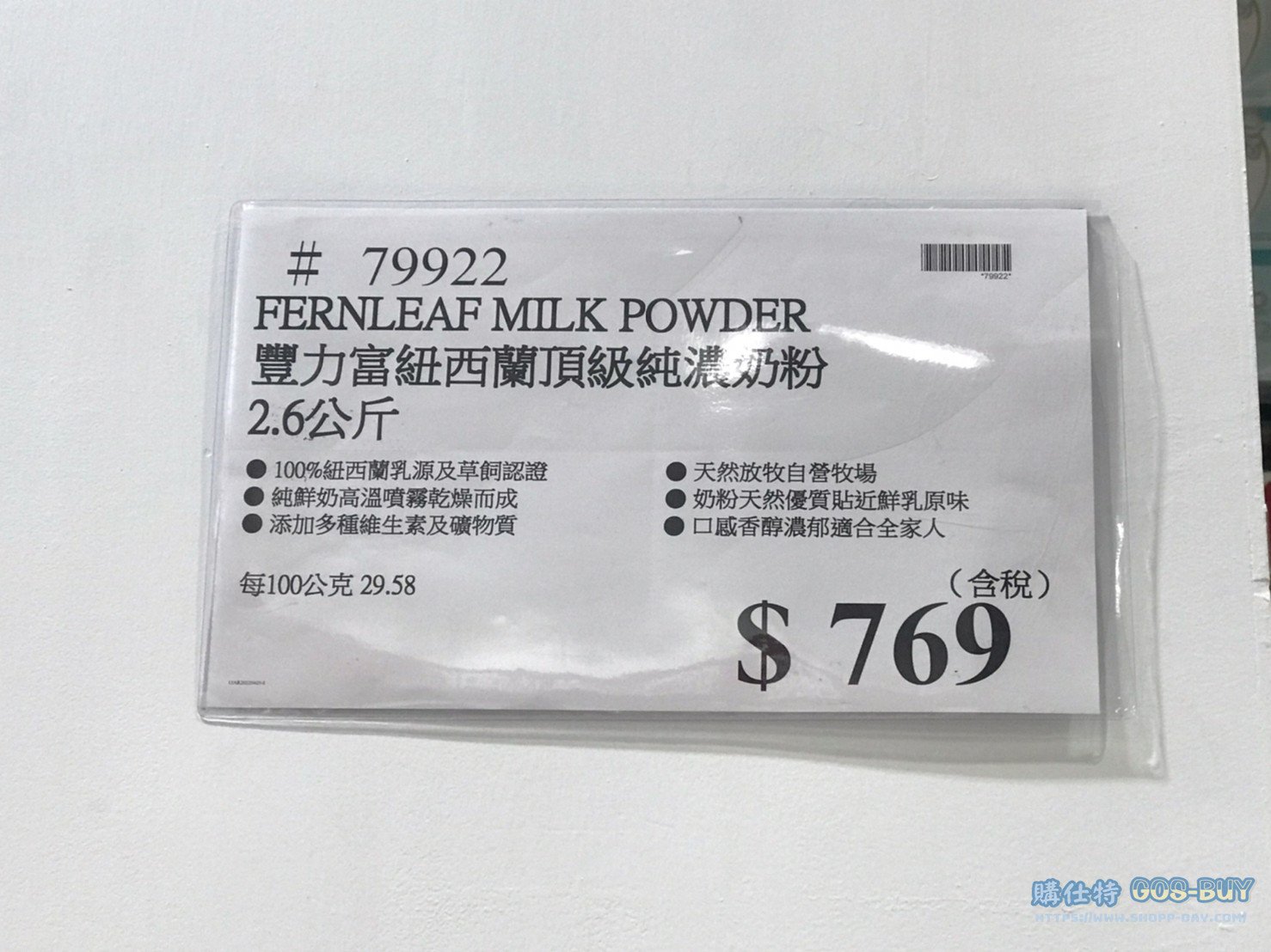 家廚房與居家生活相關奶粉 豐力富紐西蘭頂級純濃奶粉 #79922 By 網站小編 2021 年 11 月 1 日 309 產品資訊 產品資訊 產品名稱FERNLEAF MILK POWDER 豐力富紐西蘭頂級純濃奶粉 2.6公斤 #79922價格769產地紐西蘭包裝規格2.6公斤保存期限依包裝所示備註100%紐西蘭乳源及草飼認證純鮮奶高溫噴霧乾燥而成添加多種維生素及礦物質天然放牧自營牧場奶粉天然優質貼近鮮乳原味口感香醇濃郁適合全家人→商品問題回報← 相關 標籤紐西蘭豐力富 前一篇文章MENAGE A TROIS甜白葡萄酒 750ML #129081下一篇文章橘子工坊洗淨病毒酵素洗衣精#218568 網站小編https://shopp-day.com[td_block_7 block_template_id="td_block_template_8" custom_title="大家也在找" border_color="#81d742" category_id="_current_tag"] 或許你也感興趣 價格優惠資訊 2025好市多客製生日蛋糕價格表 價格優惠資訊 好市多Line社群加入方法 保健品&藥品 新甘木堅胃腸藥顆粒40包 #194496 購仕特-CosBuy 查詢排行 價格優惠資訊 2025好市多客製生日蛋糕價格表 價格優惠資訊 好市多Line社群加入方法 保健品&藥品 新甘木堅胃腸藥顆粒40包 #194496 價格優惠資訊 2025好市多會員護照-春季專案商品一覽表 價格優惠資訊 好市多美國牛肉整箱銷售價格表(2024/5/7) 裝載更多 熱門推薦 廚房與居家生活相關 普拿疼伏冒熱飲20包 #84499 廚房與居家生活相關 DOMAINE DE LA BAUME 波姆酒莊金牌FITOU紅酒 #121971 廚房與居家生活相關 SIMON LI三人座牛皮沙發#1695608 廚房與居家生活相關 TAISHO大正胃腸藥顆粒52包 #126969 廚房與居家生活相關 IDEA NUOVA 摺疊椅 #1393843 裝載更多