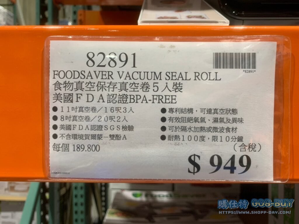 家廚房與居家生活相關 FOODSAVER VACUUM SEAL ROLL 食物真空保存真空捲5入袋 美國FDA認證BPA-FREE #82891 By 網站小編 2022 年 2 月 26 日 303 產品資訊 產品資訊 產品名稱 FOODSAVER VACUUM SEAL ROLL 食物真空保存真空捲5入袋 美國FDA認證BPA-FREE #82891 價格 949 產地 韓國 包裝規格 五入 保存期限 N/A 備註 11吋真空卷 /16呎3入8吋真空卷 /20呎2入美國FDA認證 SGS檢驗不含環境賀爾蒙 雙酚A專利結構 可達真空狀態有效阻絕氧氣 濕氣及異味可於隔水加熱或微波食材耐熱100度 限10分鐘※可搭配賣場販賣之真空機使用(請點我) →商品問題回報← 相關 標籤保鮮真空袋 前一篇文章RABBIT CORKSCREW SET 5PC RABBIT開瓶器 五件組 #129431下一篇文章FOODSAVER 2合1食物真空密鮮器#121730 網站小編https://shopp-day.com[td_block_7 block_template_id="td_block_template_8" custom_title="大家也在找" border_color="#81d742" category_id="_current_tag"] 或許你也感興趣 價格優惠資訊 2025好市多客製生日蛋糕價格表 價格優惠資訊 好市多Line社群加入方法 保健品&藥品 新甘木堅胃腸藥顆粒40包 #194496 購仕特-CosBuy 查詢排行 價格優惠資訊 2025好市多客製生日蛋糕價格表 價格優惠資訊 好市多Line社群加入方法 保健品&藥品 新甘木堅胃腸藥顆粒40包 #194496 價格優惠資訊 2025好市多會員護照-春季專案商品一覽表 價格優惠資訊 好市多美國牛肉整箱銷售價格表(2024/5/7) 裝載更多 熱門推薦 廚房與居家生活相關 普拿疼伏冒熱飲20包 #84499 廚房與居家生活相關 DOMAINE DE LA BAUME 波姆酒莊金牌FITOU紅酒 #121971 廚房與居家生活相關 SIMON LI三人座牛皮沙發#1695608 廚房與居家生活相關 TAISHO大正胃腸藥顆粒52包 #126969 廚房與居家生活相關 IDEA NUOVA 摺疊椅 #1393843 裝載更多