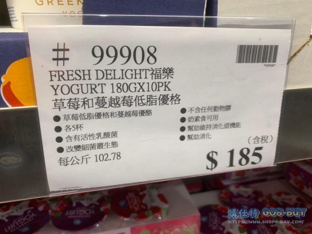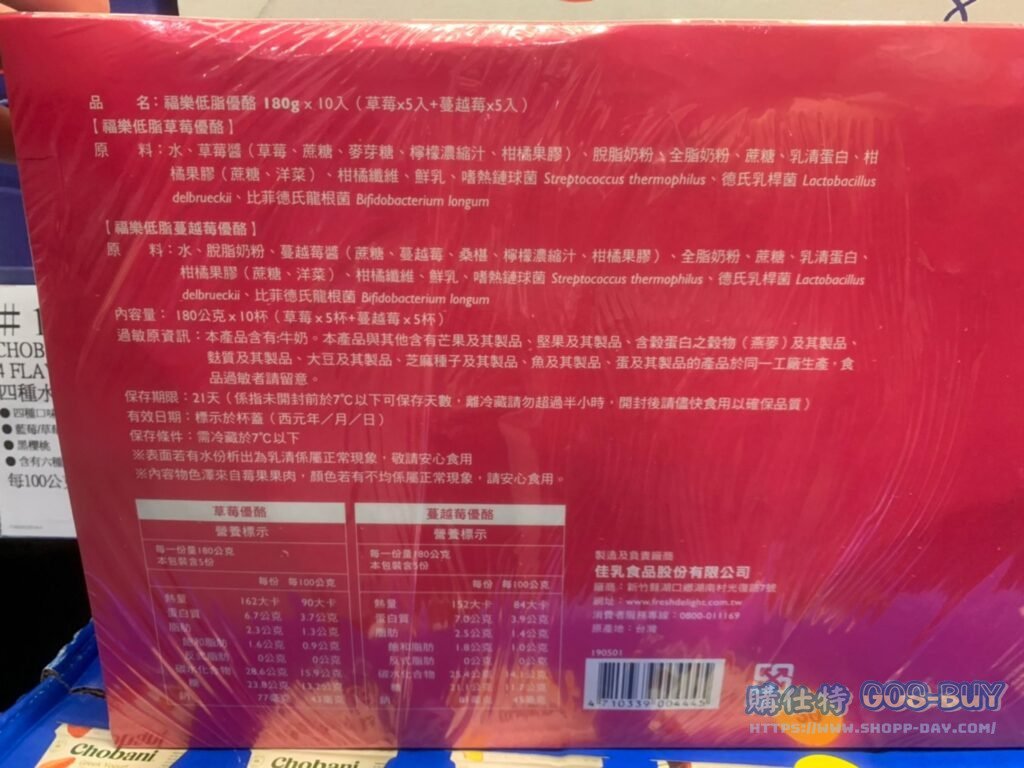 家食品麵包類乳酪 FRESH DELIGHT福樂 YOGURT 180G X 10PK 草莓和蔓越莓低脂優格 #99908 By 網站小編 2022 年 3 月 8 日 555 產品資訊 產品資訊 產品名稱FRESH DELIGHT福樂 YOGURT 180G X 10PK 草莓和蔓越莓低脂優格 #99908價格185產地台灣包裝規格兩種口味各五杯保存期限21天備註草莓低脂優格和蔓越莓優格各五杯不含有任何動物膠含有活性乳酸菌奶素可用改變細菌叢生態幫助維持消化機能 幫助消化→商品問題回報← 相關 標籤低脂優格福樂草莓蔓越莓 前一篇文章BINGGRAE草莓牛奶(保久調味乳) #298720下一篇文章TAI-MEI FARM 台美牧場 CAGE FREE EGGS M 30CT 平飼(非籠飼)洗選雞蛋 #135781 網站小編https://shopp-day.com 或許你也感興趣 價格優惠資訊 2025好市多客製生日蛋糕價格表 價格優惠資訊 好市多Line社群加入方法 保健品&藥品 新甘木堅胃腸藥顆粒40包 #194496 購仕特-CosBuy 查詢排行 價格優惠資訊 2025好市多客製生日蛋糕價格表 價格優惠資訊 好市多Line社群加入方法 保健品&藥品 新甘木堅胃腸藥顆粒40包 #194496 價格優惠資訊 2025好市多會員護照-春季專案商品一覽表 價格優惠資訊 好市多美國牛肉整箱銷售價格表(2024/5/7) 裝載更多 熱門推薦 價格優惠資訊 2025好市多客製生日蛋糕價格表 價格優惠資訊 好市多美國牛肉整箱銷售價格表(2024/5/7) 價格優惠資訊 好市多日本和牛價格表 2024.4.29更新 冷藏食品 美國特選無骨牛小排火鍋片#25737 冷藏食品 舊振南英式馬芬米福堡#143387 裝載更多