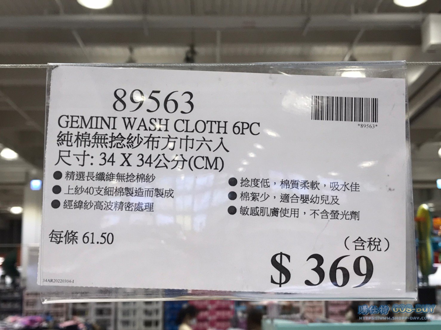 家服飾類配件類兒童 GEMINI純棉無捻紗布方巾六入 #89563 By 網站小編 2022 年 6 月 7 日 202 產品資訊 產品資訊 產品名稱 GEMINI WASH CLOTH 6PC 純棉無捻紗布方巾六入 尺寸:34X34公分 #89563 價格 369 產地 中國 包裝規格 六入組(尺寸:34X34公分) 保存期限 N/A 備註 精選長纖維無捻棉紗上紗40支細綿製造而製成經緯紗高波精密處裡捻度低,棉質柔軟,吸水佳棉絮少,適合嬰幼兒及敏感肌膚使用,不含螢光劑 →商品問題回報← 相關 標籤GEMINI嬰兒嬰兒用品方巾 前一篇文章睡綿綿雙人雙面日式睡墊#123314下一篇文章CASA單人乳膠床墊 #38429 網站小編https://shopp-day.com 或許你也感興趣 價格優惠資訊 2025好市多客製生日蛋糕價格表 價格優惠資訊 好市多Line社群加入方法 保健品&藥品 新甘木堅胃腸藥顆粒40包 #194496 購仕特-CosBuy 查詢排行 價格優惠資訊 2025好市多客製生日蛋糕價格表 價格優惠資訊 好市多Line社群加入方法 保健品&藥品 新甘木堅胃腸藥顆粒40包 #194496 價格優惠資訊 2025好市多會員護照-春季專案商品一覽表 價格優惠資訊 好市多美國牛肉整箱銷售價格表(2024/5/7) 裝載更多 熱門推薦 廚房與居家生活相關 普拿疼伏冒熱飲20包 #84499 廚房與居家生活相關 DOMAINE DE LA BAUME 波姆酒莊金牌FITOU紅酒 #121971 廚房與居家生活相關 SIMON LI三人座牛皮沙發#1695608 廚房與居家生活相關 TAISHO大正胃腸藥顆粒52包 #126969 廚房與居家生活相關 IDEA NUOVA 摺疊椅 #1393843 裝載更多