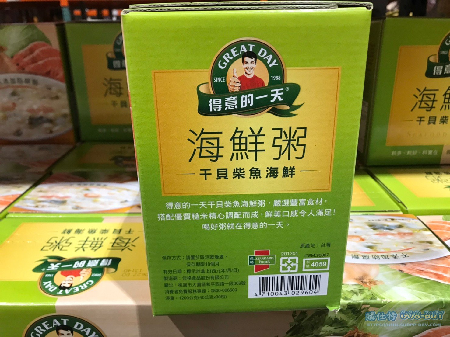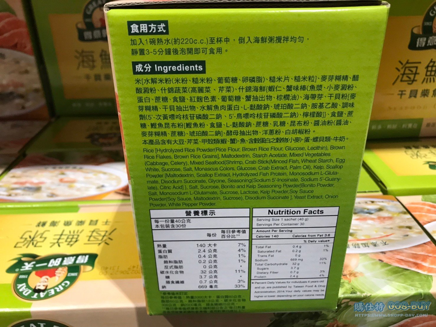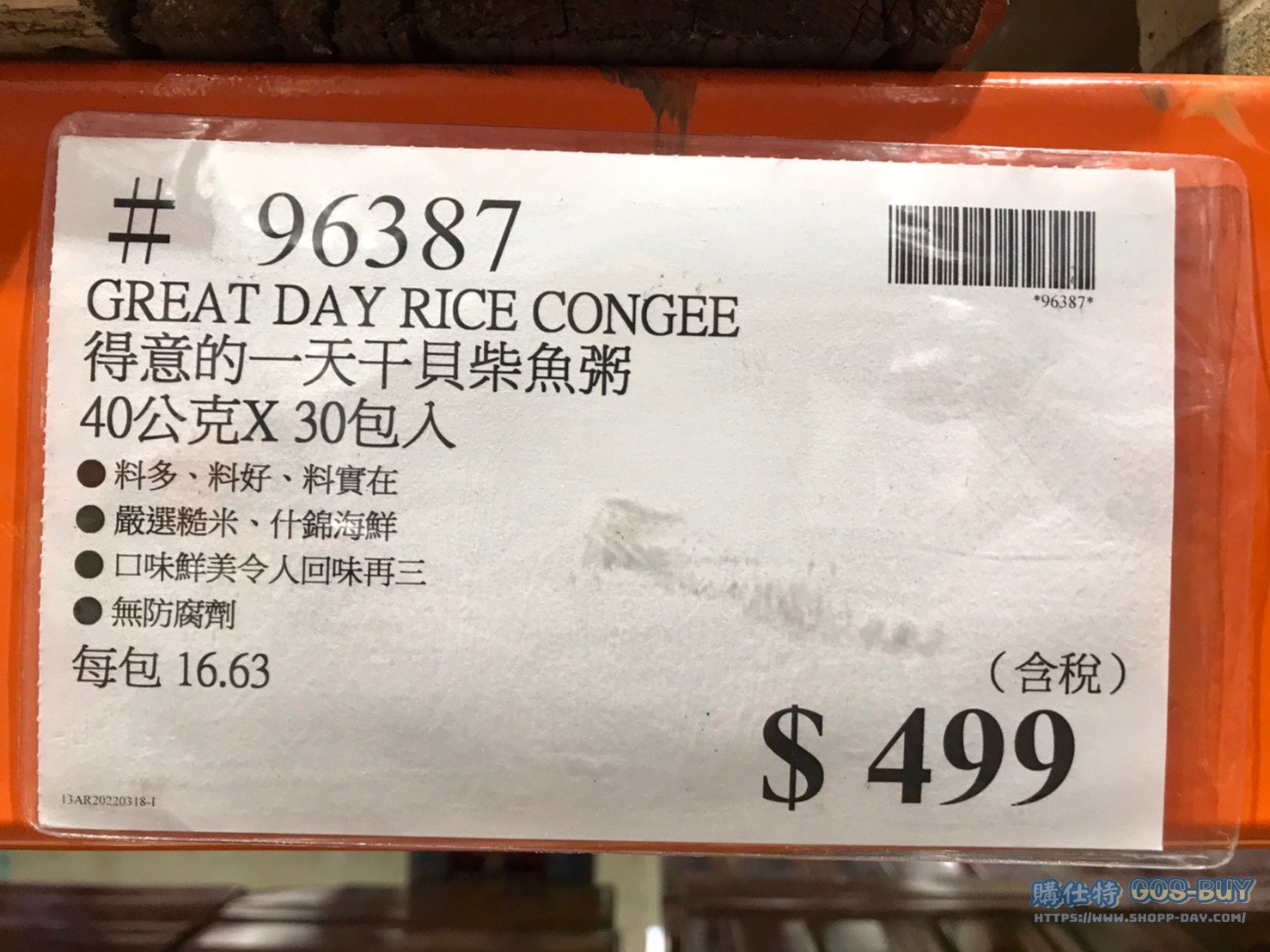 家食品麵包類即溶現泡類 得意的一天干貝柴魚粥 40公克X30包入 #96387 By 網站小編 2022 年 5 月 5 日 217 產品資訊 產品資訊 產品名稱GREAT DAY RICE CONGEE 得意的一天干貝柴魚粥 40公克X30包入 #96387價格499產地台灣包裝規格40公克 X 30包保存期限18個月備註料多、料好、料實在嚴選糙米、什錦海鮮口感鮮美令人回味再三無防腐劑→商品問題回報← 相關 標籤干貝得意的一天柴魚桂格粥 前一篇文章科克蘭100%楓糖漿#854360下一篇文章YAMAKI MENTSUYU SOY SAUCE 鰹魚醬油風味調味汁 1.8公升 #503496 網站小編https://shopp-day.com 或許你也感興趣 價格優惠資訊 2025好市多客製生日蛋糕價格表 價格優惠資訊 好市多Line社群加入方法 保健品&藥品 新甘木堅胃腸藥顆粒40包 #194496 購仕特-CosBuy 查詢排行 價格優惠資訊 2025好市多客製生日蛋糕價格表 價格優惠資訊 好市多Line社群加入方法 保健品&藥品 新甘木堅胃腸藥顆粒40包 #194496 價格優惠資訊 2025好市多會員護照-春季專案商品一覽表 價格優惠資訊 好市多美國牛肉整箱銷售價格表(2024/5/7) 裝載更多 熱門推薦 價格優惠資訊 2025好市多客製生日蛋糕價格表 價格優惠資訊 好市多美國牛肉整箱銷售價格表(2024/5/7) 價格優惠資訊 好市多日本和牛價格表 2024.4.29更新 冷藏食品 美國特選無骨牛小排火鍋片#25737 冷藏食品 舊振南英式馬芬米福堡#143387 裝載更多