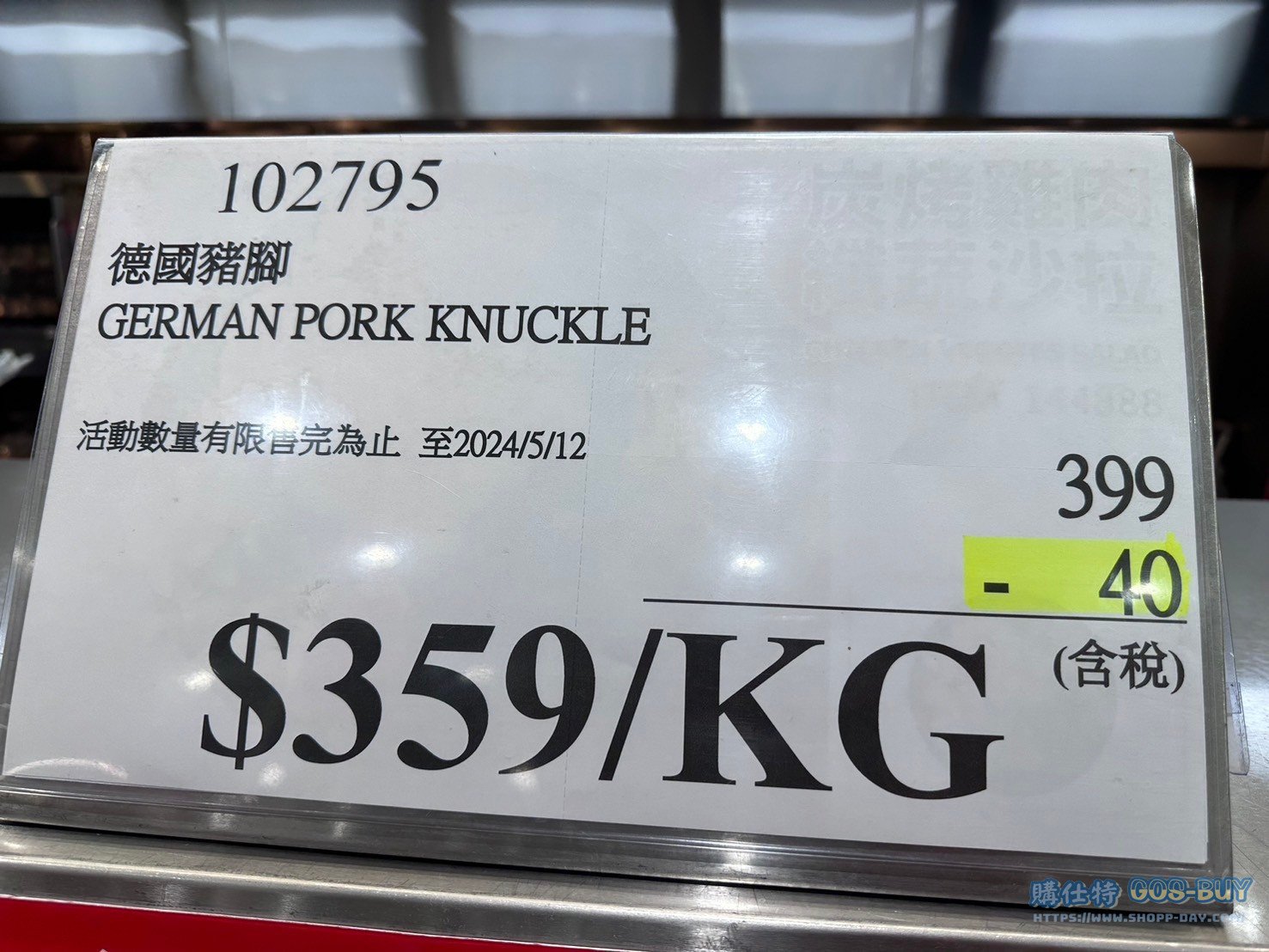 家食品麵包類熟食區商品 德國豬腳#102795 By 網站小編 2022 年 4 月 16 日 684 產品資訊 產品資訊 產品名稱 GERMAN PORK KNUCKLE 德國豬腳 #102795 價格 399/KG 產地 台灣 包裝規格 依包裝所示 保存期限 依包裝所示 備註 多種蔬菜燉煮8小時再以高溫燒烤而成外皮酥脆肉質軟嫩不油豬肉原產地:豬腳(荷蘭、加拿大)2022/6/20查價價格由399/KG漲價為419/KG漲價20/KG元2024/5/3查價價格由419/KG降價為399/KG降價20/KG元 →商品問題回報← 相關 標籤熟食區豬腳 前一篇文章美式辣雞翅&翅小腿#886466下一篇文章CANTONESE BARBECUE PORK 港式蜜汁叉燒肉 #138888 網站小編https://shopp-day.com 或許你也感興趣 價格優惠資訊 2025好市多客製生日蛋糕價格表 價格優惠資訊 好市多Line社群加入方法 保健品&藥品 新甘木堅胃腸藥顆粒40包 #194496 購仕特-CosBuy 查詢排行 價格優惠資訊 2025好市多客製生日蛋糕價格表 價格優惠資訊 好市多Line社群加入方法 保健品&藥品 新甘木堅胃腸藥顆粒40包 #194496 價格優惠資訊 2025好市多會員護照-春季專案商品一覽表 價格優惠資訊 好市多美國牛肉整箱銷售價格表(2024/5/7) 裝載更多 熱門推薦 價格優惠資訊 2025好市多客製生日蛋糕價格表 價格優惠資訊 好市多美國牛肉整箱銷售價格表(2024/5/7) 價格優惠資訊 好市多日本和牛價格表 2024.4.29更新 冷藏食品 美國特選無骨牛小排火鍋片#25737 冷藏食品 舊振南英式馬芬米福堡#143387 裝載更多