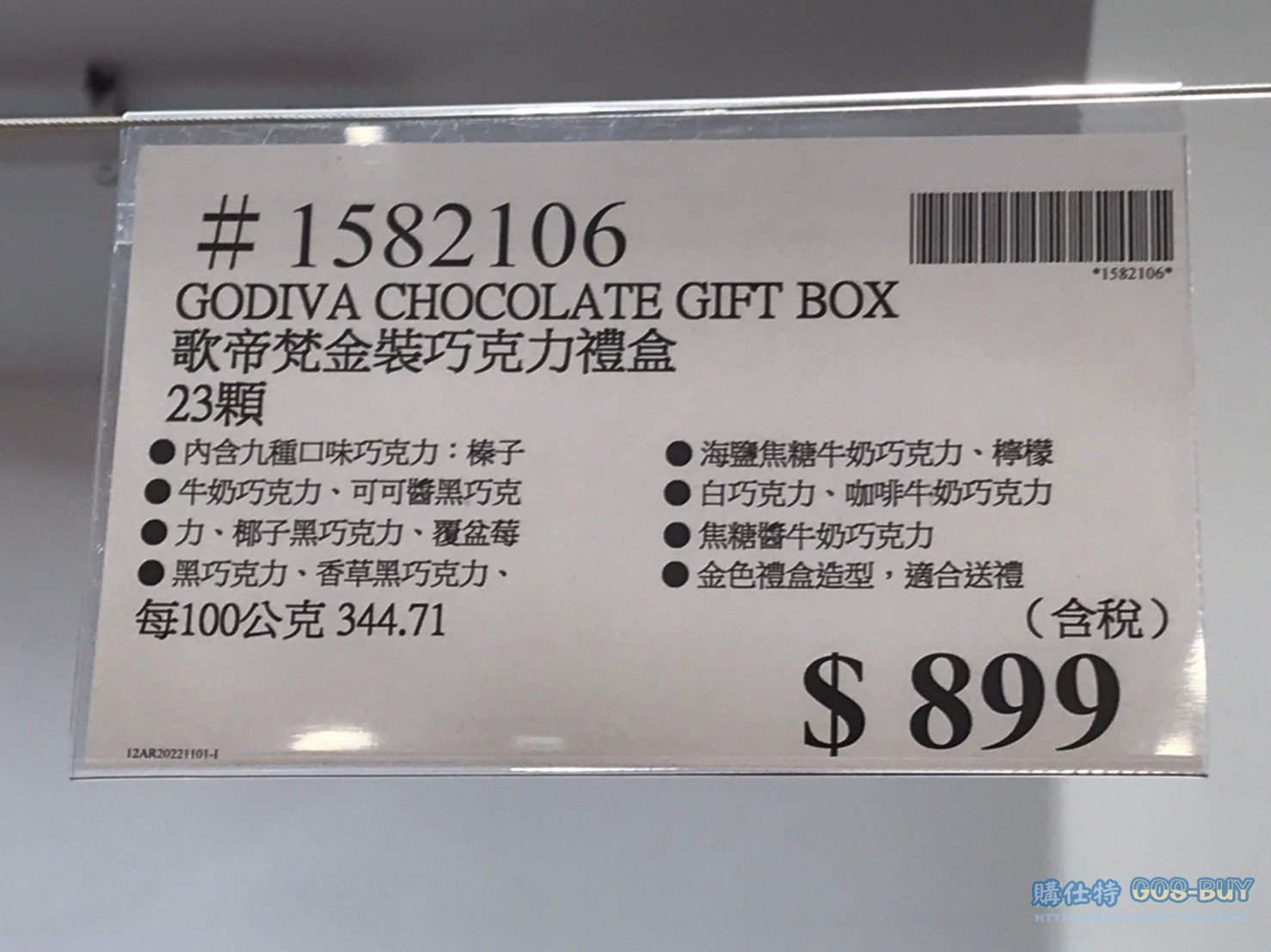 | 備註 | 內含九種口味巧克力: 榛子牛奶巧克力、可可醬黑巧克力 椰子黑巧克力、覆盆莓黑巧克力 香草黑巧克力。 海鹽焦糖牛奶巧克力、檸檬白巧克力 咖啡牛奶巧克力、焦糖醬牛奶巧克力 金色禮盒造型,適合送禮 2022/11/7查價價格由999降價為899降價100元 |