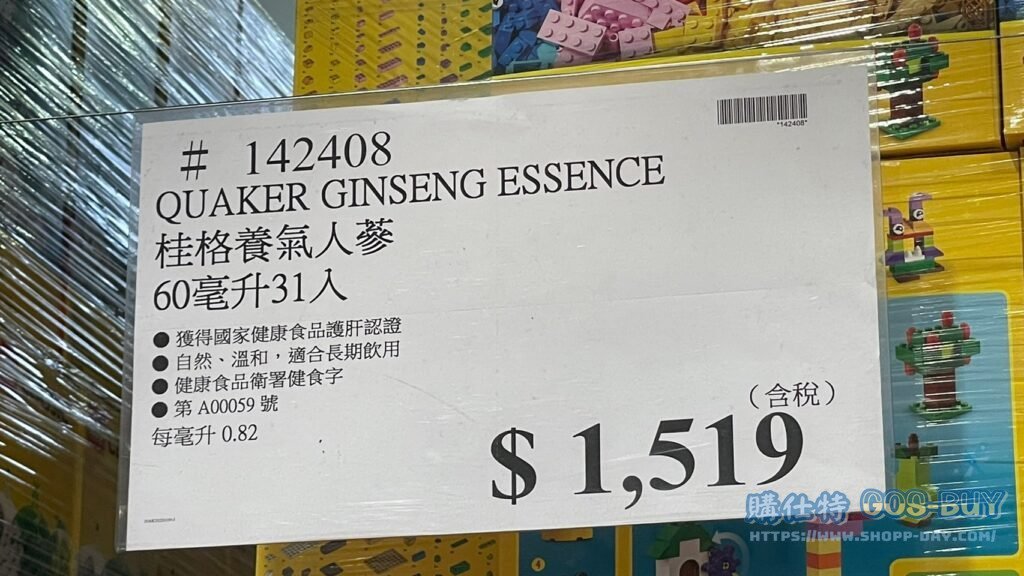 家保健品&藥品 QUAKER GINSENG ESSENCE 桂格養氣人蔘 60毫升31入 #142408 By 網站小編 2022 年 2 月 20 日 484 產品資訊 產品資訊 產品名稱QUAKER GINSENG ESSENCE 桂格養氣人蔘 60毫升31入 #142408價格1519產地台灣包裝規格60毫升 31入保存期限依包裝所示備註獲得國家健康食品護肝認證自然 溫和 適合長期飲用健康食品衛署建字號第A00059號 →商品問題回報← 相關 標籤人蔘桂格 前一篇文章FEIT 23W/T3 SPIRAL LIGHT FEIT 23瓦螺旋省電燈泡 T3管徑每組8入白光 #120988下一篇文章WU PAO CHUN 吳寶春麥方店 無嫌雙鳳禮/鳳梨酥30G 鳳黃酥40G 各10入 #129018 網站小編https://shopp-day.com 或許你也感興趣 價格優惠資訊 2025好市多客製生日蛋糕價格表 價格優惠資訊 好市多Line社群加入方法 保健品&藥品 新甘木堅胃腸藥顆粒40包 #194496 購仕特-CosBuy 查詢排行 價格優惠資訊 2025好市多客製生日蛋糕價格表 價格優惠資訊 好市多Line社群加入方法 保健品&藥品 新甘木堅胃腸藥顆粒40包 #194496 價格優惠資訊 2025好市多會員護照-春季專案商品一覽表 價格優惠資訊 好市多美國牛肉整箱銷售價格表(2024/5/7) 裝載更多 熱門推薦 保健品&藥品 新甘木堅胃腸藥顆粒40包 #194496 保健品&藥品 維骨力膠囊#36999 保健品&藥品 勝昌通骨活絡藥膠布50片 #134721 保健品&藥品 ACUVUE安視優歐舒適每日拋棄式隱形眼鏡(90片裝) #2151100~2151134 保健品&藥品 武田合利他命強效錠EX PLUS#997785 裝載更多