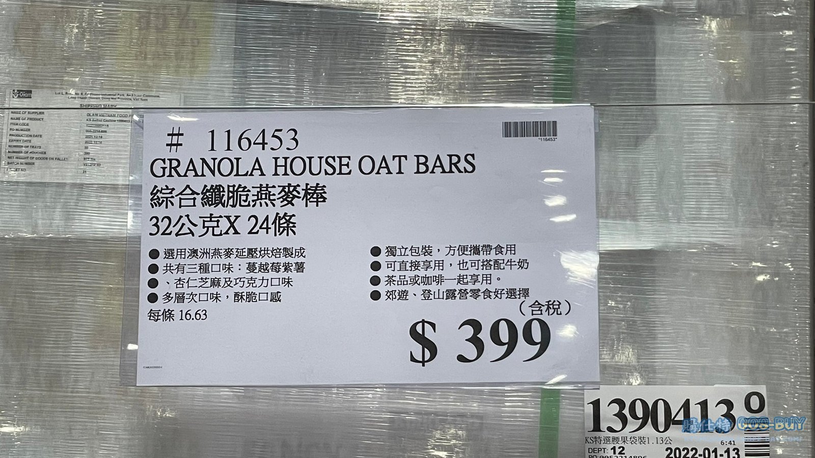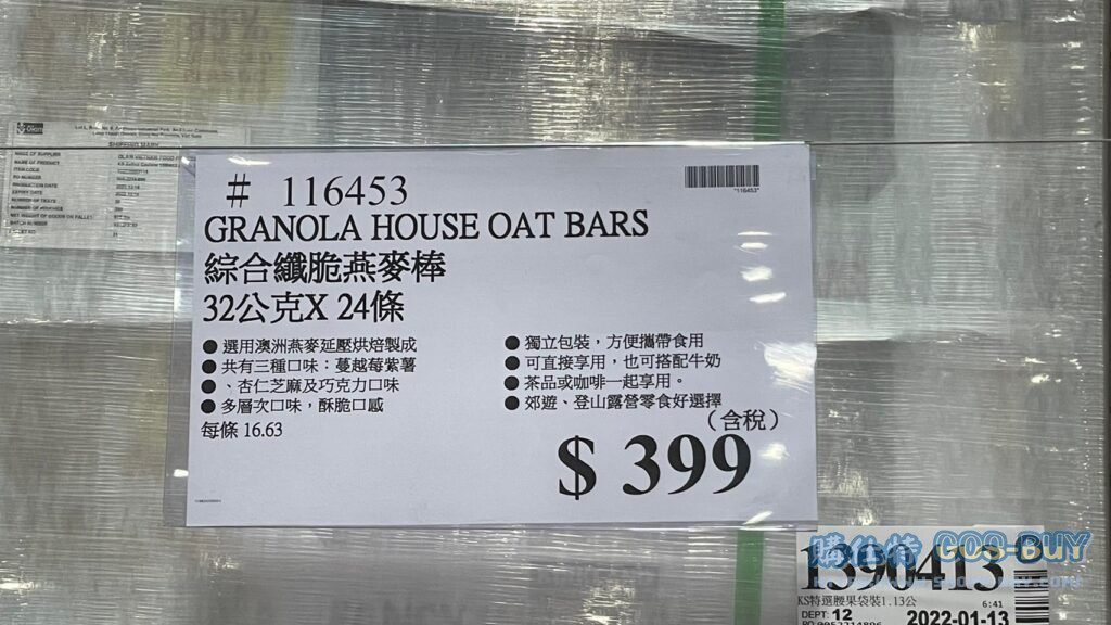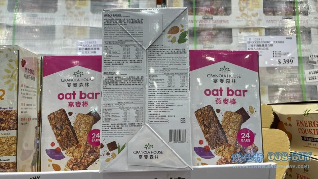 家零食&飲料台灣零食 GRANOLA綜合纖脆燕麥棒#116453 By 網站小編 2022 年 3 月 10 日 182 產品資訊 產品資訊 產品名稱GRANOLA HOUSE OAT BARS 綜合纖脆燕麥棒 32公克X24條 #116453價格399產地台灣包裝規格32公克X24條保存期限12個月備註宴麥森林選用澳洲燕麥延壓烘焙製成共有三種口味:蔓越莓紫薯、杏仁芝麻及巧克力口味多層次口味,酥脆口感獨立包裝,方便攜帶食用可直接享用,也可搭配牛奶茶品或咖啡一起享用郊遊、登山露營零食好選擇→商品問題回報← 相關 標籤GRANOLA燕麥燕麥棒綜合 前一篇文章愛之味純濃燕麥(原味) 每瓶340毫升X12入 #97313下一篇文章MACSPORTS XL FOLDING WAGON 全地形XL折疊式拖車 最大承載量136公斤(2021年款) #2622069 網站小編https://shopp-day.com 或許你也感興趣 價格優惠資訊 2025好市多客製生日蛋糕價格表 價格優惠資訊 好市多Line社群加入方法 保健品&藥品 新甘木堅胃腸藥顆粒40包 #194496 購仕特-CosBuy 查詢排行 價格優惠資訊 2025好市多客製生日蛋糕價格表 價格優惠資訊 好市多Line社群加入方法 保健品&藥品 新甘木堅胃腸藥顆粒40包 #194496 價格優惠資訊 2025好市多會員護照-春季專案商品一覽表 價格優惠資訊 好市多美國牛肉整箱銷售價格表(2024/5/7) 裝載更多 熱門推薦 美國零食 科克蘭葡萄乾巧克力#959987 冷藏飲品 BLUE DIAMOND 無糖原味杏仁飲1.89L #129794 西班牙零食 MR.BROWNIE 巧克力布郎尼#153753 泰國零食 A&R牛奶巧克力迷你甜筒餅乾#1744884 比利時零食 科克蘭烈酒與波特酒巧克力 #1351451 裝載更多