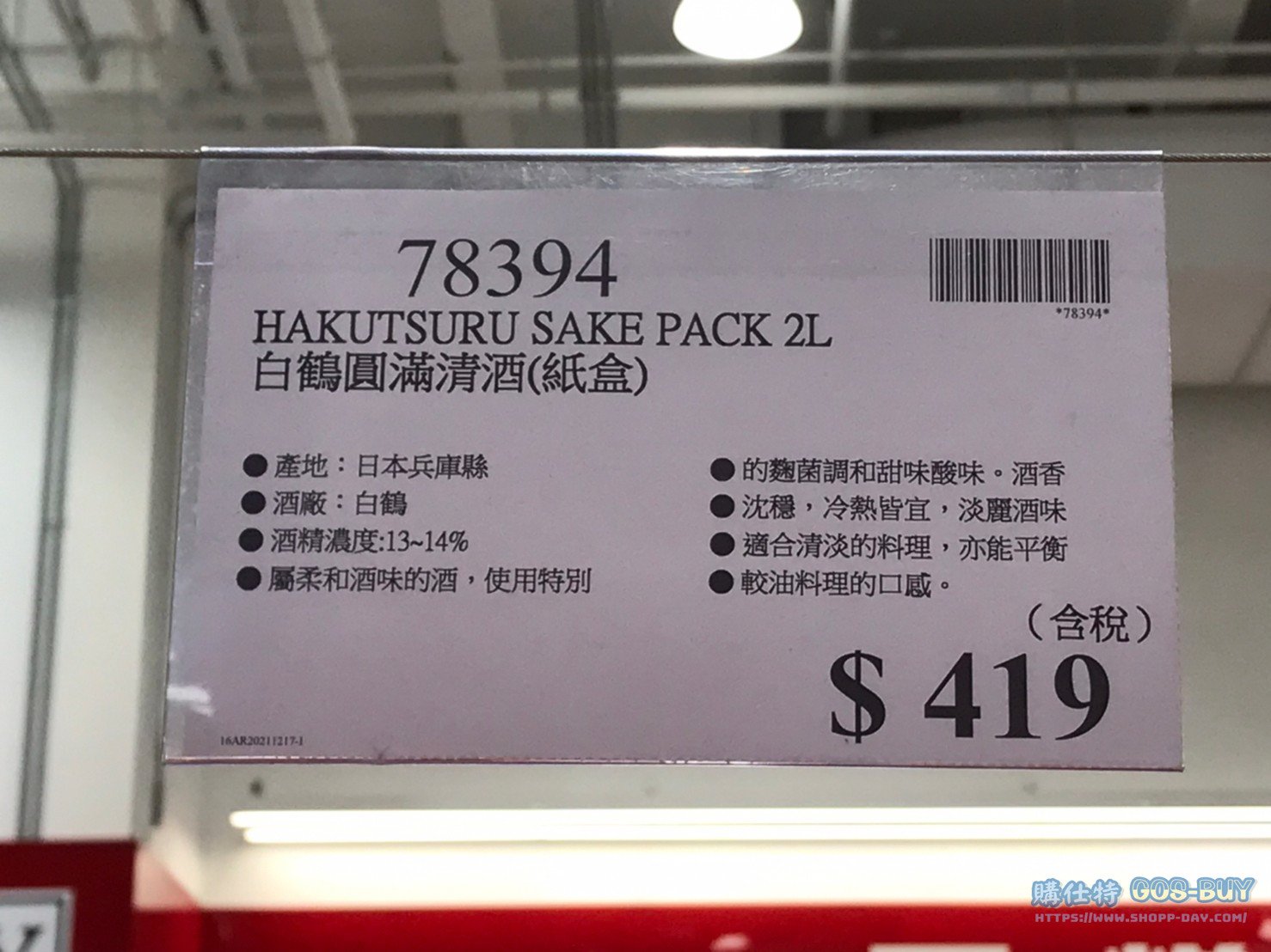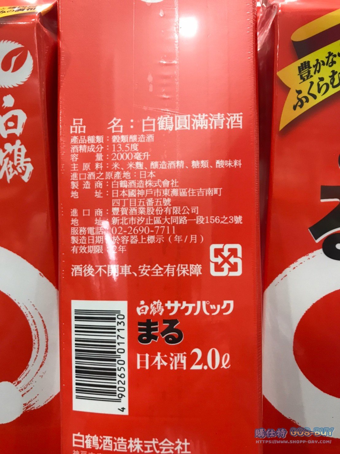 家酒品類清酒 白鶴圓滿清酒(紙盒) #78394 By 網站小編 2022 年 5 月 6 日 2134 產品資訊 產品資訊 產品名稱HAKUTSURU SAKE PACK 2L 白鶴圓滿清酒(紙盒) #78394價格419產地日本包裝規格一入 2L保存期限2年備註產地:日本兵庫縣酒產:白鶴酒精濃度:13~14%屬柔和酒味的酒,使用特別的麴菌調和甜味酸味。酒香沉穩、冷熱皆宜、淡麗酒味適合清淡的料理、亦能平衡較油料理的口感。→商品問題回報← 相關 標籤清酒白鶴圓 前一篇文章科克蘭陳釀龍舌蘭酒1L #1327189下一篇文章HAAGEN DAZS 哈根達斯冰淇淋五入組 #126800 網站小編https://shopp-day.com 或許你也感興趣 價格優惠資訊 2025好市多客製生日蛋糕價格表 價格優惠資訊 好市多Line社群加入方法 保健品&藥品 新甘木堅胃腸藥顆粒40包 #194496 購仕特-CosBuy 查詢排行 價格優惠資訊 2025好市多客製生日蛋糕價格表 價格優惠資訊 好市多Line社群加入方法 保健品&藥品 新甘木堅胃腸藥顆粒40包 #194496 價格優惠資訊 2025好市多會員護照-春季專案商品一覽表 價格優惠資訊 好市多美國牛肉整箱銷售價格表(2024/5/7) 裝載更多 熱門推薦 威士忌 KAVALAN噶瑪蘭調酒師精選威士忌#129555 其他酒類 日本芒果梅酒#143982 葡萄酒 1865 卡貝納蘇維翁紅酒750ML 2019/2020 #113198 威士忌 KAVAKAN 噶瑪蘭威士忌酒展商品一覽表 葡萄酒 波姆酒莊琥珀金牌紅酒#125623 裝載更多