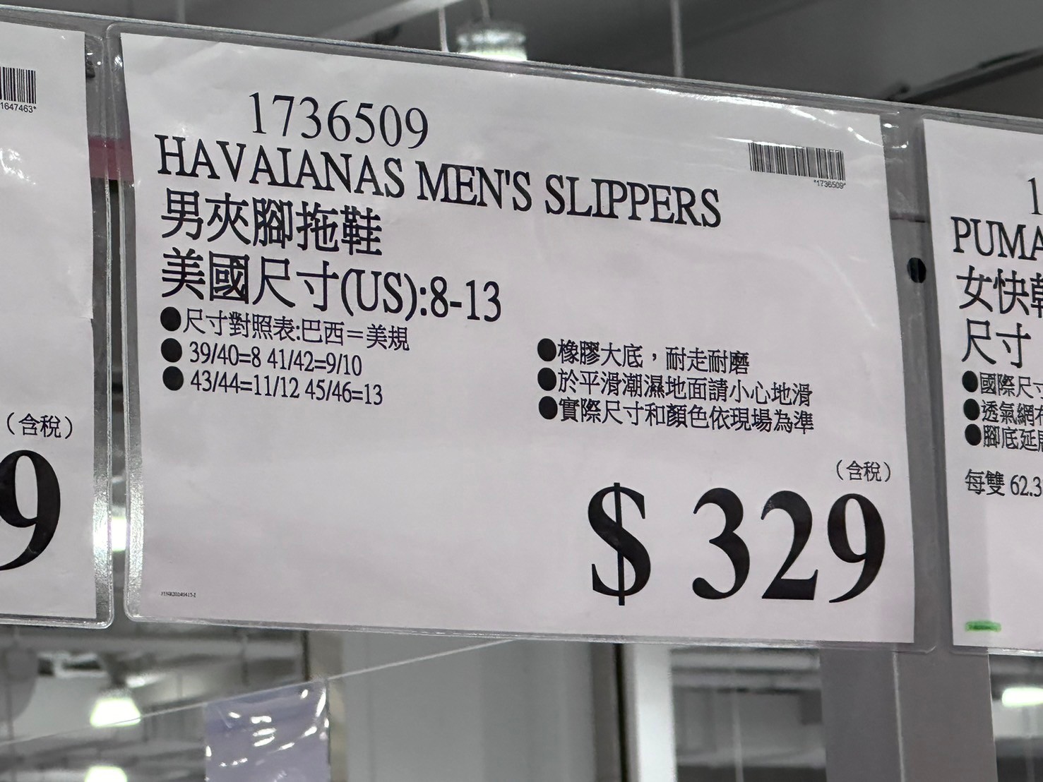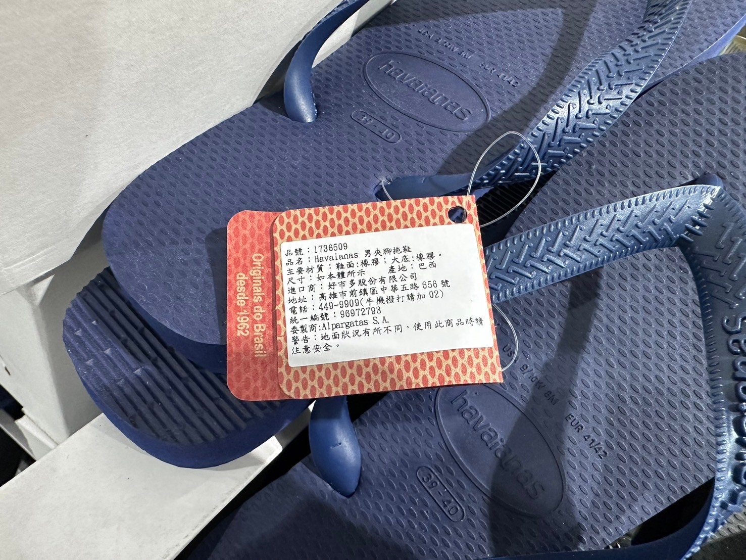 家廚房與居家生活相關 HAVAIANAS 男夾腳拖鞋#1736509 By 網站小編 2024 年 5 月 1 日 118 產品資訊 產品資訊 產品名稱HAVAIANAS MEN’S SLIPPERS 男夾腳拖鞋 美國尺寸(US):8-13#1736509價格329產地巴西包裝規格一雙 美國尺寸(US):8-13保存期限N/A備註尺寸對照表:巴西=美規39/40=8、41/42=9/10、43/44=11/12、45/46=13。橡膠大底、耐走耐磨,於平滑潮濕地面請小心地滑。→商品問題回報← 相關 標籤HAVAIANAS夾腳拖鞋拖鞋男生拖鞋 前一篇文章E.D.SMITH 有機野生藍莓果醬#140280下一篇文章HAVAIANAS 女夾腳拖鞋#1647463 網站小編https://shopp-day.com 或許你也感興趣 價格優惠資訊 2025好市多客製生日蛋糕價格表 價格優惠資訊 好市多Line社群加入方法 保健品&藥品 新甘木堅胃腸藥顆粒40包 #194496 購仕特-CosBuy 查詢排行 價格優惠資訊 2025好市多客製生日蛋糕價格表 價格優惠資訊 好市多Line社群加入方法 保健品&藥品 新甘木堅胃腸藥顆粒40包 #194496 價格優惠資訊 2025好市多會員護照-春季專案商品一覽表 價格優惠資訊 好市多美國牛肉整箱銷售價格表(2024/5/7) 裝載更多 熱門推薦 廚房與居家生活相關 普拿疼伏冒熱飲20包 #84499 廚房與居家生活相關 DOMAINE DE LA BAUME 波姆酒莊金牌FITOU紅酒 #121971 廚房與居家生活相關 SIMON LI三人座牛皮沙發#1695608 廚房與居家生活相關 TAISHO大正胃腸藥顆粒52包 #126969 廚房與居家生活相關 IDEA NUOVA 摺疊椅 #1393843 裝載更多