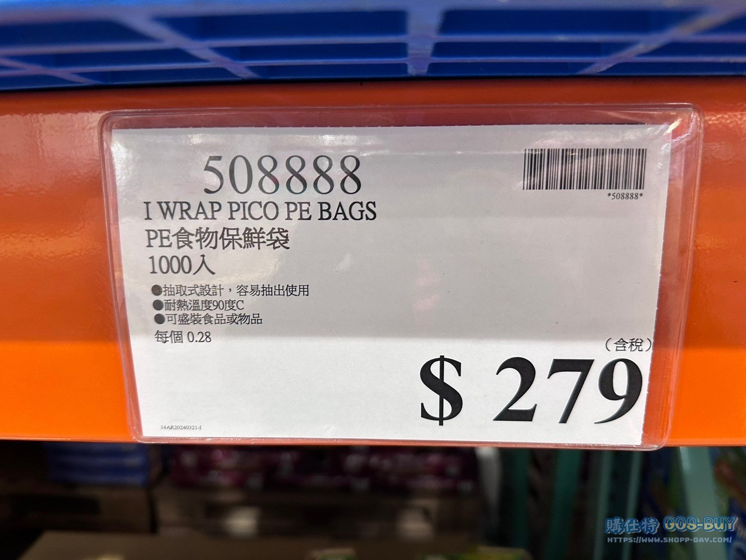 家廚房與居家生活相關 I WRAP PICO 食物保鮮袋1000入#508888 By 網站小編 2022 年 3 月 13 日 408 產品資訊 產品資訊 產品名稱I WRAP PICO PE BAGS PE食物保鮮袋1000入 #508888價格279產地日本包裝規格1000入保存期限五年備註抽取式設計,容易抽出使用耐熱溫度90度C可盛裝食品或物品每袋30公分X20公分2022/10/26查價價格由299降價為269降價30元2024/5/4查價價格由269漲價為279漲價10元→商品問題回報← 相關 標籤I WRAP PICO保鮮袋 前一篇文章EZ’N DISPOSABLE GLOVES 拋棄式塑膠手套 600入 #617166下一篇文章CHILEAN PLUM 智利蜜李 1.8公斤 #35238 網站小編https://shopp-day.com 或許你也感興趣 價格優惠資訊 2025好市多客製生日蛋糕價格表 價格優惠資訊 好市多Line社群加入方法 保健品&藥品 新甘木堅胃腸藥顆粒40包 #194496 購仕特-CosBuy 查詢排行 價格優惠資訊 2025好市多客製生日蛋糕價格表 價格優惠資訊 好市多Line社群加入方法 保健品&藥品 新甘木堅胃腸藥顆粒40包 #194496 價格優惠資訊 2025好市多會員護照-春季專案商品一覽表 價格優惠資訊 好市多美國牛肉整箱銷售價格表(2024/5/7) 裝載更多 熱門推薦 廚房與居家生活相關 普拿疼伏冒熱飲20包 #84499 廚房與居家生活相關 DOMAINE DE LA BAUME 波姆酒莊金牌FITOU紅酒 #121971 廚房與居家生活相關 SIMON LI三人座牛皮沙發#1695608 廚房與居家生活相關 TAISHO大正胃腸藥顆粒52包 #126969 廚房與居家生活相關 IDEA NUOVA 摺疊椅 #1393843 裝載更多