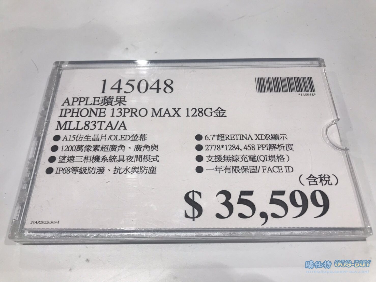家電子產品手機 IPHONE 蘋果 13PRO MAX 128G 金 MILL83TA/A #145048 By 網站小編 2022 年 4 月 6 日 292 產品資訊 產品資訊 產品名稱IPHONE 蘋果 13PRO MAX 128G 金 MILL83TA/A #145048價格35599產地中國包裝規格一入保存期限保固一年備註A15仿生晶片/OLED螢幕1200萬像素超廣角廣角與望遠三相機系統具夜間模式IP68等級防潑、抗水與防塵6.7″超RETINA XDR顯示2778*1284, 458 PPI解析度支援無線充電(QI規格)一年保固/FACE ID→商品問題回報← 相關 標籤IPHONE蘋果系列 前一篇文章APPLE 蘋果 IPHONE 13 128G 午夜黑 #145009 星光白 #145010下一篇文章APPLE 蘋果 AIRPODS MAX 主動降噪外罩式耳機太空灰 #131040 網站小編https://shopp-day.com 或許你也感興趣 價格優惠資訊 2025好市多客製生日蛋糕價格表 價格優惠資訊 好市多Line社群加入方法 保健品&藥品 新甘木堅胃腸藥顆粒40包 #194496 購仕特-CosBuy 查詢排行 價格優惠資訊 2025好市多客製生日蛋糕價格表 價格優惠資訊 好市多Line社群加入方法 保健品&藥品 新甘木堅胃腸藥顆粒40包 #194496 價格優惠資訊 2025好市多會員護照-春季專案商品一覽表 價格優惠資訊 好市多美國牛肉整箱銷售價格表(2024/5/7) 裝載更多 熱門推薦 價格優惠資訊 Costco好市多 iphone14 Pro ProMax 價格表 價格優惠資訊 Costco 好市多 Apple Watch 2022年版價格表 家庭劇院 BOSE兩件式家庭劇院組 #137039 螢幕 MSI 27吋IPS電競螢幕FHD平面/144HZ OPTIX G271 #132273 其他電子產品 MIPRO 手提藍牙無線擴音機MA-708 #118489 裝載更多