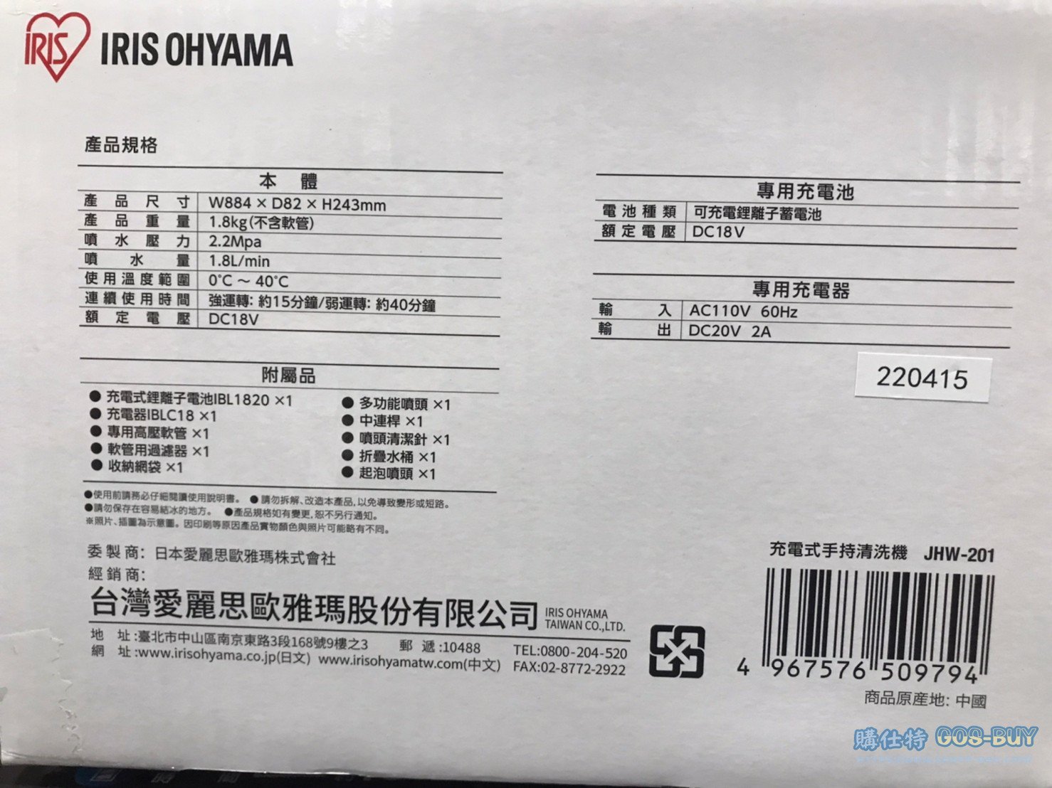 家運動戶外用品汽機車用品 IRIS充電式手持高壓清洗機 JHW-201 #135446 By 網站小編 2022 年 2 月 21 日 236 產品資訊 產品資訊 產品名稱IRIS PRESSURE WASHER 充電式手持高壓清洗機 JHW-201 #135446價格3699產地中國包裝規格一入(型號:JHW-201)保存期限N/A備註充電式設計適用任何地方三種模式噴頭兩種壓力調節詳細配件資料請看包裝外盒 →商品問題回報← 相關 標籤IRIS高壓清洗機 前一篇文章OVER&BACK旋轉點心盤組 #133684下一篇文章WHALEN 五層置物架 尺寸約122X61X183公分 #956873 網站小編https://shopp-day.com 或許你也感興趣 價格優惠資訊 2025好市多客製生日蛋糕價格表 價格優惠資訊 好市多Line社群加入方法 保健品&藥品 新甘木堅胃腸藥顆粒40包 #194496 購仕特-CosBuy 查詢排行 價格優惠資訊 2025好市多客製生日蛋糕價格表 價格優惠資訊 好市多Line社群加入方法 保健品&藥品 新甘木堅胃腸藥顆粒40包 #194496 價格優惠資訊 2025好市多會員護照-春季專案商品一覽表 價格優惠資訊 好市多美國牛肉整箱銷售價格表(2024/5/7) 裝載更多 熱門推薦 戶外用品 12*16′ TARPS 2 PACK 多功能雙色帆布2入#1600091 園藝相關 好市多花束價格 #111590 #136064 #117849 #28013 旅行用品類 SAMSONITE 22+29吋行李箱二入組#140918 戶外用品 COHO 156公升冰桶 適合露營、釣魚 #1382241 汽機車用品 MICHELIN 米其林18吋輪胎PRIMACY SUV+輪胎 235/60 R18 103V #136585 裝載更多