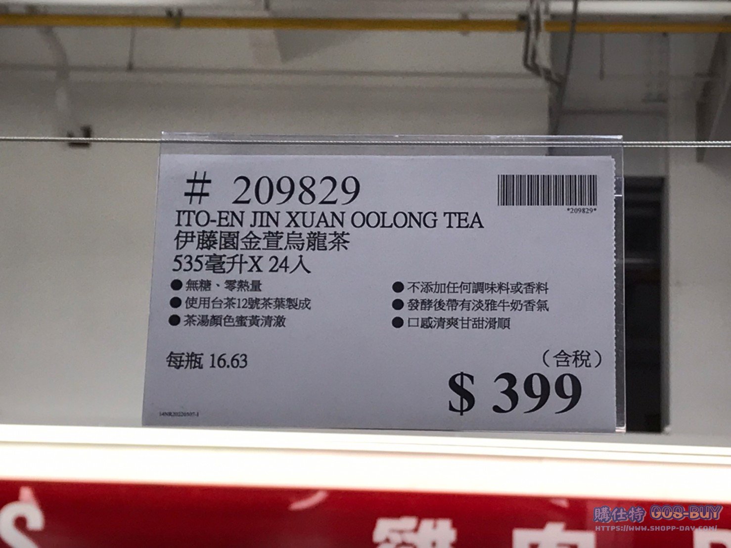 家零食&飲料 伊藤園金萱烏龍茶 #209829 By 網站小編 2022 年 5 月 24 日 330 產品資訊 產品資訊 產品名稱ITO-EN JIN XUAN OOLONG TEA 伊藤園金萱烏龍茶535毫升X24入 #209829價格399產地台灣包裝規格535毫升X24入保存期限12個月備註無糖、零熱量使用台茶12號茶葉製成茶湯顏色蜜黃清澈不添加任何調味料或香料發酵後帶有淡雅牛奶香氣口感清爽甘甜滑順→商品問題回報← 相關 標籤伊藤園烏龍茶 前一篇文章嘉紛娜橙香多酚蔬果汁#111424下一篇文章US STAR RUBY GRAPEFRUIT 美國星紅寶石葡萄柚 2.2公斤 #293362 網站小編https://shopp-day.com 或許你也感興趣 價格優惠資訊 2025好市多客製生日蛋糕價格表 價格優惠資訊 好市多Line社群加入方法 保健品&藥品 新甘木堅胃腸藥顆粒40包 #194496 購仕特-CosBuy 查詢排行 價格優惠資訊 2025好市多客製生日蛋糕價格表 價格優惠資訊 好市多Line社群加入方法 保健品&藥品 新甘木堅胃腸藥顆粒40包 #194496 價格優惠資訊 2025好市多會員護照-春季專案商品一覽表 價格優惠資訊 好市多美國牛肉整箱銷售價格表(2024/5/7) 裝載更多 熱門推薦 美國零食 科克蘭葡萄乾巧克力#959987 冷藏飲品 BLUE DIAMOND 無糖原味杏仁飲1.89L #129794 西班牙零食 MR.BROWNIE 巧克力布郎尼#153753 泰國零食 A&R牛奶巧克力迷你甜筒餅乾#1744884 比利時零食 科克蘭烈酒與波特酒巧克力 #1351451 裝載更多