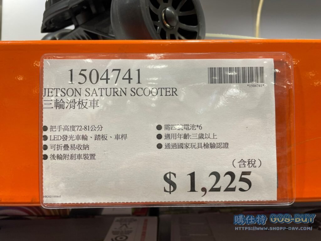 家運動戶外用品戶外用品 JETSON SATURN SCOOTER 三輪滑板車 #1504741 By 網站小編 2022 年 2 月 25 日 338 產品資訊 產品資訊 產品名稱JETSON SATURN SCOOTER 三輪滑板車 #1504741價格1225產地中國包裝規格一入 保存期限N/A備註把手高度72-81公分LED發光車輪 踏板 車桿可折疊易收納後輪附煞車裝置需四號電池*6適用年齡:三歲以上通過國家玩具檢驗認證→商品問題回報← 相關 標籤兒童滑板車 前一篇文章AIRBORNE愛維寶發泡錠 香橙口味30錠 #991355下一篇文章ARM & HAMMER(鐵鎚牌)多功能小蘇打粉 #488431 網站小編https://shopp-day.com 或許你也感興趣 價格優惠資訊 2025好市多客製生日蛋糕價格表 價格優惠資訊 好市多Line社群加入方法 保健品&藥品 新甘木堅胃腸藥顆粒40包 #194496 購仕特-CosBuy 查詢排行 價格優惠資訊 2025好市多客製生日蛋糕價格表 價格優惠資訊 好市多Line社群加入方法 保健品&藥品 新甘木堅胃腸藥顆粒40包 #194496 價格優惠資訊 2025好市多會員護照-春季專案商品一覽表 價格優惠資訊 好市多美國牛肉整箱銷售價格表(2024/5/7) 裝載更多 熱門推薦 戶外用品 12*16′ TARPS 2 PACK 多功能雙色帆布2入#1600091 園藝相關 好市多花束價格 #111590 #136064 #117849 #28013 旅行用品類 SAMSONITE 22+29吋行李箱二入組#140918 戶外用品 COHO 156公升冰桶 適合露營、釣魚 #1382241 汽機車用品 MICHELIN 米其林18吋輪胎PRIMACY SUV+輪胎 235/60 R18 103V #136585 裝載更多