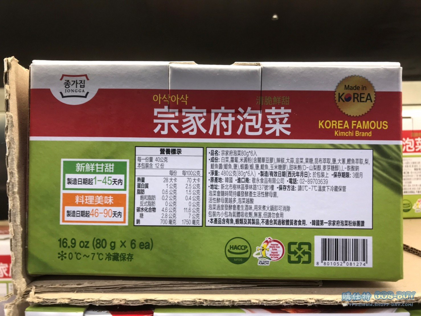 家食品麵包類冷藏食品 JONGGA 宗家府泡菜 80公克6入 #133594 By 網站小編 2022 年 3 月 28 日 921 產品資訊 產品資訊 產品名稱JONGGA 宗家府泡菜 80公克6入 MAT KIMCHI 480G #133594價格259產地韓國包裝規格80公克6入保存期限3個月備註口感鮮脆甘甜,小菜最佳品獨立小包裝方便食用與收藏專利發酵技術使乳酸菌更加的有活性,新鮮香脆時間長。→商品問題回報← 相關 標籤JONGGA宗家府泡菜韓式 前一篇文章AIDELLS 蘋果雞肉煙燻香腸 CHICKEN SAUSAGE 1.36公斤 #134858下一篇文章台灣蒜香羅勒去骨清雞腿 #135776 網站小編https://shopp-day.com 或許你也感興趣 價格優惠資訊 2025好市多客製生日蛋糕價格表 價格優惠資訊 好市多Line社群加入方法 保健品&藥品 新甘木堅胃腸藥顆粒40包 #194496 購仕特-CosBuy 查詢排行 價格優惠資訊 2025好市多客製生日蛋糕價格表 價格優惠資訊 好市多Line社群加入方法 保健品&藥品 新甘木堅胃腸藥顆粒40包 #194496 價格優惠資訊 2025好市多會員護照-春季專案商品一覽表 價格優惠資訊 好市多美國牛肉整箱銷售價格表(2024/5/7) 裝載更多 熱門推薦 價格優惠資訊 2025好市多客製生日蛋糕價格表 價格優惠資訊 好市多美國牛肉整箱銷售價格表(2024/5/7) 價格優惠資訊 好市多日本和牛價格表 2024.4.29更新 冷藏食品 美國特選無骨牛小排火鍋片#25737 冷藏食品 舊振南英式馬芬米福堡#143387 裝載更多