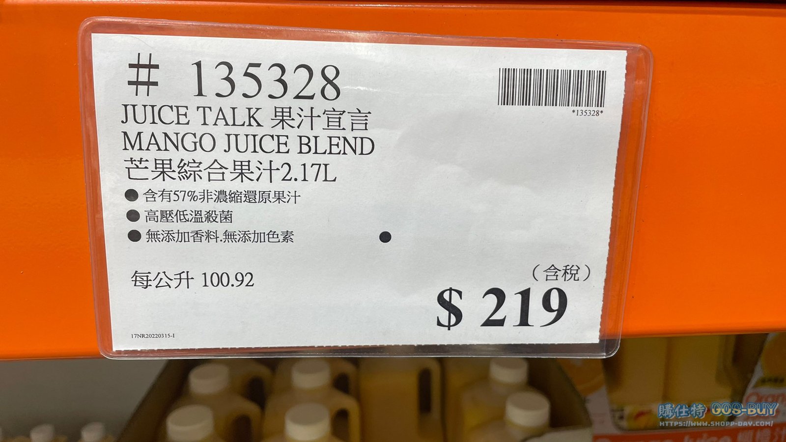 家零食&飲料冷藏飲品 JUICE TALK 果汁宣言 芒果綜合果汁2.17L #135328 By 網站小編 2022 年 4 月 21 日 474 產品資訊 產品資訊 產品名稱JUICE TALK 果汁宣言 MANGO JUICE BLEND 芒果綜合果汁2.17L #135328價格219產地台灣包裝規格2.17L保存期限18天備註含有57%非濃縮還原果汁高壓低溫殺菌無添加香料、無添加色素→商品問題回報← 相關 標籤芒果 前一篇文章YAKULT 養樂多咖啡歐蕾 #131536下一篇文章AU COLOR BABY CARROT 空運澳洲彩色迷你胡蘿蔔 600公克 #397672 網站小編https://shopp-day.com 或許你也感興趣 價格優惠資訊 2025好市多客製生日蛋糕價格表 價格優惠資訊 好市多Line社群加入方法 保健品&藥品 新甘木堅胃腸藥顆粒40包 #194496 購仕特-CosBuy 查詢排行 價格優惠資訊 2025好市多客製生日蛋糕價格表 價格優惠資訊 好市多Line社群加入方法 保健品&藥品 新甘木堅胃腸藥顆粒40包 #194496 價格優惠資訊 2025好市多會員護照-春季專案商品一覽表 價格優惠資訊 好市多美國牛肉整箱銷售價格表(2024/5/7) 裝載更多 熱門推薦 美國零食 科克蘭葡萄乾巧克力#959987 冷藏飲品 BLUE DIAMOND 無糖原味杏仁飲1.89L #129794 西班牙零食 MR.BROWNIE 巧克力布郎尼#153753 泰國零食 A&R牛奶巧克力迷你甜筒餅乾#1744884 比利時零食 科克蘭烈酒與波特酒巧克力 #1351451 裝載更多