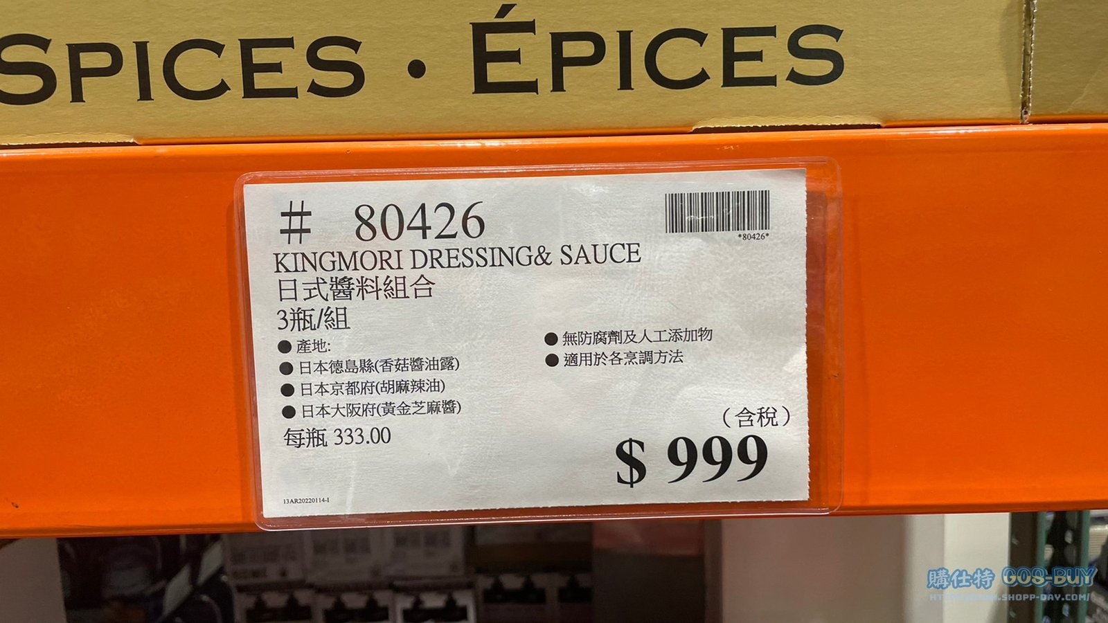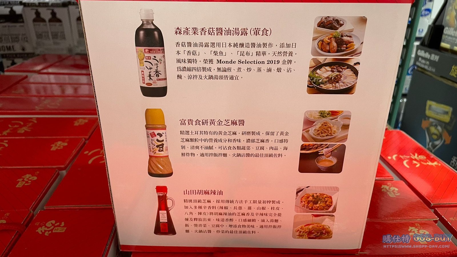 家食品麵包類調味料 KINGMORI DRESSING & SAUCE 日式醬料組合 3瓶/組 #80426 By 網站小編 2022 年 4 月 21 日 290 產品資訊 產品資訊 產品名稱KINGMORI DRESSING & SAUCE 日式醬料組合 3瓶/組 #80426價格999產地日本包裝規格3瓶組保存期限依包裝所示備註日本德島縣(香菇醬油露)日本京都府(胡麻辣油)日本大阪府(黃金芝麻醬)無添加防腐劑及人工添加物適用於各烹調方法→商品問題回報← 相關 標籤日本醬油胡麻油芝麻醬 前一篇文章KEWPIE 日本進口和風醬 1公斤 (WASABI口味) #167117下一篇文章KELLOGG’S家樂氏香甜玉米片 #91610 網站小編https://shopp-day.com 或許你也感興趣 價格優惠資訊 2025好市多客製生日蛋糕價格表 價格優惠資訊 好市多Line社群加入方法 保健品&藥品 新甘木堅胃腸藥顆粒40包 #194496 購仕特-CosBuy 查詢排行 價格優惠資訊 2025好市多客製生日蛋糕價格表 價格優惠資訊 好市多Line社群加入方法 保健品&藥品 新甘木堅胃腸藥顆粒40包 #194496 價格優惠資訊 2025好市多會員護照-春季專案商品一覽表 價格優惠資訊 好市多美國牛肉整箱銷售價格表(2024/5/7) 裝載更多 熱門推薦 價格優惠資訊 2025好市多客製生日蛋糕價格表 價格優惠資訊 好市多美國牛肉整箱銷售價格表(2024/5/7) 價格優惠資訊 好市多日本和牛價格表 2024.4.29更新 冷藏食品 美國特選無骨牛小排火鍋片#25737 冷藏食品 舊振南英式馬芬米福堡#143387 裝載更多