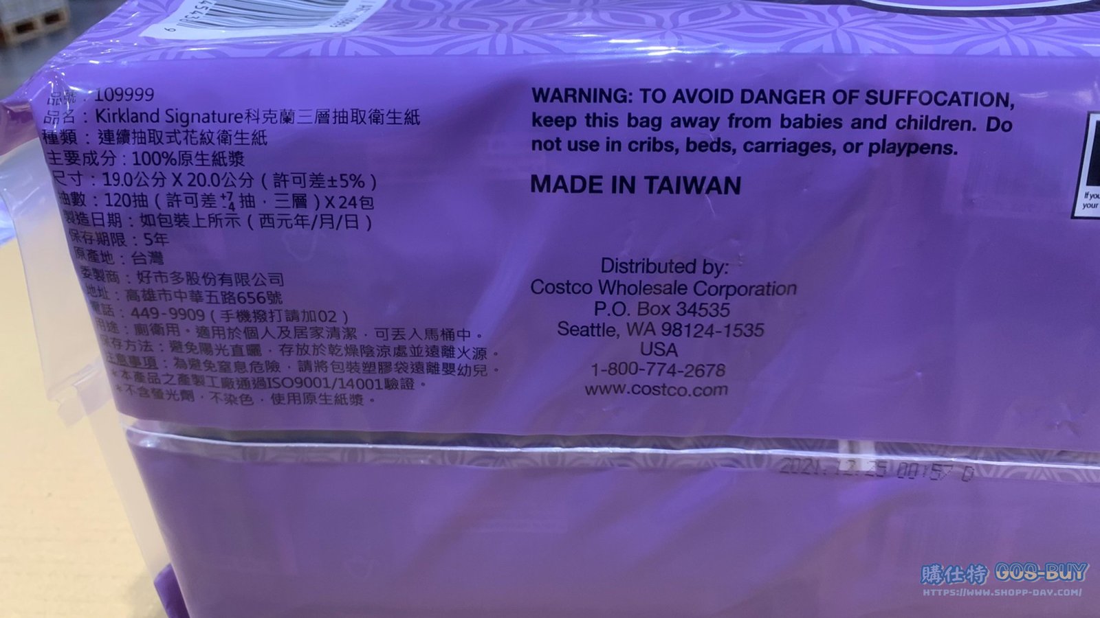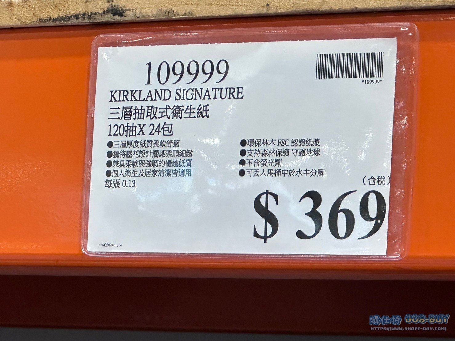家廚房與居家生活相關 科克蘭三層抽取式衛生紙#109999 By 網站小編 2022 年 3 月 3 日 824 產品資訊 產品資訊 產品名稱KIRKLAND SIGNATURE 科克蘭三層抽取式衛生紙 120抽X24包 #109999價格369產地台灣包裝規格120抽X24包保存期限五年備註兼具柔軟與韌度的溫柔質地環保林木FSC認證紙漿獨特壓花設計,觸感升級不添加螢光劑紙張強韌,不易破適用於個人衛生及居家清潔三層厚度,鬆軟舒適科克蘭衛生紙可丟入馬同中,於水中分解2022/5/5 查價價格由335元漲價為365元 漲價30元2022/7/4 查價價格由365元漲價為389元 漲價24元2024/2/9 查價價格由389元降價為369元 降價20元→商品問題回報← 相關 標籤Kirkland科克蘭衛生紙 前一篇文章聖沛黎洛寶特瓶氣泡礦泉水 1 公升X12入 #56570下一篇文章紐西蘭櫻雪櫻桃#807009 網站小編https://shopp-day.com 或許你也感興趣 價格優惠資訊 2025好市多客製生日蛋糕價格表 價格優惠資訊 好市多Line社群加入方法 保健品&藥品 新甘木堅胃腸藥顆粒40包 #194496 購仕特-CosBuy 查詢排行 價格優惠資訊 2025好市多客製生日蛋糕價格表 價格優惠資訊 好市多Line社群加入方法 保健品&藥品 新甘木堅胃腸藥顆粒40包 #194496 價格優惠資訊 2025好市多會員護照-春季專案商品一覽表 價格優惠資訊 好市多美國牛肉整箱銷售價格表(2024/5/7) 裝載更多 熱門推薦 廚房與居家生活相關 普拿疼伏冒熱飲20包 #84499 廚房與居家生活相關 DOMAINE DE LA BAUME 波姆酒莊金牌FITOU紅酒 #121971 廚房與居家生活相關 SIMON LI三人座牛皮沙發#1695608 廚房與居家生活相關 TAISHO大正胃腸藥顆粒52包 #126969 廚房與居家生活相關 IDEA NUOVA 摺疊椅 #1393843 裝載更多