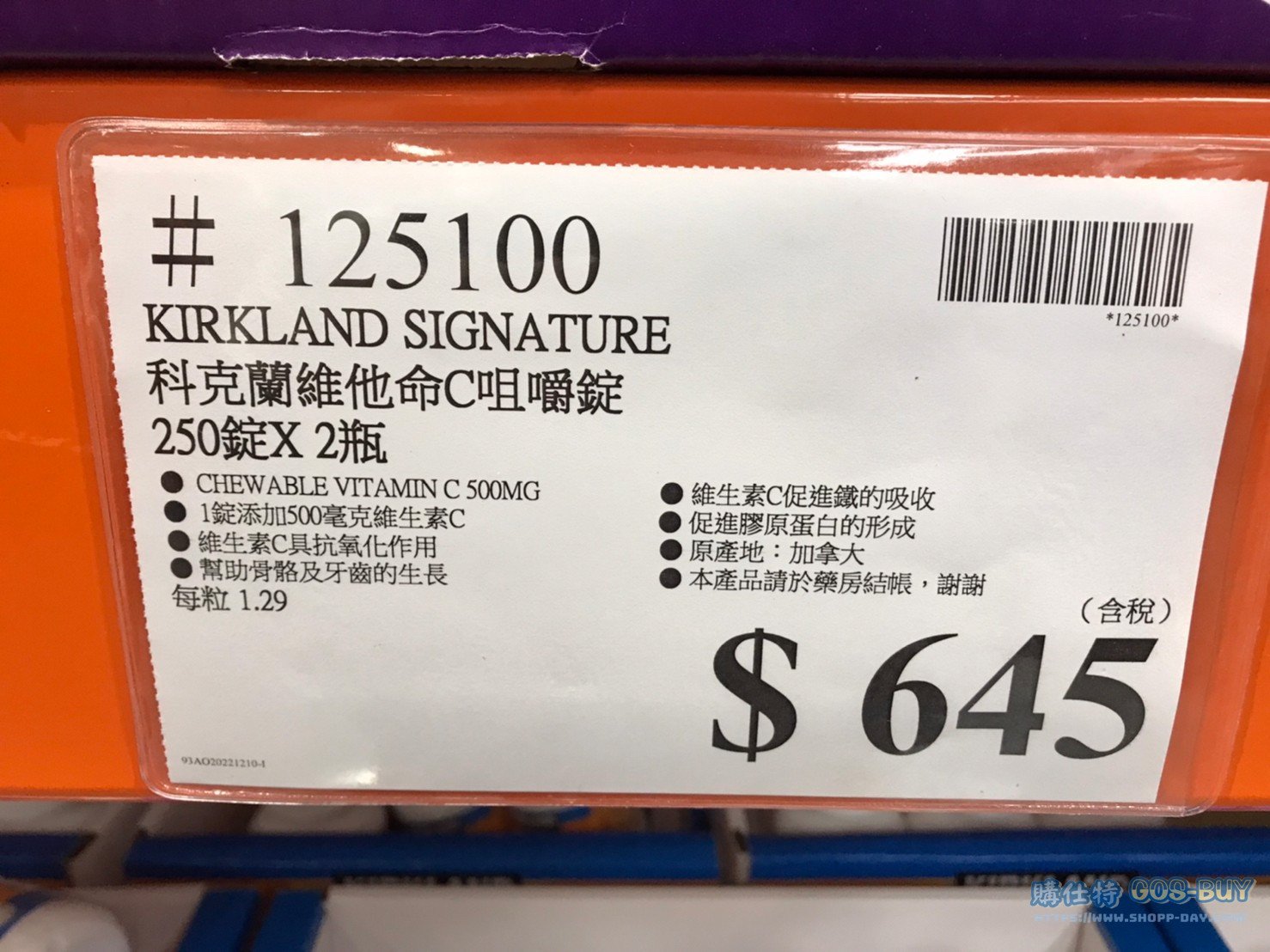 家保健品&藥品 科克蘭維他命C咀嚼錠#125100 By 網站小編 2022 年 5 月 1 日 248 產品資訊 產品資訊 產品名稱 KIRKLAND SIGNATURE 科克蘭維他命C咀嚼錠 250錠 X 2瓶 #125100 價格 645 產地 加拿大 包裝規格 250錠 X 2瓶 保存期限 依包裝所示 備註 CHEWABLE VITAMIN C 500MG1錠添加500毫克維生素 C維生素C具抗氧化作用幫助骨骼及牙齒的生長維生素C促進鐵的吸收促進膠原蛋白的形成原產地:加拿大本藥品請於藥房結帳2022/2/22查價價格由575漲價為645漲價70元 →商品問題回報← 相關 標籤Kirkland科克蘭維他命 前一篇文章LEVI’S MEN’S SS TEE 3PK 男短袖純棉上衣 亞洲尺寸:S-XL #135115下一篇文章3M NEXCARE MEDICAL MASK 醫用活性碳口罩 #333333 網站小編https://shopp-day.com 或許你也感興趣 價格優惠資訊 2025好市多客製生日蛋糕價格表 價格優惠資訊 好市多Line社群加入方法 保健品&藥品 新甘木堅胃腸藥顆粒40包 #194496 購仕特-CosBuy 查詢排行 價格優惠資訊 2025好市多客製生日蛋糕價格表 價格優惠資訊 好市多Line社群加入方法 保健品&藥品 新甘木堅胃腸藥顆粒40包 #194496 價格優惠資訊 2025好市多會員護照-春季專案商品一覽表 價格優惠資訊 好市多美國牛肉整箱銷售價格表(2024/5/7) 裝載更多 熱門推薦 保健品&藥品 新甘木堅胃腸藥顆粒40包 #194496 保健品&藥品 維骨力膠囊#36999 保健品&藥品 勝昌通骨活絡藥膠布50片 #134721 保健品&藥品 ACUVUE安視優歐舒適每日拋棄式隱形眼鏡(90片裝) #2151100~2151134 保健品&藥品 武田合利他命強效錠EX PLUS#997785 裝載更多