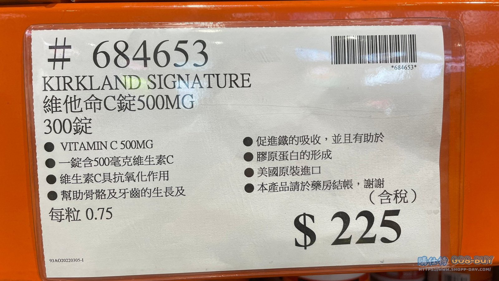 家保健品&藥品 KIRKLAND SIGNATURE 維他命C錠500MG 300錠 #684653 By 網站小編 2022 年 5 月 16 日 472 產品資訊 產品資訊 產品名稱KIRKLAND SIGNATURE 維他命C錠500MG 300錠 #684653價格225產地美國包裝規格300錠保存期限依包裝所示備註VITAMIN C 500MG一錠含500毫克維生素C維生素C具抗氧化作用幫助骨骼及牙齒生長及促進鐵的吸收並且有助於膠原蛋白的形成美國原裝進口→商品問題回報← 相關 標籤Kirkland科克蘭維他命 前一篇文章NATROL VITAMIN C 納委維生素C 1000毫克 緩釋錠200錠 #224443下一篇文章施華蔻修護洗髮乳 每瓶900毫升2瓶入 #125052 網站小編https://shopp-day.com 或許你也感興趣 價格優惠資訊 2025好市多客製生日蛋糕價格表 價格優惠資訊 好市多Line社群加入方法 保健品&藥品 新甘木堅胃腸藥顆粒40包 #194496 購仕特-CosBuy 查詢排行 價格優惠資訊 2025好市多客製生日蛋糕價格表 價格優惠資訊 好市多Line社群加入方法 保健品&藥品 新甘木堅胃腸藥顆粒40包 #194496 價格優惠資訊 2025好市多會員護照-春季專案商品一覽表 價格優惠資訊 好市多美國牛肉整箱銷售價格表(2024/5/7) 裝載更多 熱門推薦 保健品&藥品 新甘木堅胃腸藥顆粒40包 #194496 保健品&藥品 維骨力膠囊#36999 保健品&藥品 勝昌通骨活絡藥膠布50片 #134721 保健品&藥品 ACUVUE安視優歐舒適每日拋棄式隱形眼鏡(90片裝) #2151100~2151134 保健品&藥品 武田合利他命強效錠EX PLUS#997785 裝載更多