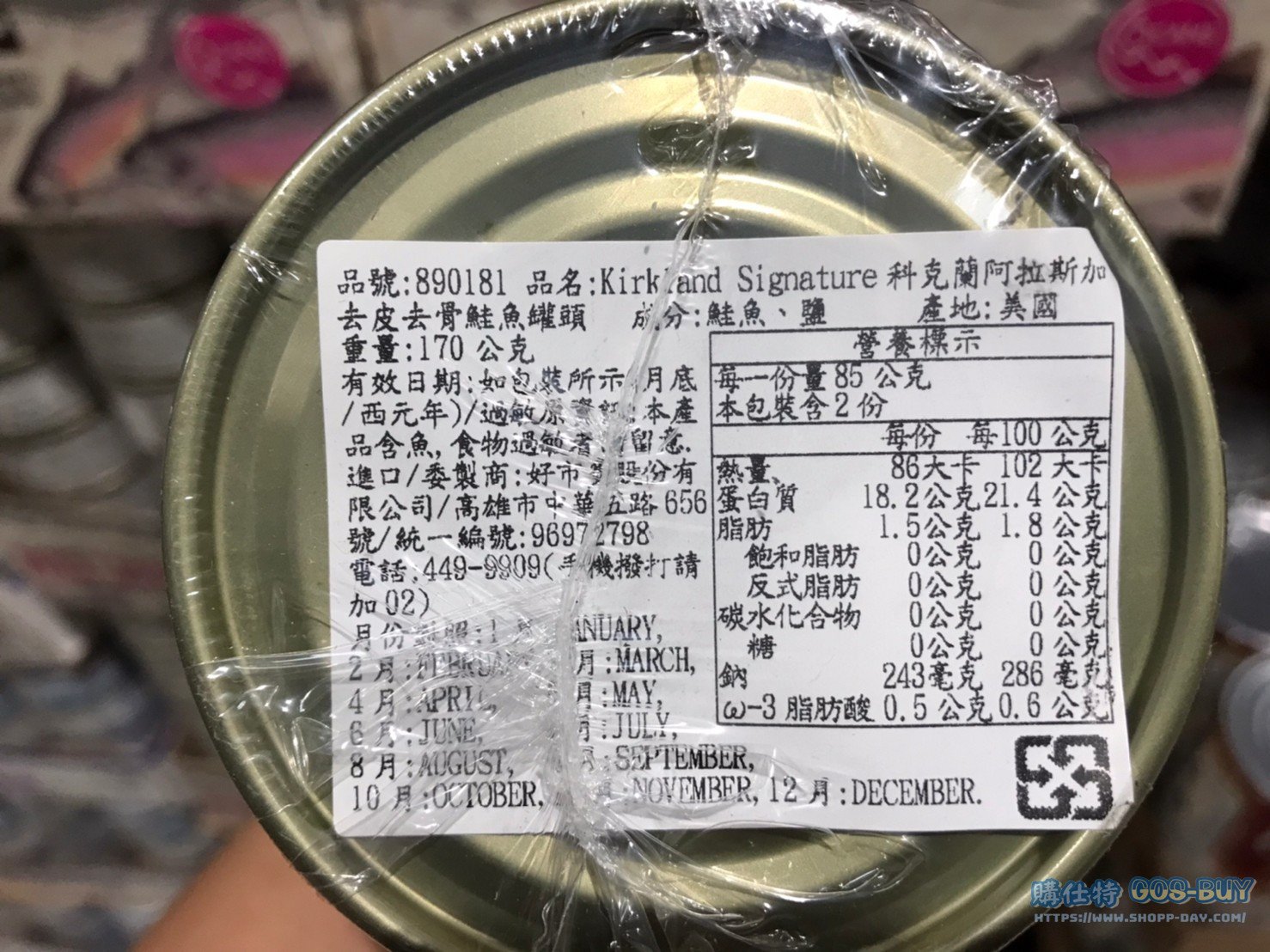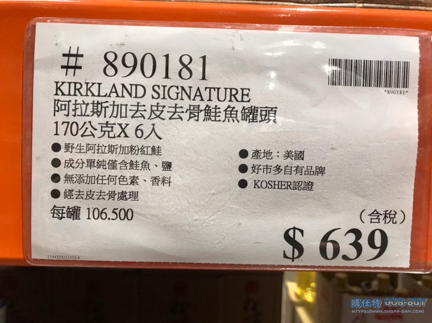 家食品麵包類真空食品 KIRKLAND SIGNATURE 阿拉斯加去皮去骨鮭魚罐頭 #890181 By 網站小編 2022 年 4 月 18 日 392 產品資訊 產品資訊 產品名稱KIRKLAND SIGNATURE 阿拉斯加去皮去骨鮭魚罐頭 170公克 X 6入 #890181價格639產地美國包裝規格170公克 X 6入保存期限依包裝所示備註野生阿拉斯加粉紅鮭成分單純僅含鮭魚、鹽無添加任何色素、香料經去皮去骨處理產地:美國好市多自有品牌 KOSHER認證→商品問題回報← 相關 標籤Kirkland科克蘭鮭魚 前一篇文章HEINZ WHITE VINEGAR蒸餾白醋 3.78公升 X 2瓶入 #151214下一篇文章KIRKLAND SIGNATURE TUNA 鮪魚罐頭 198公克 X 8入 #546787 網站小編https://shopp-day.com 或許你也感興趣 價格優惠資訊 2025好市多客製生日蛋糕價格表 價格優惠資訊 好市多Line社群加入方法 保健品&藥品 新甘木堅胃腸藥顆粒40包 #194496 購仕特-CosBuy 查詢排行 價格優惠資訊 2025好市多客製生日蛋糕價格表 價格優惠資訊 好市多Line社群加入方法 保健品&藥品 新甘木堅胃腸藥顆粒40包 #194496 價格優惠資訊 2025好市多會員護照-春季專案商品一覽表 價格優惠資訊 好市多美國牛肉整箱銷售價格表(2024/5/7) 裝載更多 熱門推薦 價格優惠資訊 2025好市多客製生日蛋糕價格表 價格優惠資訊 好市多美國牛肉整箱銷售價格表(2024/5/7) 價格優惠資訊 好市多日本和牛價格表 2024.4.29更新 冷藏食品 美國特選無骨牛小排火鍋片#25737 冷藏食品 舊振南英式馬芬米福堡#143387 裝載更多