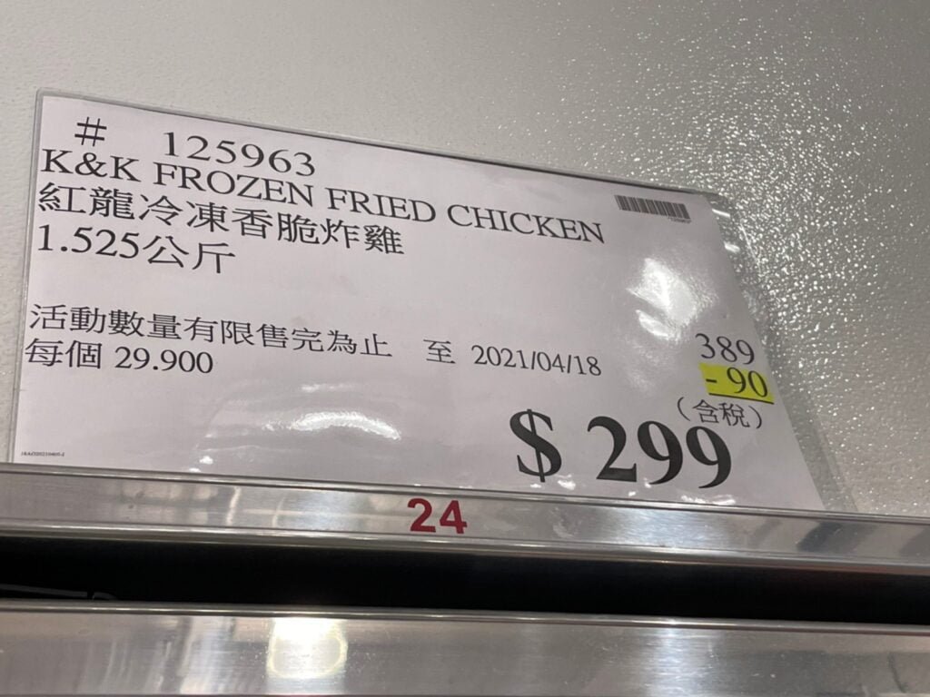 家食品麵包類冷凍食品 K&K FROZEN FRIED CHICKEN 紅龍冷凍香脆炸雞 1.525公斤 #125963 By 網站小編 2021 年 11 月 1 日 277 產品資訊 產品資訊 產品名稱 K&K FROZEN FRIED CHICKEN 紅龍冷凍香脆炸雞 1.525公斤 #125963 價格 389 產地 台灣 包裝規格 炸棒腿 5支 + 炸腿排 5片 / 袋 1.525公斤 保存期限 3年 備註 →商品問題回報← 相關 標籤炸雞紅龍 前一篇文章PASTA PRIMA 冷凍綜合起司菠菜陷餃 #229644下一篇文章PHIL ADELPHIA 奶油乾酪原味250GX2PK #102680 網站小編https://shopp-day.com 或許你也感興趣 價格優惠資訊 2025好市多客製生日蛋糕價格表 價格優惠資訊 好市多Line社群加入方法 保健品&藥品 新甘木堅胃腸藥顆粒40包 #194496 購仕特-CosBuy 查詢排行 價格優惠資訊 2025好市多客製生日蛋糕價格表 價格優惠資訊 好市多Line社群加入方法 保健品&藥品 新甘木堅胃腸藥顆粒40包 #194496 價格優惠資訊 2025好市多會員護照-春季專案商品一覽表 價格優惠資訊 好市多美國牛肉整箱銷售價格表(2024/5/7) 裝載更多 熱門推薦 價格優惠資訊 2025好市多客製生日蛋糕價格表 價格優惠資訊 好市多美國牛肉整箱銷售價格表(2024/5/7) 價格優惠資訊 好市多日本和牛價格表 2024.4.29更新 冷藏食品 美國特選無骨牛小排火鍋片#25737 冷藏食品 舊振南英式馬芬米福堡#143387 裝載更多
