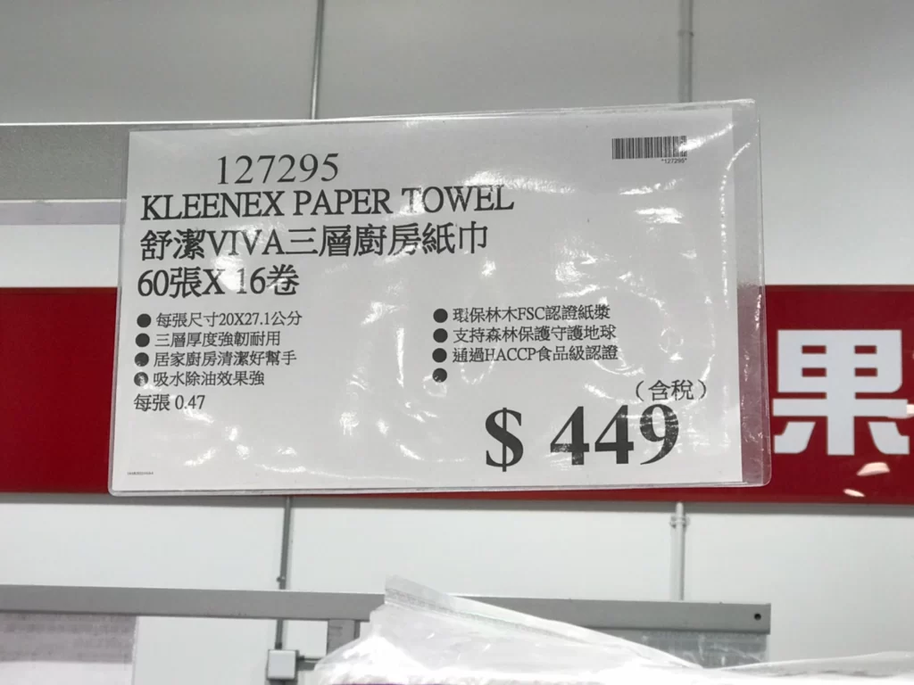 家廚房與居家生活相關 舒潔VIVA三層廚房紙巾 #127295 By 網站小編 2021 年 11 月 16 日 363 產品資訊 產品資訊 產品名稱KLEENEX PAPER TOWEL 舒潔VIVA三層廚房紙巾 60張X16卷 #127295價格449產地台灣包裝規格60張X16捲保存期限依包裝所示備註每張尺寸20X27.1公分三層厚度強韌使用居家廚房清潔好幫手吸水除油效果強環保林木FSC認證紙漿支持森林保護守護地球通過HACCP食品級認證2022/10/14查價價格由419漲價為449漲價30元→商品問題回報← 相關 標籤廚房紙巾紙巾舒潔餐巾紙 前一篇文章KLEENEX ROLL BATH TISSUE 舒潔捲筒衛生紙 380張X30卷 #127193下一篇文章POCKY格力高杏仁巧克力棒 46.2公克X6入 #128581 網站小編https://shopp-day.com 或許你也感興趣 價格優惠資訊 2025好市多客製生日蛋糕價格表 價格優惠資訊 好市多Line社群加入方法 保健品&藥品 新甘木堅胃腸藥顆粒40包 #194496 購仕特-CosBuy 查詢排行 價格優惠資訊 2025好市多客製生日蛋糕價格表 價格優惠資訊 好市多Line社群加入方法 保健品&藥品 新甘木堅胃腸藥顆粒40包 #194496 價格優惠資訊 2025好市多會員護照-春季專案商品一覽表 價格優惠資訊 好市多美國牛肉整箱銷售價格表(2024/5/7) 裝載更多 熱門推薦 廚房與居家生活相關 普拿疼伏冒熱飲20包 #84499 廚房與居家生活相關 DOMAINE DE LA BAUME 波姆酒莊金牌FITOU紅酒 #121971 廚房與居家生活相關 SIMON LI三人座牛皮沙發#1695608 廚房與居家生活相關 TAISHO大正胃腸藥顆粒52包 #126969 廚房與居家生活相關 IDEA NUOVA 摺疊椅 #1393843 裝載更多