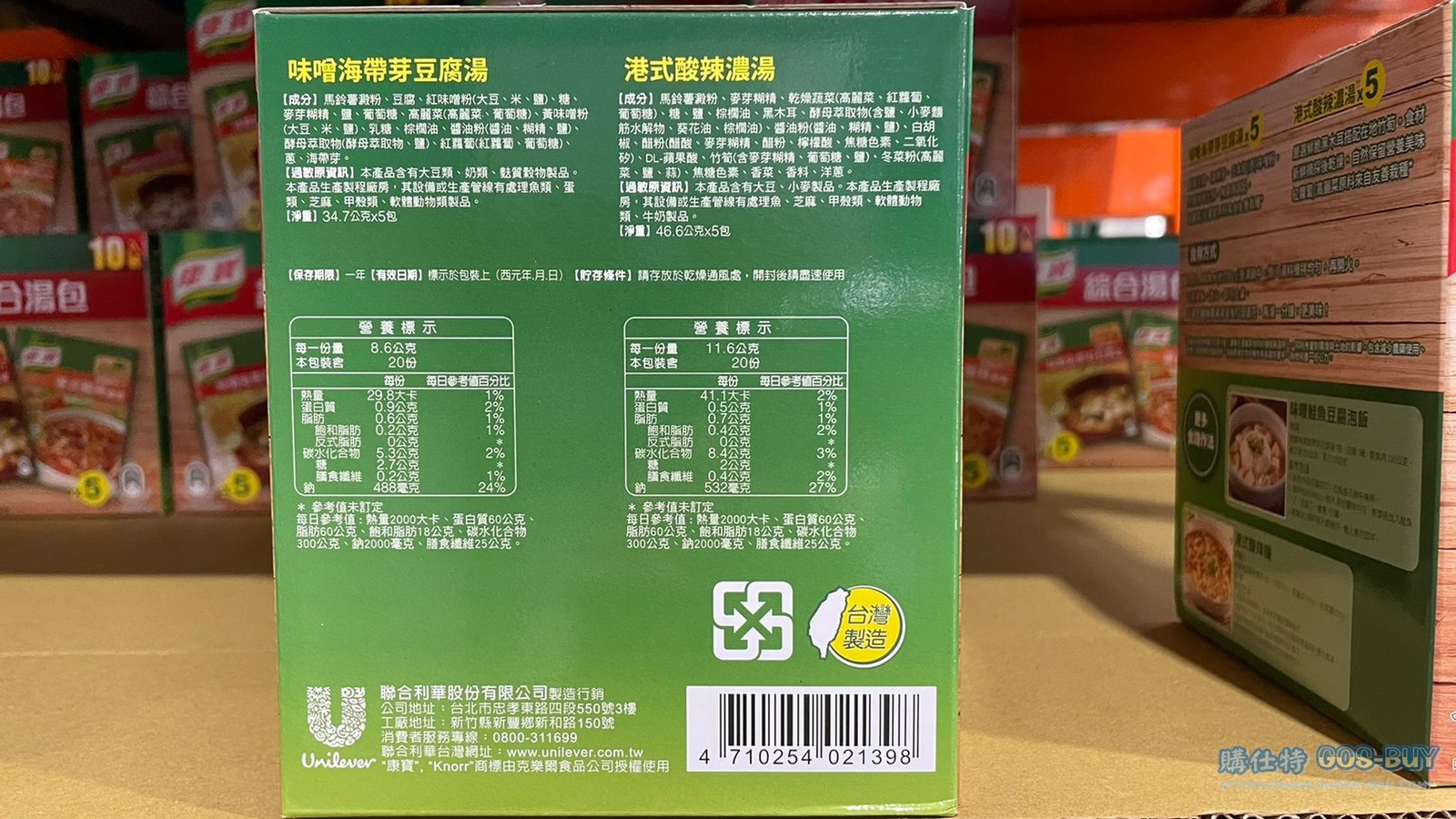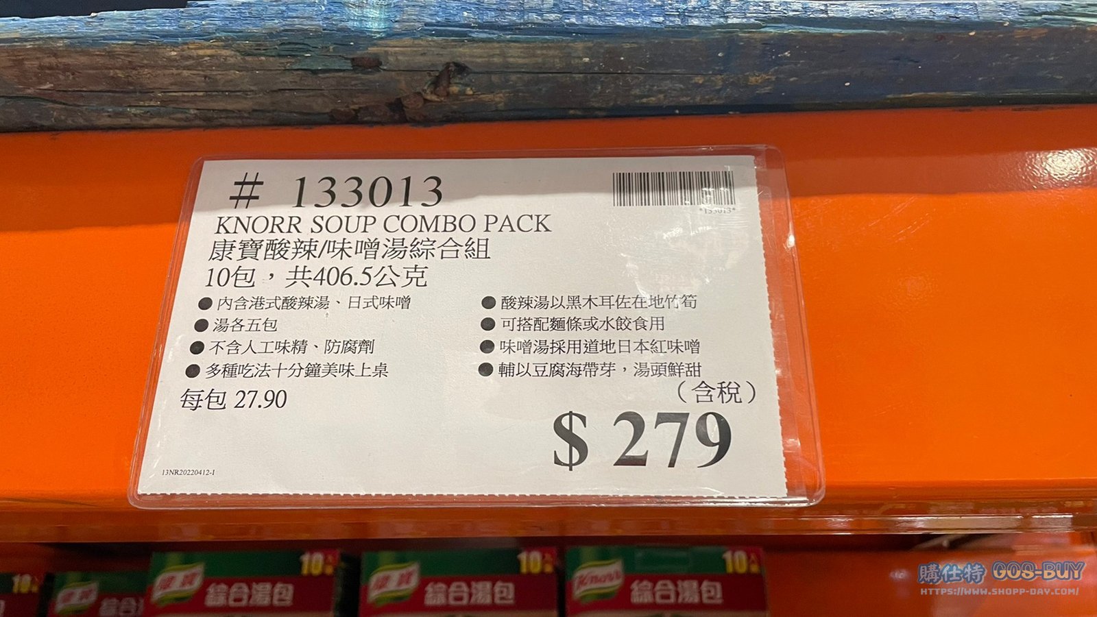 家食品麵包類調味料 KNORR SOUP COMBO PACK 康寶酸辣/味噌湯綜合組 #133013 By 網站小編 2022 年 5 月 12 日 127 產品資訊 產品資訊 產品名稱KNORR SOUP COMBO PACK 康寶酸辣/味噌湯綜合組 10包 共406.5公克 #133013價格279產地台灣包裝規格酸辣湯X5 / 味噌湯X5保存期限一年備註內含港式酸辣湯、日式味噌湯各五包不含人工味精、防腐劑多種吃法十分鐘美味上桌酸辣湯以黑木耳佐在地竹筍可搭配麵條或水餃食用味噌湯採用道地日本紅味噌輔以豆腐海帶芽,湯頭鮮甜→商品問題回報← 相關 標籤味噌康寶港式酸辣湯 前一篇文章FRENATURE富紐翠藍莓凍乾#132553下一篇文章KIRKLAND SIGNATURE 科克蘭杏仁粉 1.36公斤 #1178969 網站小編https://shopp-day.com 或許你也感興趣 價格優惠資訊 2025好市多客製生日蛋糕價格表 價格優惠資訊 好市多Line社群加入方法 保健品&藥品 新甘木堅胃腸藥顆粒40包 #194496 購仕特-CosBuy 查詢排行 價格優惠資訊 2025好市多客製生日蛋糕價格表 價格優惠資訊 好市多Line社群加入方法 保健品&藥品 新甘木堅胃腸藥顆粒40包 #194496 價格優惠資訊 2025好市多會員護照-春季專案商品一覽表 價格優惠資訊 好市多美國牛肉整箱銷售價格表(2024/5/7) 裝載更多 熱門推薦 價格優惠資訊 2025好市多客製生日蛋糕價格表 價格優惠資訊 好市多美國牛肉整箱銷售價格表(2024/5/7) 價格優惠資訊 好市多日本和牛價格表 2024.4.29更新 冷藏食品 美國特選無骨牛小排火鍋片#25737 冷藏食品 舊振南英式馬芬米福堡#143387 裝載更多