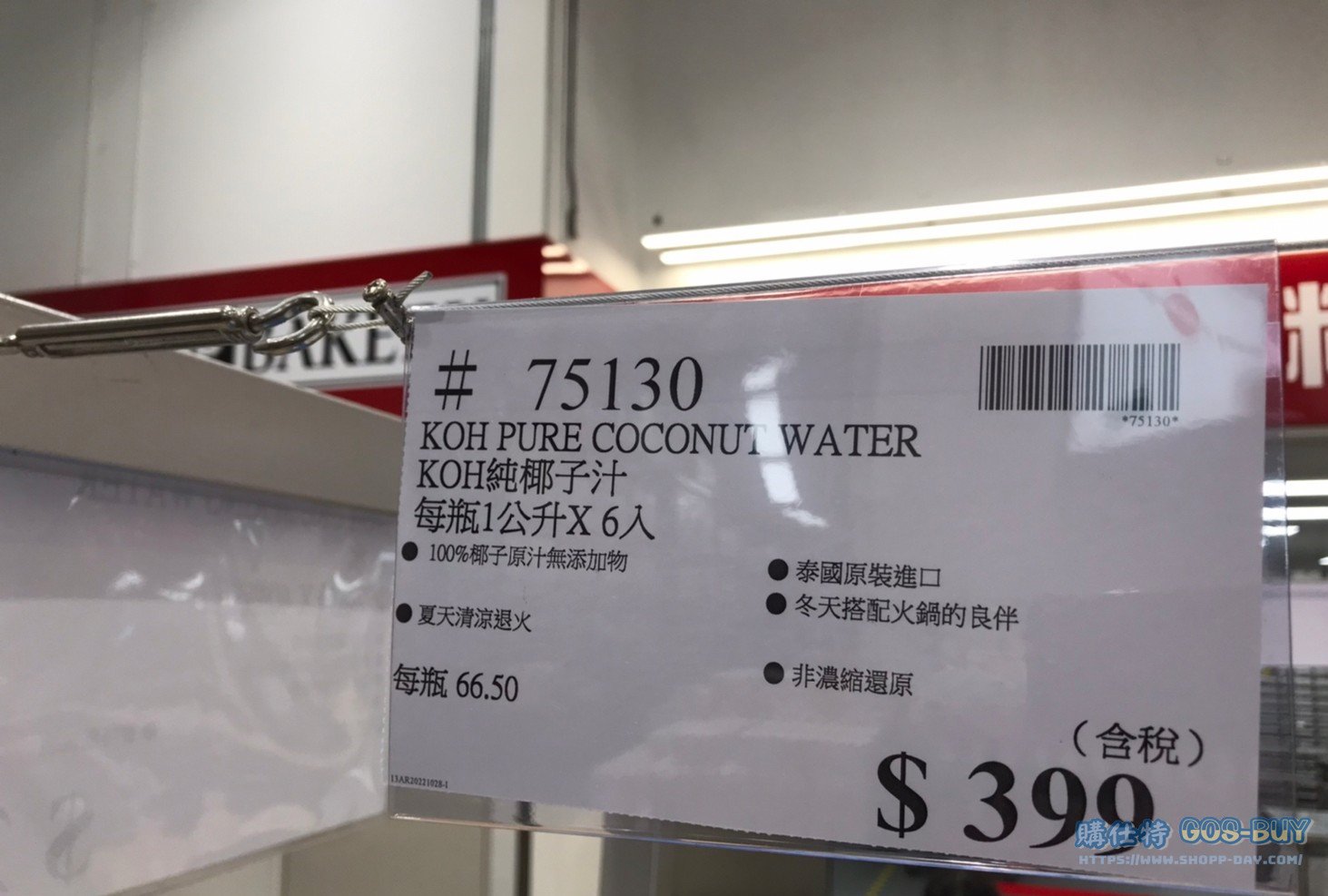 家零食&飲料 KOH 純椰子汁 #75130 By 網站小編 2021 年 12 月 10 日 377 產品資訊 產品資訊 產品名稱KOH PURE COCONUT WATER KOH 純椰子汁 每瓶1公升X6入 #75130價格399產地泰國包裝規格每瓶1公升X6入保存期限不適用備註100%椰子原汁無添加物夏天清涼退火泰國原裝進口冬天搭配火鍋的良伴非濃縮還原→商品問題回報← 相關 標籤KOH椰子椰子水 前一篇文章元進莊冷凍麻油雞1.2公斤X2包 #134089下一篇文章MONBANA 三合一極品可可 #116570 網站小編https://shopp-day.com 或許你也感興趣 價格優惠資訊 2025好市多客製生日蛋糕價格表 價格優惠資訊 好市多Line社群加入方法 保健品&藥品 新甘木堅胃腸藥顆粒40包 #194496 購仕特-CosBuy 查詢排行 價格優惠資訊 2025好市多客製生日蛋糕價格表 價格優惠資訊 好市多Line社群加入方法 保健品&藥品 新甘木堅胃腸藥顆粒40包 #194496 價格優惠資訊 2025好市多會員護照-春季專案商品一覽表 價格優惠資訊 好市多美國牛肉整箱銷售價格表(2024/5/7) 裝載更多 熱門推薦 美國零食 科克蘭葡萄乾巧克力#959987 冷藏飲品 BLUE DIAMOND 無糖原味杏仁飲1.89L #129794 西班牙零食 MR.BROWNIE 巧克力布郎尼#153753 泰國零食 A&R牛奶巧克力迷你甜筒餅乾#1744884 比利時零食 科克蘭烈酒與波特酒巧克力 #1351451 裝載更多