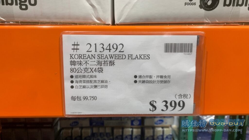 家食品麵包類調味料 KOREAN SEAWEED FLAKES 韓味不二海苔酥 80公克X4袋 #213492 By 網站小編 2022 年 1 月 30 日 223 產品資訊 產品資訊 產品名稱KOREAN SEAWEED FLAKES 韓味不二海苔酥 80公克X4袋 #213492價格399產地台灣包裝規格80公克*4袋保存期限依包裝所示備註 道地韓式風味 適合拌飯、拌麵使用 →商品問題回報← 相關 標籤海苔海苔粉 前一篇文章LH BREAD FLOUR 1KG*3 高筋麵粉 1公斤*3包 #100997下一篇文章BARCALOUNGER RECLINER 牛皮電動躺椅 寬91深104高103公分 #1518037 網站小編https://shopp-day.com 或許你也感興趣 價格優惠資訊 2025好市多客製生日蛋糕價格表 價格優惠資訊 好市多Line社群加入方法 保健品&藥品 新甘木堅胃腸藥顆粒40包 #194496 購仕特-CosBuy 查詢排行 價格優惠資訊 2025好市多客製生日蛋糕價格表 價格優惠資訊 好市多Line社群加入方法 保健品&藥品 新甘木堅胃腸藥顆粒40包 #194496 價格優惠資訊 2025好市多會員護照-春季專案商品一覽表 價格優惠資訊 好市多美國牛肉整箱銷售價格表(2024/5/7) 裝載更多 熱門推薦 價格優惠資訊 2025好市多客製生日蛋糕價格表 價格優惠資訊 好市多美國牛肉整箱銷售價格表(2024/5/7) 價格優惠資訊 好市多日本和牛價格表 2024.4.29更新 冷藏食品 美國特選無骨牛小排火鍋片#25737 冷藏食品 舊振南英式馬芬米福堡#143387 裝載更多