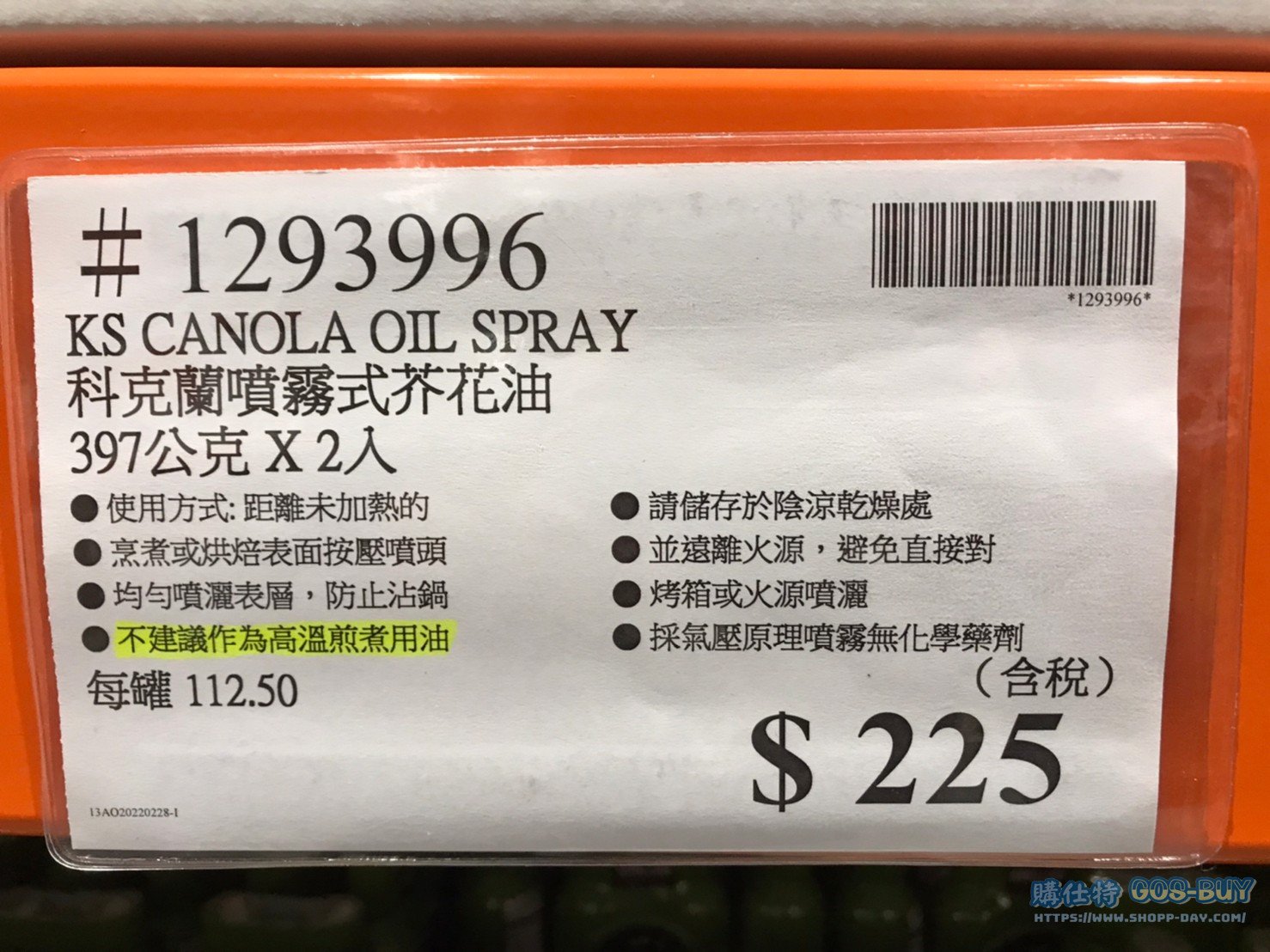 家食品麵包類調味料 KS CANOLA OIL SPRAY 科克蘭噴霧式芥花油 397公克X2入 #1293996 By 網站小編 2021 年 11 月 8 日 408 產品資訊 產品資訊 產品名稱KS CANOLA OIL SPRAY 科克蘭噴霧式芥花油 397公克X2入 #1293996價格225產地美國包裝規格 397公克X2入 每罐104.500元保存期限依包裝所示備註使用方式:距離未加熱的烹煮或烘焙表面按壓噴頭均勻噴灑表層,防止沾鍋不建議作為高溫煎煮用油請儲存於陰涼乾燥處並遠離火源,避免直接對烤箱或火源噴灑採氣壓原理噴霧無化學藥劑2022/4/13查價後 原價209 價格更改為225 價格漲價16元→商品問題回報← 相關 標籤Kirkland科克蘭芥花油 前一篇文章32 DEGREES 兒童保暖衣褲組 #1307826下一篇文章NATURE’S奇亞籽(鼠尾草籽)#582057 網站小編https://shopp-day.com 或許你也感興趣 價格優惠資訊 2025好市多客製生日蛋糕價格表 價格優惠資訊 好市多Line社群加入方法 保健品&藥品 新甘木堅胃腸藥顆粒40包 #194496 購仕特-CosBuy 查詢排行 價格優惠資訊 2025好市多客製生日蛋糕價格表 價格優惠資訊 好市多Line社群加入方法 保健品&藥品 新甘木堅胃腸藥顆粒40包 #194496 價格優惠資訊 2025好市多會員護照-春季專案商品一覽表 價格優惠資訊 好市多美國牛肉整箱銷售價格表(2024/5/7) 裝載更多 熱門推薦 價格優惠資訊 2025好市多客製生日蛋糕價格表 價格優惠資訊 好市多美國牛肉整箱銷售價格表(2024/5/7) 價格優惠資訊 好市多日本和牛價格表 2024.4.29更新 冷藏食品 美國特選無骨牛小排火鍋片#25737 冷藏食品 舊振南英式馬芬米福堡#143387 裝載更多
