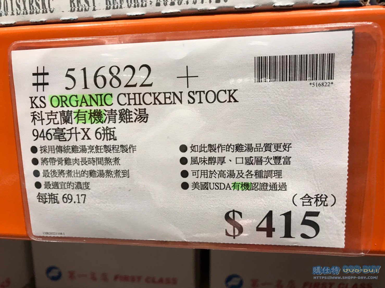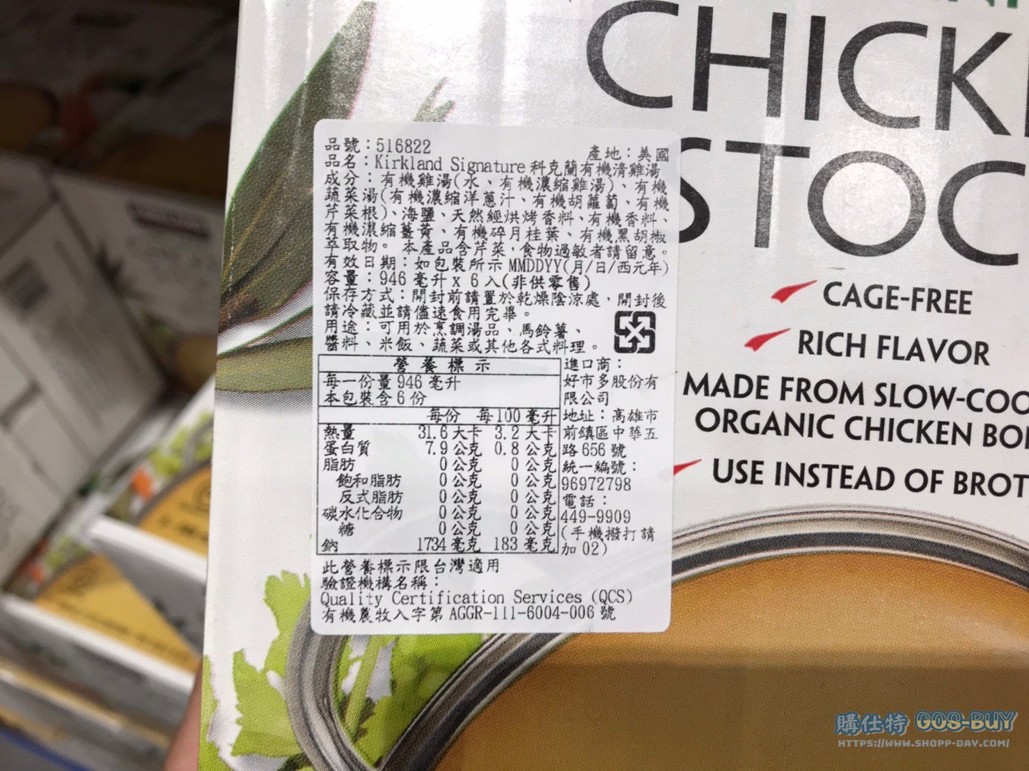 家食品麵包類調味料 科克蘭有機清雞湯 #516822 By 網站小編 2022 年 2 月 15 日 268 產品資訊 產品資訊 產品名稱 KS ORGANIC CHICKEN STOCK 科克蘭有機清雞湯 946毫克X6瓶 #516822 價格 415 產地 美國 包裝規格 946毫克X6瓶 保存期限 依包裝所示 備註 採用傳統雞湯烹飪製程製作將帶骨雞肉長時間熬煮最後將煮出的雞湯熬煮到最適宜的濃度如此製作的雞湯品質更好風味醇厚 口感層次豐富可用於高湯及各種調理美國USDA有機認證通過 →商品問題回報← 相關 標籤Kirkland科克蘭雞湯高湯 前一篇文章園果園味烏梅洛神雪花酥400公克 #130490下一篇文章SWANSON CHICKEN BROTH 史雲生清雞湯 每瓶907毫升X6罐入 #127673 網站小編https://shopp-day.com 或許你也感興趣 價格優惠資訊 2025好市多客製生日蛋糕價格表 價格優惠資訊 好市多Line社群加入方法 保健品&藥品 新甘木堅胃腸藥顆粒40包 #194496 購仕特-CosBuy 查詢排行 價格優惠資訊 2025好市多客製生日蛋糕價格表 價格優惠資訊 好市多Line社群加入方法 保健品&藥品 新甘木堅胃腸藥顆粒40包 #194496 價格優惠資訊 2025好市多會員護照-春季專案商品一覽表 價格優惠資訊 好市多美國牛肉整箱銷售價格表(2024/5/7) 裝載更多 熱門推薦 價格優惠資訊 2025好市多客製生日蛋糕價格表 價格優惠資訊 好市多美國牛肉整箱銷售價格表(2024/5/7) 價格優惠資訊 好市多日本和牛價格表 2024.4.29更新 冷藏食品 美國特選無骨牛小排火鍋片#25737 冷藏食品 舊振南英式馬芬米福堡#143387 裝載更多