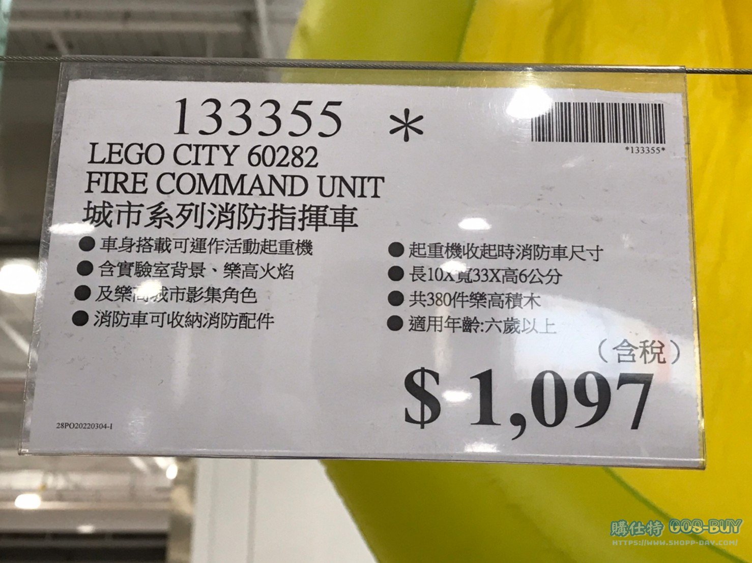 家玩具應景裝飾類小孩玩具 LEGO CITY 60282 FIRE COMMAND UNIT 城市系列消防指揮車 #133355 By 網站小編 2022 年 4 月 6 日 234 產品資訊 產品資訊 產品名稱LEGO CITY 60282 FIRE COMMAND UNIT 城市系列消防指揮車 #133355價格1097產地中國包裝規格一組(型號:60282 共380件樂高積木)保存期限N/A備註車身搭載可運作活動起重機含實驗室背景、樂高火焰及樂高城市影集角色消防車可收納消防配件起重機收起時消防車尺寸長10 X 寬33 X 高6公分共380件樂高積木適用年齡:六歲以上→商品問題回報← 相關 標籤LEGO樂高玩具車 前一篇文章HOT WHEELS MARIOKART GLIDER BUNDLE 風火輪瑪莉歐經典賽車組 #135080下一篇文章INTEX DINO PLAY CENTER 恐龍樂園戲水池 #2621040 網站小編https://shopp-day.com 或許你也感興趣 價格優惠資訊 2025好市多客製生日蛋糕價格表 價格優惠資訊 好市多Line社群加入方法 保健品&藥品 新甘木堅胃腸藥顆粒40包 #194496 購仕特-CosBuy 查詢排行 價格優惠資訊 2025好市多客製生日蛋糕價格表 價格優惠資訊 好市多Line社群加入方法 保健品&藥品 新甘木堅胃腸藥顆粒40包 #194496 價格優惠資訊 2025好市多會員護照-春季專案商品一覽表 價格優惠資訊 好市多美國牛肉整箱銷售價格表(2024/5/7) 裝載更多 熱門推薦 小孩玩具 LILFANT 雙面遊戲地墊 韓國製 #218570 應景裝飾 8FT LED NUTCRACKER 8呎LED胡桃鉗士兵 長65寬65高244公分 #1486943 應景裝飾 J’ADORE花園多肉治癒系列#139640 健身用品 PARKLON DUAL CUSHION MAT 雙層遊戲軟墊 #635029 應景裝飾 DISNEY TABLE CAROLER 米奇與米妮聖誕音樂裝飾 長31X寬20X高39公分 #1486471 裝載更多